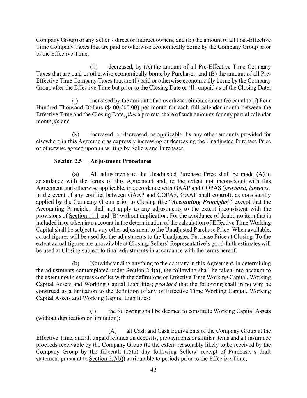 42 Company Group) or any Seller’s direct or indirect owners, and (B) the amount of all Post-Effective Time Company Taxes that are paid or otherwise economically borne by the Company Group prior to the Effective Time; (ii) decreased, by (A) the amount of all Pre-Effective Time Company Taxes that are paid or otherwise economically borne by Purchaser, and (B) the amount of all Pre- Effective Time Company Taxes that are (I) paid or otherwise economically borne by the Company Group after the Effective Time but prior to the Closing Date or (II) unpaid as of the Closing Date; (j) increased by the amount of an overhead reimbursement fee equal to (i) Four Hundred Thousand Dollars ($400,000.00) per month for each full calendar month between the Effective Time and the Closing Date, plus a pro rata share of such amounts for any partial calendar month(s); and (k) increased, or decreased, as applicable, by any other amounts provided for elsewhere in this Agreement as expressly increasing or decreasing the Unadjusted Purchase Price or otherwise agreed upon in writing by Sellers and Purchaser. Section 2.5 Adjustment Procedures. (a) All adjustments to the Unadjusted Purchase Price shall be made (A) in accordance with the terms of this Agreement and, to the extent not inconsistent with this Agreement and otherwise applicable, in accordance with GAAP and COPAS (provided, however, in the event of any conflict between GAAP and COPAS, GAAP shall control), as consistently applied by the Company Group prior to Closing (the “Accounting Principles”) except that the Accounting Principles shall not apply to any adjustments to the extent inconsistent with the provisions of Section 11.1 and (B) without duplication. For the avoidance of doubt, no item that is included in or taken into account in the determination of the calculation of Effective Time Working Capital shall be subject to any other adjustment to the Unadjusted Purchase Price. When available, actual figures will be used for the adjustments to the Unadjusted Purchase Price at Closing. To the extent actual figures are unavailable at Closing, Sellers’ Representative’s good-faith estimates will be used at Closing subject to final adjustments in accordance with the terms hereof. (b) Notwithstanding anything to the contrary in this Agreement, in determining the adjustments contemplated under Section 2.4(a), the following shall be taken into account to the extent not in express conflict with the definitions of Effective Time Working Capital, Working Capital Assets and Working Capital Liabilities; provided that the following shall in no way be construed as a limitation to the definition of any of Effective Time Working Capital, Working Capital Assets and Working Capital Liabilities: (i) the following shall be deemed to constitute Working Capital Assets (without duplication or limitation): (A) all Cash and Cash Equivalents of the Company Group at the Effective Time, and all unpaid refunds on deposits, prepayments or similar items and all insurance proceeds receivable by the Company Group (to the extent reasonably likely to be received by the Company Group by the fifteenth (15th) day following Sellers’ receipt of Purchaser’s draft statement pursuant to Section 2.7(b)) attributable to periods prior to the Effective Time;
