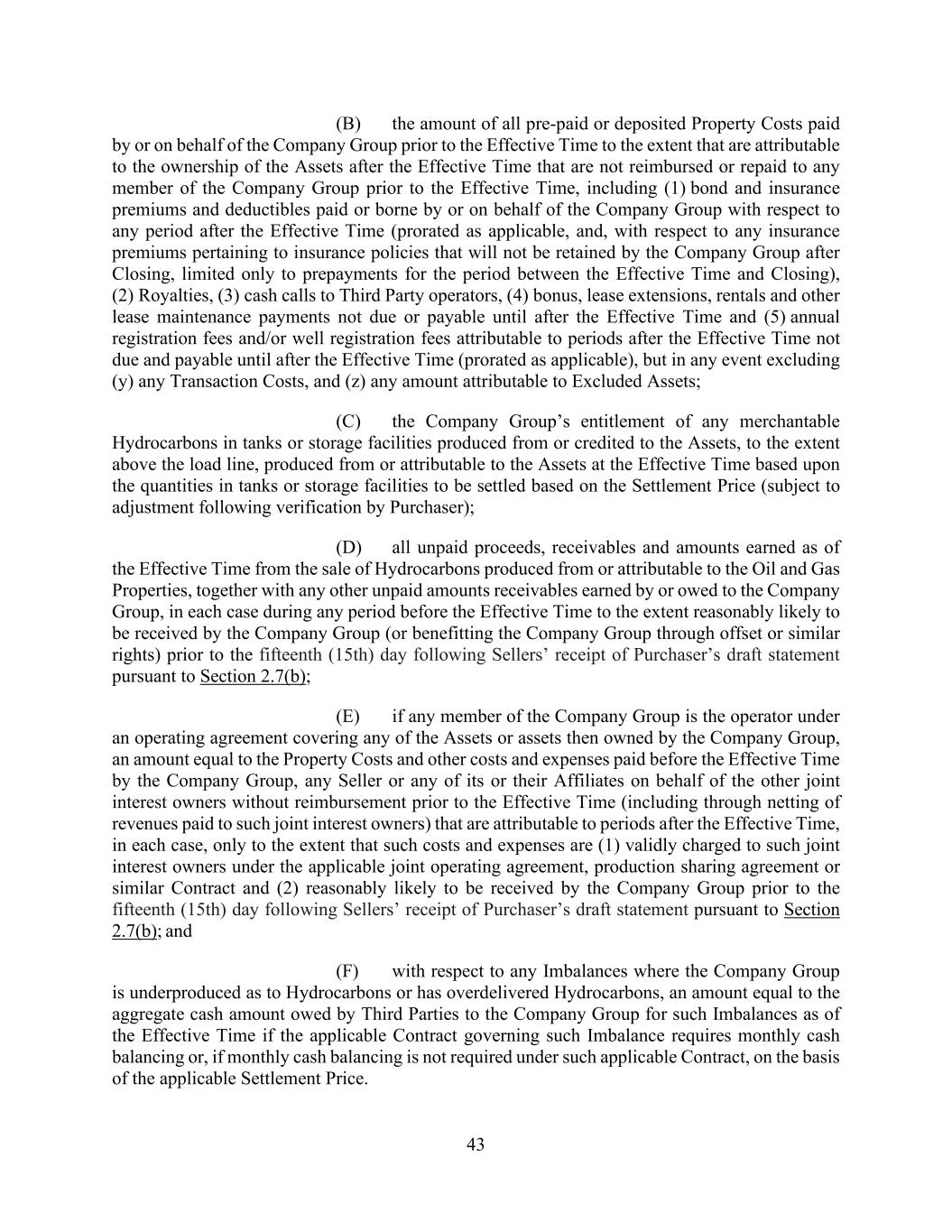 43 (B) the amount of all pre-paid or deposited Property Costs paid by or on behalf of the Company Group prior to the Effective Time to the extent that are attributable to the ownership of the Assets after the Effective Time that are not reimbursed or repaid to any member of the Company Group prior to the Effective Time, including (1) bond and insurance premiums and deductibles paid or borne by or on behalf of the Company Group with respect to any period after the Effective Time (prorated as applicable, and, with respect to any insurance premiums pertaining to insurance policies that will not be retained by the Company Group after Closing, limited only to prepayments for the period between the Effective Time and Closing), (2) Royalties, (3) cash calls to Third Party operators, (4) bonus, lease extensions, rentals and other lease maintenance payments not due or payable until after the Effective Time and (5) annual registration fees and/or well registration fees attributable to periods after the Effective Time not due and payable until after the Effective Time (prorated as applicable), but in any event excluding (y) any Transaction Costs, and (z) any amount attributable to Excluded Assets; (C) the Company Group’s entitlement of any merchantable Hydrocarbons in tanks or storage facilities produced from or credited to the Assets, to the extent above the load line, produced from or attributable to the Assets at the Effective Time based upon the quantities in tanks or storage facilities to be settled based on the Settlement Price (subject to adjustment following verification by Purchaser); (D) all unpaid proceeds, receivables and amounts earned as of the Effective Time from the sale of Hydrocarbons produced from or attributable to the Oil and Gas Properties, together with any other unpaid amounts receivables earned by or owed to the Company Group, in each case during any period before the Effective Time to the extent reasonably likely to be received by the Company Group (or benefitting the Company Group through offset or similar rights) prior to the fifteenth (15th) day following Sellers’ receipt of Purchaser’s draft statement pursuant to Section 2.7(b); (E) if any member of the Company Group is the operator under an operating agreement covering any of the Assets or assets then owned by the Company Group, an amount equal to the Property Costs and other costs and expenses paid before the Effective Time by the Company Group, any Seller or any of its or their Affiliates on behalf of the other joint interest owners without reimbursement prior to the Effective Time (including through netting of revenues paid to such joint interest owners) that are attributable to periods after the Effective Time, in each case, only to the extent that such costs and expenses are (1) validly charged to such joint interest owners under the applicable joint operating agreement, production sharing agreement or similar Contract and (2) reasonably likely to be received by the Company Group prior to the fifteenth (15th) day following Sellers’ receipt of Purchaser’s draft statement pursuant to Section 2.7(b); and (F) with respect to any Imbalances where the Company Group is underproduced as to Hydrocarbons or has overdelivered Hydrocarbons, an amount equal to the aggregate cash amount owed by Third Parties to the Company Group for such Imbalances as of the Effective Time if the applicable Contract governing such Imbalance requires monthly cash balancing or, if monthly cash balancing is not required under such applicable Contract, on the basis of the applicable Settlement Price.