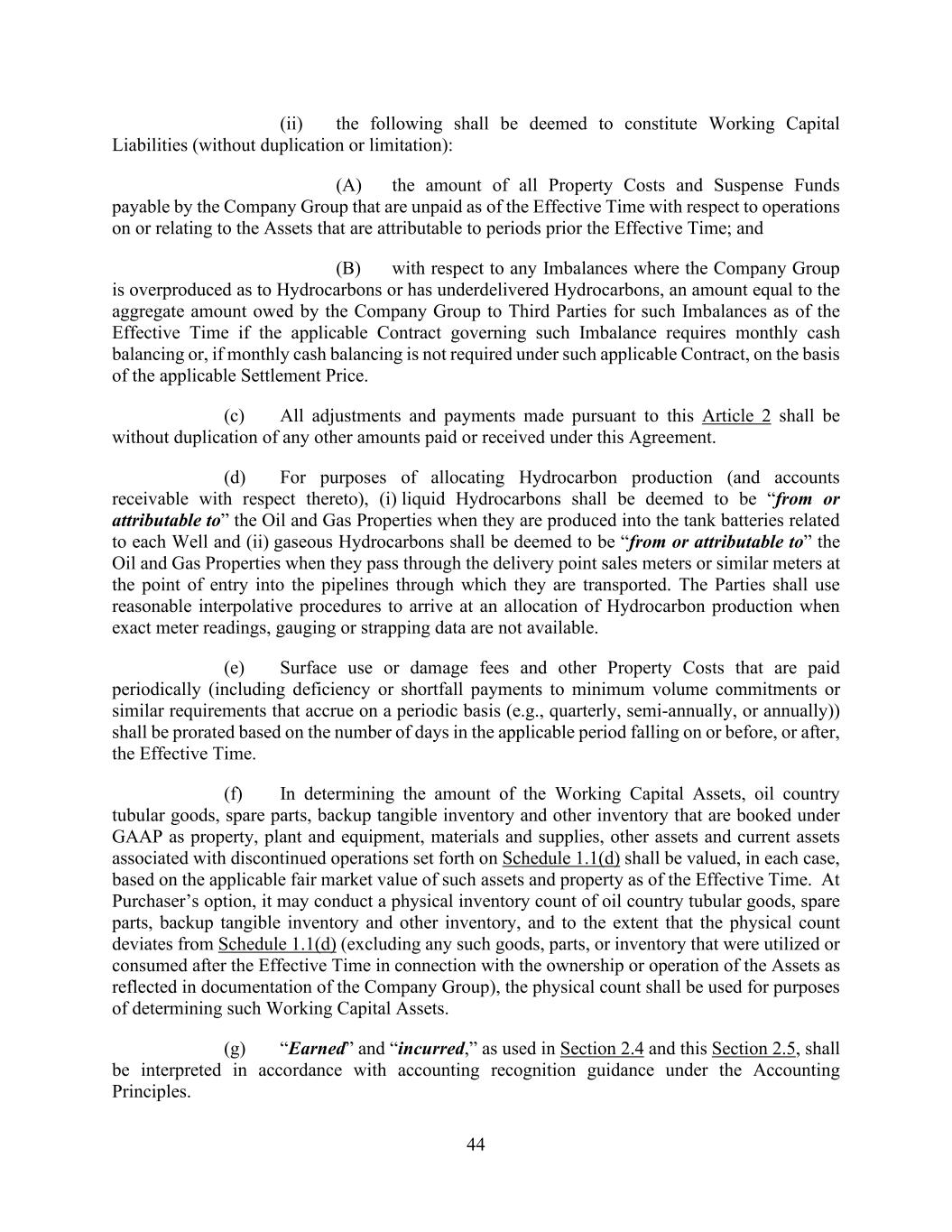 44 (ii) the following shall be deemed to constitute Working Capital Liabilities (without duplication or limitation): (A) the amount of all Property Costs and Suspense Funds payable by the Company Group that are unpaid as of the Effective Time with respect to operations on or relating to the Assets that are attributable to periods prior the Effective Time; and (B) with respect to any Imbalances where the Company Group is overproduced as to Hydrocarbons or has underdelivered Hydrocarbons, an amount equal to the aggregate amount owed by the Company Group to Third Parties for such Imbalances as of the Effective Time if the applicable Contract governing such Imbalance requires monthly cash balancing or, if monthly cash balancing is not required under such applicable Contract, on the basis of the applicable Settlement Price. (c) All adjustments and payments made pursuant to this Article 2 shall be without duplication of any other amounts paid or received under this Agreement. (d) For purposes of allocating Hydrocarbon production (and accounts receivable with respect thereto), (i) liquid Hydrocarbons shall be deemed to be “from or attributable to” the Oil and Gas Properties when they are produced into the tank batteries related to each Well and (ii) gaseous Hydrocarbons shall be deemed to be “from or attributable to” the Oil and Gas Properties when they pass through the delivery point sales meters or similar meters at the point of entry into the pipelines through which they are transported. The Parties shall use reasonable interpolative procedures to arrive at an allocation of Hydrocarbon production when exact meter readings, gauging or strapping data are not available. (e) Surface use or damage fees and other Property Costs that are paid periodically (including deficiency or shortfall payments to minimum volume commitments or similar requirements that accrue on a periodic basis (e.g., quarterly, semi-annually, or annually)) shall be prorated based on the number of days in the applicable period falling on or before, or after, the Effective Time. (f) In determining the amount of the Working Capital Assets, oil country tubular goods, spare parts, backup tangible inventory and other inventory that are booked under GAAP as property, plant and equipment, materials and supplies, other assets and current assets associated with discontinued operations set forth on Schedule 1.1(d) shall be valued, in each case, based on the applicable fair market value of such assets and property as of the Effective Time. At Purchaser’s option, it may conduct a physical inventory count of oil country tubular goods, spare parts, backup tangible inventory and other inventory, and to the extent that the physical count deviates from Schedule 1.1(d) (excluding any such goods, parts, or inventory that were utilized or consumed after the Effective Time in connection with the ownership or operation of the Assets as reflected in documentation of the Company Group), the physical count shall be used for purposes of determining such Working Capital Assets. (g) “Earned” and “incurred,” as used in Section 2.4 and this Section 2.5, shall be interpreted in accordance with accounting recognition guidance under the Accounting Principles.