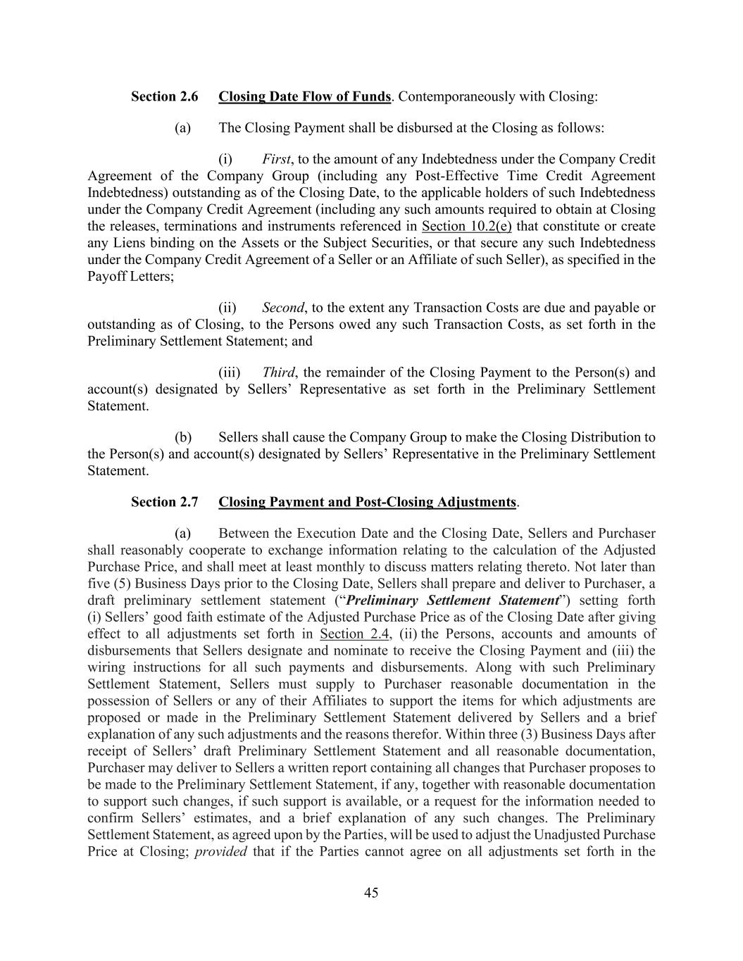 45 Section 2.6 Closing Date Flow of Funds. Contemporaneously with Closing: (a) The Closing Payment shall be disbursed at the Closing as follows: (i) First, to the amount of any Indebtedness under the Company Credit Agreement of the Company Group (including any Post-Effective Time Credit Agreement Indebtedness) outstanding as of the Closing Date, to the applicable holders of such Indebtedness under the Company Credit Agreement (including any such amounts required to obtain at Closing the releases, terminations and instruments referenced in Section 10.2(e) that constitute or create any Liens binding on the Assets or the Subject Securities, or that secure any such Indebtedness under the Company Credit Agreement of a Seller or an Affiliate of such Seller), as specified in the Payoff Letters; (ii) Second, to the extent any Transaction Costs are due and payable or outstanding as of Closing, to the Persons owed any such Transaction Costs, as set forth in the Preliminary Settlement Statement; and (iii) Third, the remainder of the Closing Payment to the Person(s) and account(s) designated by Sellers’ Representative as set forth in the Preliminary Settlement Statement. (b) Sellers shall cause the Company Group to make the Closing Distribution to the Person(s) and account(s) designated by Sellers’ Representative in the Preliminary Settlement Statement. Section 2.7 Closing Payment and Post-Closing Adjustments. (a) Between the Execution Date and the Closing Date, Sellers and Purchaser shall reasonably cooperate to exchange information relating to the calculation of the Adjusted Purchase Price, and shall meet at least monthly to discuss matters relating thereto. Not later than five (5) Business Days prior to the Closing Date, Sellers shall prepare and deliver to Purchaser, a draft preliminary settlement statement (“Preliminary Settlement Statement”) setting forth (i) Sellers’ good faith estimate of the Adjusted Purchase Price as of the Closing Date after giving effect to all adjustments set forth in Section 2.4, (ii) the Persons, accounts and amounts of disbursements that Sellers designate and nominate to receive the Closing Payment and (iii) the wiring instructions for all such payments and disbursements. Along with such Preliminary Settlement Statement, Sellers must supply to Purchaser reasonable documentation in the possession of Sellers or any of their Affiliates to support the items for which adjustments are proposed or made in the Preliminary Settlement Statement delivered by Sellers and a brief explanation of any such adjustments and the reasons therefor. Within three (3) Business Days after receipt of Sellers’ draft Preliminary Settlement Statement and all reasonable documentation, Purchaser may deliver to Sellers a written report containing all changes that Purchaser proposes to be made to the Preliminary Settlement Statement, if any, together with reasonable documentation to support such changes, if such support is available, or a request for the information needed to confirm Sellers’ estimates, and a brief explanation of any such changes. The Preliminary Settlement Statement, as agreed upon by the Parties, will be used to adjust the Unadjusted Purchase Price at Closing; provided that if the Parties cannot agree on all adjustments set forth in the