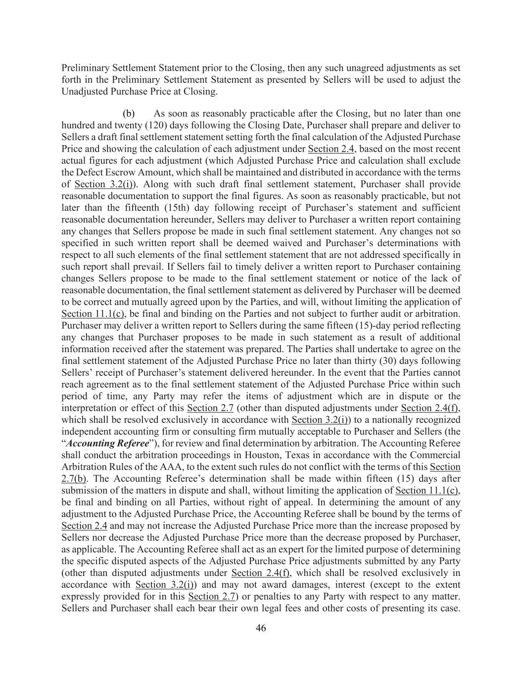 46 Preliminary Settlement Statement prior to the Closing, then any such unagreed adjustments as set forth in the Preliminary Settlement Statement as presented by Sellers will be used to adjust the Unadjusted Purchase Price at Closing. (b) As soon as reasonably practicable after the Closing, but no later than one hundred and twenty (120) days following the Closing Date, Purchaser shall prepare and deliver to Sellers a draft final settlement statement setting forth the final calculation of the Adjusted Purchase Price and showing the calculation of each adjustment under Section 2.4, based on the most recent actual figures for each adjustment (which Adjusted Purchase Price and calculation shall exclude the Defect Escrow Amount, which shall be maintained and distributed in accordance with the terms of Section 3.2(i)). Along with such draft final settlement statement, Purchaser shall provide reasonable documentation to support the final figures. As soon as reasonably practicable, but not later than the fifteenth (15th) day following receipt of Purchaser’s statement and sufficient reasonable documentation hereunder, Sellers may deliver to Purchaser a written report containing any changes that Sellers propose be made in such final settlement statement. Any changes not so specified in such written report shall be deemed waived and Purchaser’s determinations with respect to all such elements of the final settlement statement that are not addressed specifically in such report shall prevail. If Sellers fail to timely deliver a written report to Purchaser containing changes Sellers propose to be made to the final settlement statement or notice of the lack of reasonable documentation, the final settlement statement as delivered by Purchaser will be deemed to be correct and mutually agreed upon by the Parties, and will, without limiting the application of Section 11.1(c), be final and binding on the Parties and not subject to further audit or arbitration. Purchaser may deliver a written report to Sellers during the same fifteen (15)-day period reflecting any changes that Purchaser proposes to be made in such statement as a result of additional information received after the statement was prepared. The Parties shall undertake to agree on the final settlement statement of the Adjusted Purchase Price no later than thirty (30) days following Sellers’ receipt of Purchaser’s statement delivered hereunder. In the event that the Parties cannot reach agreement as to the final settlement statement of the Adjusted Purchase Price within such period of time, any Party may refer the items of adjustment which are in dispute or the interpretation or effect of this Section 2.7 (other than disputed adjustments under Section 2.4(f), which shall be resolved exclusively in accordance with Section 3.2(i)) to a nationally recognized independent accounting firm or consulting firm mutually acceptable to Purchaser and Sellers (the “Accounting Referee”), for review and final determination by arbitration. The Accounting Referee shall conduct the arbitration proceedings in Houston, Texas in accordance with the Commercial Arbitration Rules of the AAA, to the extent such rules do not conflict with the terms of this Section 2.7(b). The Accounting Referee’s determination shall be made within fifteen (15) days after submission of the matters in dispute and shall, without limiting the application of Section 11.1(c), be final and binding on all Parties, without right of appeal. In determining the amount of any adjustment to the Adjusted Purchase Price, the Accounting Referee shall be bound by the terms of Section 2.4 and may not increase the Adjusted Purchase Price more than the increase proposed by Sellers nor decrease the Adjusted Purchase Price more than the decrease proposed by Purchaser, as applicable. The Accounting Referee shall act as an expert for the limited purpose of determining the specific disputed aspects of the Adjusted Purchase Price adjustments submitted by any Party (other than disputed adjustments under Section 2.4(f), which shall be resolved exclusively in accordance with Section 3.2(i)) and may not award damages, interest (except to the extent expressly provided for in this Section 2.7) or penalties to any Party with respect to any matter. Sellers and Purchaser shall each bear their own legal fees and other costs of presenting its case.