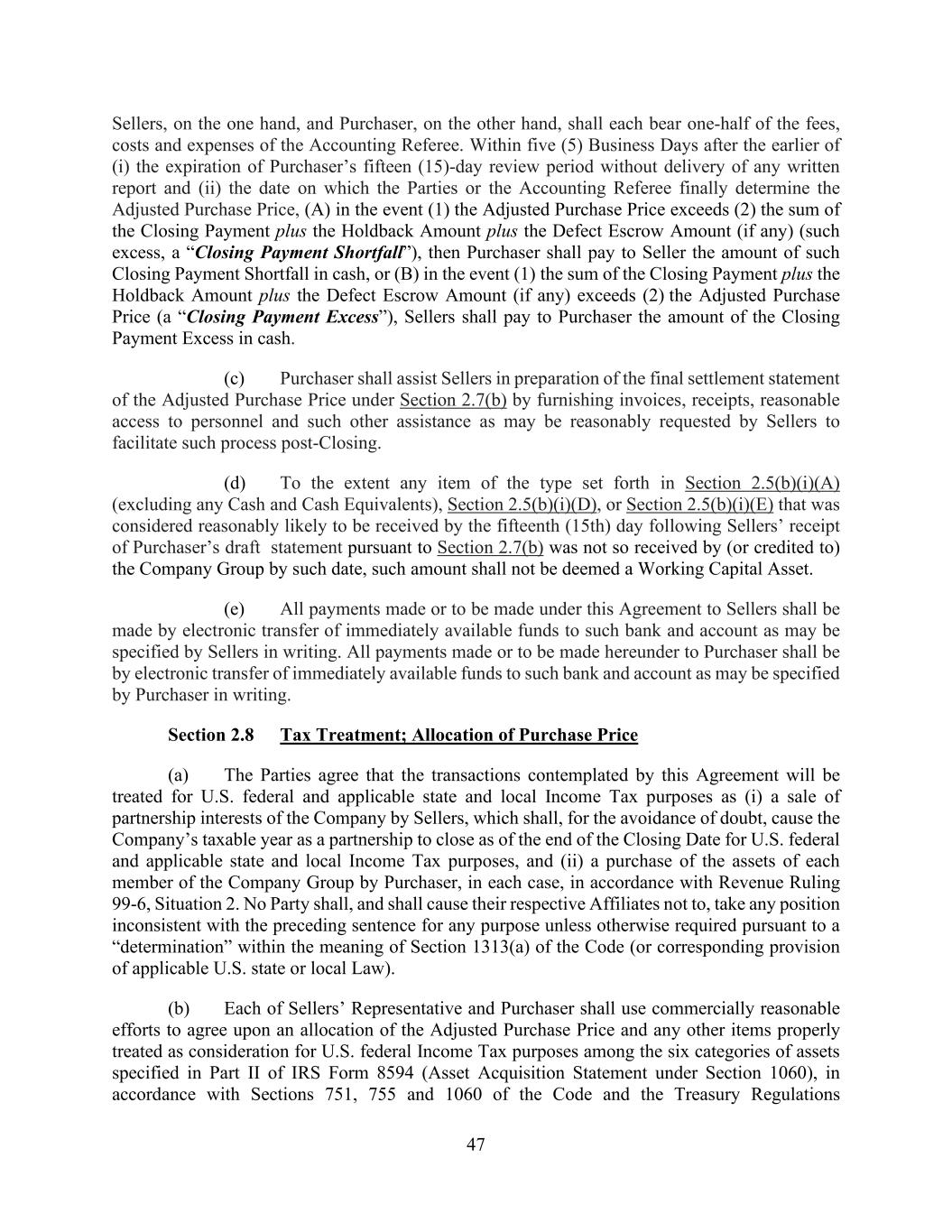 47 Sellers, on the one hand, and Purchaser, on the other hand, shall each bear one-half of the fees, costs and expenses of the Accounting Referee. Within five (5) Business Days after the earlier of (i) the expiration of Purchaser’s fifteen (15)-day review period without delivery of any written report and (ii) the date on which the Parties or the Accounting Referee finally determine the Adjusted Purchase Price, (A) in the event (1) the Adjusted Purchase Price exceeds (2) the sum of the Closing Payment plus the Holdback Amount plus the Defect Escrow Amount (if any) (such excess, a “Closing Payment Shortfall”), then Purchaser shall pay to Seller the amount of such Closing Payment Shortfall in cash, or (B) in the event (1) the sum of the Closing Payment plus the Holdback Amount plus the Defect Escrow Amount (if any) exceeds (2) the Adjusted Purchase Price (a “Closing Payment Excess”), Sellers shall pay to Purchaser the amount of the Closing Payment Excess in cash. (c) Purchaser shall assist Sellers in preparation of the final settlement statement of the Adjusted Purchase Price under Section 2.7(b) by furnishing invoices, receipts, reasonable access to personnel and such other assistance as may be reasonably requested by Sellers to facilitate such process post-Closing. (d) To the extent any item of the type set forth in Section 2.5(b)(i)(A) (excluding any Cash and Cash Equivalents), Section 2.5(b)(i)(D), or Section 2.5(b)(i)(E) that was considered reasonably likely to be received by the fifteenth (15th) day following Sellers’ receipt of Purchaser’s draft statement pursuant to Section 2.7(b) was not so received by (or credited to) the Company Group by such date, such amount shall not be deemed a Working Capital Asset. (e) All payments made or to be made under this Agreement to Sellers shall be made by electronic transfer of immediately available funds to such bank and account as may be specified by Sellers in writing. All payments made or to be made hereunder to Purchaser shall be by electronic transfer of immediately available funds to such bank and account as may be specified by Purchaser in writing. Section 2.8 Tax Treatment; Allocation of Purchase Price (a) The Parties agree that the transactions contemplated by this Agreement will be treated for U.S. federal and applicable state and local Income Tax purposes as (i) a sale of partnership interests of the Company by Sellers, which shall, for the avoidance of doubt, cause the Company’s taxable year as a partnership to close as of the end of the Closing Date for U.S. federal and applicable state and local Income Tax purposes, and (ii) a purchase of the assets of each member of the Company Group by Purchaser, in each case, in accordance with Revenue Ruling 99-6, Situation 2. No Party shall, and shall cause their respective Affiliates not to, take any position inconsistent with the preceding sentence for any purpose unless otherwise required pursuant to a “determination” within the meaning of Section 1313(a) of the Code (or corresponding provision of applicable U.S. state or local Law). (b) Each of Sellers’ Representative and Purchaser shall use commercially reasonable efforts to agree upon an allocation of the Adjusted Purchase Price and any other items properly treated as consideration for U.S. federal Income Tax purposes among the six categories of assets specified in Part II of IRS Form 8594 (Asset Acquisition Statement under Section 1060), in accordance with Sections 751, 755 and 1060 of the Code and the Treasury Regulations