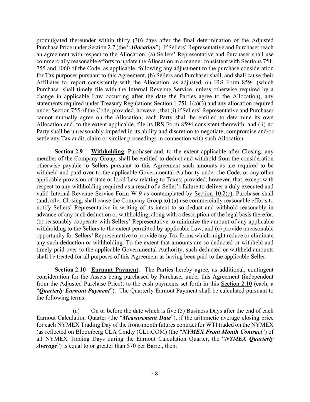48 promulgated thereunder within thirty (30) days after the final determination of the Adjusted Purchase Price under Section 2.7 (the “Allocation”). If Sellers’ Representative and Purchaser reach an agreement with respect to the Allocation, (a) Sellers’ Representative and Purchaser shall use commercially reasonable efforts to update the Allocation in a manner consistent with Sections 751, 755 and 1060 of the Code, as applicable, following any adjustment to the purchase consideration for Tax purposes pursuant to this Agreement, (b) Sellers and Purchaser shall, and shall cause their Affiliates to, report consistently with the Allocation, as adjusted, on IRS Form 8594 (which Purchaser shall timely file with the Internal Revenue Service, unless otherwise required by a change in applicable Law occurring after the date the Parties agree to the Allocation), any statements required under Treasury Regulations Section 1.751-1(a)(3) and any allocation required under Section 755 of the Code; provided, however, that (i) if Sellers’ Representative and Purchaser cannot mutually agree on the Allocation, each Party shall be entitled to determine its own Allocation and, to the extent applicable, file its IRS Form 8594 consistent therewith, and (ii) no Party shall be unreasonably impeded in its ability and discretion to negotiate, compromise and/or settle any Tax audit, claim or similar proceedings in connection with such Allocation. Section 2.9 Withholding. Purchaser and, to the extent applicable after Closing, any member of the Company Group, shall be entitled to deduct and withhold from the consideration otherwise payable to Sellers pursuant to this Agreement such amounts as are required to be withheld and paid over to the applicable Governmental Authority under the Code, or any other applicable provision of state or local Law relating to Taxes; provided, however, that, except with respect to any withholding required as a result of a Seller’s failure to deliver a duly executed and valid Internal Revenue Service Form W-9 as contemplated by Section 10.2(c), Purchaser shall (and, after Closing, shall cause the Company Group to) (a) use commercially reasonable efforts to notify Sellers’ Representative in writing of its intent to so deduct and withhold reasonably in advance of any such deduction or withholding, along with a description of the legal basis therefor, (b) reasonably cooperate with Sellers’ Representative to minimize the amount of any applicable withholding to the Sellers to the extent permitted by applicable Law, and (c) provide a reasonable opportunity for Sellers’ Representative to provide any Tax forms which might reduce or eliminate any such deduction or withholding. To the extent that amounts are so deducted or withheld and timely paid over to the applicable Governmental Authority, such deducted or withheld amounts shall be treated for all purposes of this Agreement as having been paid to the applicable Seller. Section 2.10 Earnout Payment. The Parties hereby agree, as additional, contingent consideration for the Assets being purchased by Purchaser under this Agreement (independent from the Adjusted Purchase Price), to the cash payments set forth in this Section 2.10 (each, a “Quarterly Earnout Payment”). The Quarterly Earnout Payment shall be calculated pursuant to the following terms: (a) On or before the date which is five (5) Business Days after the end of each Earnout Calculation Quarter (the “Measurement Date”), if the arithmetic average closing price for each NYMEX Trading Day of the front-month futures contract for WTI traded on the NYMEX (as reflected on Bloomberg CLA Cmdty (CL1:COM) (the “NYMEX Front Month Contract”) of all NYMEX Trading Days during the Earnout Calculation Quarter, the “NYMEX Quarterly Average”) is equal to or greater than $70 per Barrel, then:
