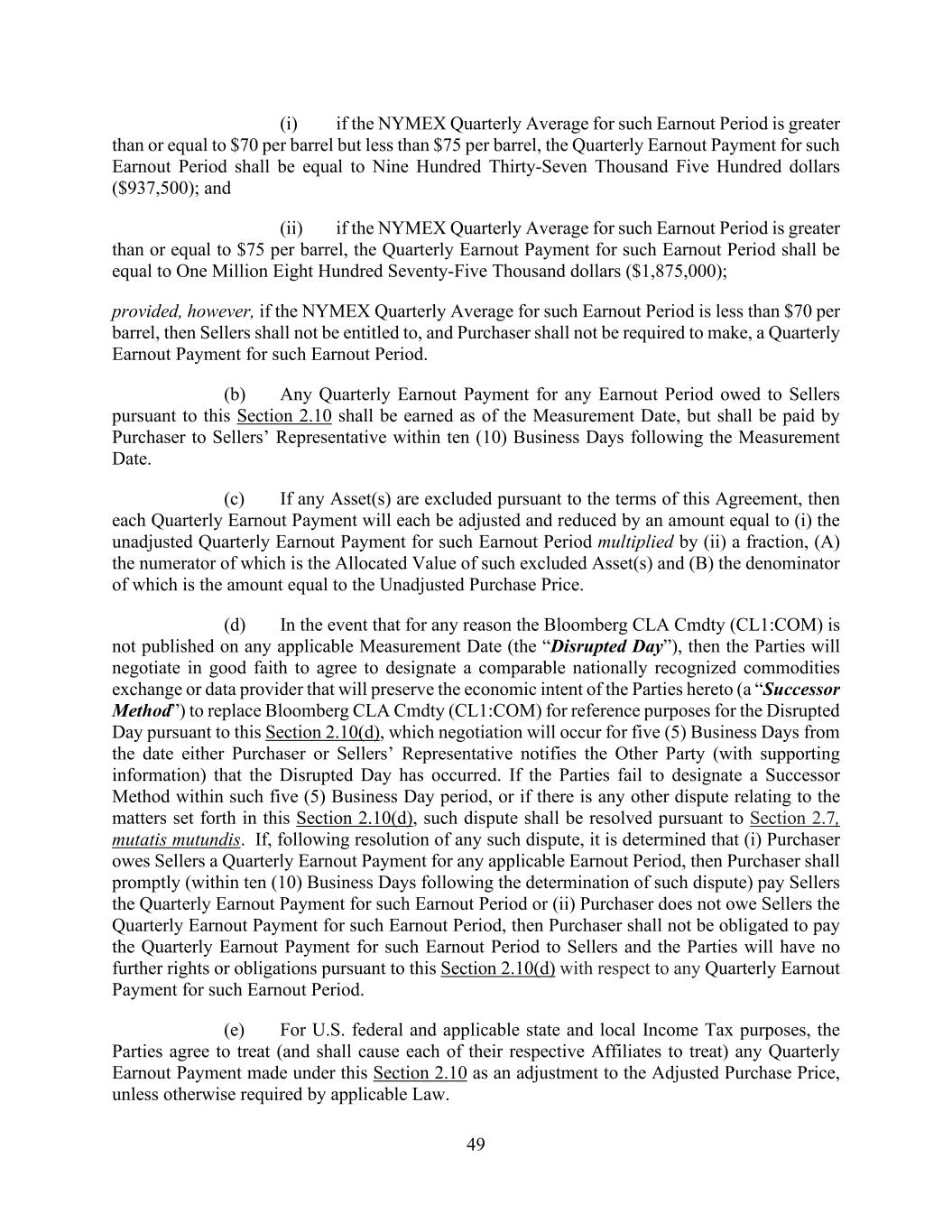 49 (i) if the NYMEX Quarterly Average for such Earnout Period is greater than or equal to $70 per barrel but less than $75 per barrel, the Quarterly Earnout Payment for such Earnout Period shall be equal to Nine Hundred Thirty-Seven Thousand Five Hundred dollars ($937,500); and (ii) if the NYMEX Quarterly Average for such Earnout Period is greater than or equal to $75 per barrel, the Quarterly Earnout Payment for such Earnout Period shall be equal to One Million Eight Hundred Seventy-Five Thousand dollars ($1,875,000); provided, however, if the NYMEX Quarterly Average for such Earnout Period is less than $70 per barrel, then Sellers shall not be entitled to, and Purchaser shall not be required to make, a Quarterly Earnout Payment for such Earnout Period. (b) Any Quarterly Earnout Payment for any Earnout Period owed to Sellers pursuant to this Section 2.10 shall be earned as of the Measurement Date, but shall be paid by Purchaser to Sellers’ Representative within ten (10) Business Days following the Measurement Date. (c) If any Asset(s) are excluded pursuant to the terms of this Agreement, then each Quarterly Earnout Payment will each be adjusted and reduced by an amount equal to (i) the unadjusted Quarterly Earnout Payment for such Earnout Period multiplied by (ii) a fraction, (A) the numerator of which is the Allocated Value of such excluded Asset(s) and (B) the denominator of which is the amount equal to the Unadjusted Purchase Price. (d) In the event that for any reason the Bloomberg CLA Cmdty (CL1:COM) is not published on any applicable Measurement Date (the “Disrupted Day”), then the Parties will negotiate in good faith to agree to designate a comparable nationally recognized commodities exchange or data provider that will preserve the economic intent of the Parties hereto (a “Successor Method”) to replace Bloomberg CLA Cmdty (CL1:COM) for reference purposes for the Disrupted Day pursuant to this Section 2.10(d), which negotiation will occur for five (5) Business Days from the date either Purchaser or Sellers’ Representative notifies the Other Party (with supporting information) that the Disrupted Day has occurred. If the Parties fail to designate a Successor Method within such five (5) Business Day period, or if there is any other dispute relating to the matters set forth in this Section 2.10(d), such dispute shall be resolved pursuant to Section 2.7, mutatis mutundis. If, following resolution of any such dispute, it is determined that (i) Purchaser owes Sellers a Quarterly Earnout Payment for any applicable Earnout Period, then Purchaser shall promptly (within ten (10) Business Days following the determination of such dispute) pay Sellers the Quarterly Earnout Payment for such Earnout Period or (ii) Purchaser does not owe Sellers the Quarterly Earnout Payment for such Earnout Period, then Purchaser shall not be obligated to pay the Quarterly Earnout Payment for such Earnout Period to Sellers and the Parties will have no further rights or obligations pursuant to this Section 2.10(d) with respect to any Quarterly Earnout Payment for such Earnout Period. (e) For U.S. federal and applicable state and local Income Tax purposes, the Parties agree to treat (and shall cause each of their respective Affiliates to treat) any Quarterly Earnout Payment made under this Section 2.10 as an adjustment to the Adjusted Purchase Price, unless otherwise required by applicable Law.