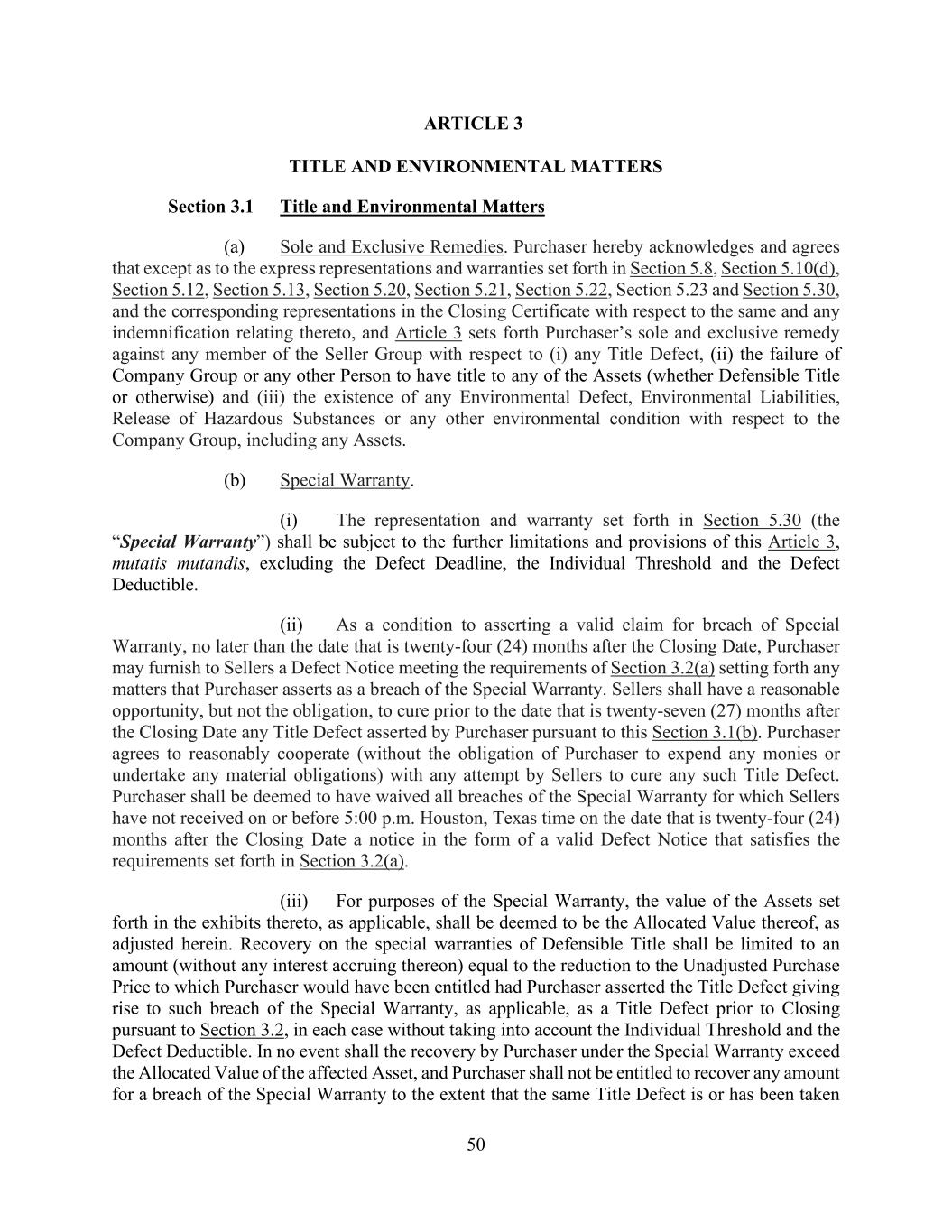 50 ARTICLE 3 TITLE AND ENVIRONMENTAL MATTERS Section 3.1 Title and Environmental Matters (a) Sole and Exclusive Remedies. Purchaser hereby acknowledges and agrees that except as to the express representations and warranties set forth in Section 5.8, Section 5.10(d), Section 5.12, Section 5.13, Section 5.20, Section 5.21, Section 5.22, Section 5.23 and Section 5.30, and the corresponding representations in the Closing Certificate with respect to the same and any indemnification relating thereto, and Article 3 sets forth Purchaser’s sole and exclusive remedy against any member of the Seller Group with respect to (i) any Title Defect, (ii) the failure of Company Group or any other Person to have title to any of the Assets (whether Defensible Title or otherwise) and (iii) the existence of any Environmental Defect, Environmental Liabilities, Release of Hazardous Substances or any other environmental condition with respect to the Company Group, including any Assets. (b) Special Warranty. (i) The representation and warranty set forth in Section 5.30 (the “Special Warranty”) shall be subject to the further limitations and provisions of this Article 3, mutatis mutandis, excluding the Defect Deadline, the Individual Threshold and the Defect Deductible. (ii) As a condition to asserting a valid claim for breach of Special Warranty, no later than the date that is twenty-four (24) months after the Closing Date, Purchaser may furnish to Sellers a Defect Notice meeting the requirements of Section 3.2(a) setting forth any matters that Purchaser asserts as a breach of the Special Warranty. Sellers shall have a reasonable opportunity, but not the obligation, to cure prior to the date that is twenty-seven (27) months after the Closing Date any Title Defect asserted by Purchaser pursuant to this Section 3.1(b). Purchaser agrees to reasonably cooperate (without the obligation of Purchaser to expend any monies or undertake any material obligations) with any attempt by Sellers to cure any such Title Defect. Purchaser shall be deemed to have waived all breaches of the Special Warranty for which Sellers have not received on or before 5:00 p.m. Houston, Texas time on the date that is twenty-four (24) months after the Closing Date a notice in the form of a valid Defect Notice that satisfies the requirements set forth in Section 3.2(a). (iii) For purposes of the Special Warranty, the value of the Assets set forth in the exhibits thereto, as applicable, shall be deemed to be the Allocated Value thereof, as adjusted herein. Recovery on the special warranties of Defensible Title shall be limited to an amount (without any interest accruing thereon) equal to the reduction to the Unadjusted Purchase Price to which Purchaser would have been entitled had Purchaser asserted the Title Defect giving rise to such breach of the Special Warranty, as applicable, as a Title Defect prior to Closing pursuant to Section 3.2, in each case without taking into account the Individual Threshold and the Defect Deductible. In no event shall the recovery by Purchaser under the Special Warranty exceed the Allocated Value of the affected Asset, and Purchaser shall not be entitled to recover any amount for a breach of the Special Warranty to the extent that the same Title Defect is or has been taken