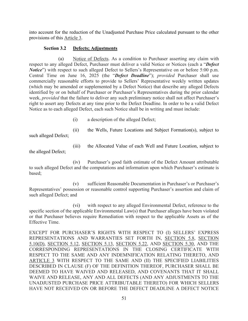 51 into account for the reduction of the Unadjusted Purchase Price calculated pursuant to the other provisions of this Article 3. Section 3.2 Defects; Adjustments (a) Notice of Defects. As a condition to Purchaser asserting any claim with respect to any alleged Defect, Purchaser must deliver a valid Notice or Notices (each a “Defect Notice”) with respect to such alleged Defect to Sellers’s Representative on or before 5:00 p.m. Central Time on June 16, 2025 (the “Defect Deadline”); provided Purchaser shall use commercially reasonable efforts to provide to Sellers’ Representative weekly written updates (which may be amended or supplemented by a Defect Notice) that describe any alleged Defects identified by or on behalf of Purchaser or Purchaser’s Representatives during the prior calendar week, provided that the failure to deliver any such preliminary notice shall not affect Purchaser’s right to assert any Defects at any time prior to the Defect Deadline. In order to be a valid Defect Notice as to each alleged Defect, each such Notice shall be in writing and must include: (i) a description of the alleged Defect; (ii) the Wells, Future Locations and Subject Formation(s), subject to such alleged Defect; (iii) the Allocated Value of each Well and Future Location, subject to the alleged Defect; (iv) Purchaser’s good faith estimate of the Defect Amount attributable to such alleged Defect and the computations and information upon which Purchaser’s estimate is based; (v) sufficient Reasonable Documentation in Purchaser’s or Purchaser’s Representatives’ possession or reasonable control supporting Purchaser’s assertion and claim of such alleged Defect; and (vi) with respect to any alleged Environmental Defect, reference to the specific section of the applicable Environmental Law(s) that Purchaser alleges have been violated or that Purchaser believes require Remediation with respect to the applicable Assets as of the Effective Time. EXCEPT FOR PURCHASER’S RIGHTS WITH RESPECT TO (I) SELLERS’ EXPRESS REPRESENTATIONS AND WARRANTIES SET FORTH IN, SECTION 5.8, SECTION 5.10(D), SECTION 5.12, SECTION 5.13, SECTION 5.22, AND SECTION 5.30, AND THE CORRESPONDING REPRESENTATIONS IN THE CLOSING CERTIFICATE WITH RESPECT TO THE SAME AND ANY INDEMNIFICATION RELATING THERETO, AND ARTICLE 3 WITH RESPECT TO THE SAME AND (II) THE SPECIFIED LIABILITIES DESCRIBED IN CLAUSE (F) OF THE DEFINITION THEREOF, PURCHASER SHALL BE DEEMED TO HAVE WAIVED AND RELEASED, AND COVENANTS THAT IT SHALL WAIVE AND RELEASE, ANY AND ALL DEFECTS (AND ANY ADJUSTMENTS TO THE UNADJUSTED PURCHASE PRICE ATTRIBUTABLE THERETO) FOR WHICH SELLERS HAVE NOT RECEIVED ON OR BEFORE THE DEFECT DEADLINE A DEFECT NOTICE