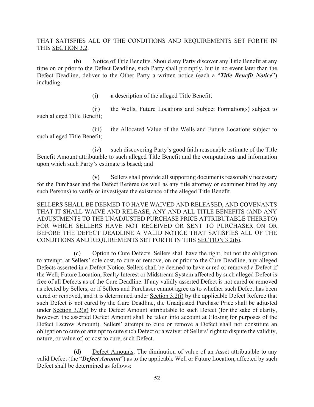 52 THAT SATISFIES ALL OF THE CONDITIONS AND REQUIREMENTS SET FORTH IN THIS SECTION 3.2. (b) Notice of Title Benefits. Should any Party discover any Title Benefit at any time on or prior to the Defect Deadline, such Party shall promptly, but in no event later than the Defect Deadline, deliver to the Other Party a written notice (each a “Title Benefit Notice”) including: (i) a description of the alleged Title Benefit; (ii) the Wells, Future Locations and Subject Formation(s) subject to such alleged Title Benefit; (iii) the Allocated Value of the Wells and Future Locations subject to such alleged Title Benefit; (iv) such discovering Party’s good faith reasonable estimate of the Title Benefit Amount attributable to such alleged Title Benefit and the computations and information upon which such Party’s estimate is based; and (v) Sellers shall provide all supporting documents reasonably necessary for the Purchaser and the Defect Referee (as well as any title attorney or examiner hired by any such Persons) to verify or investigate the existence of the alleged Title Benefit. SELLERS SHALL BE DEEMED TO HAVE WAIVED AND RELEASED, AND COVENANTS THAT IT SHALL WAIVE AND RELEASE, ANY AND ALL TITLE BENEFITS (AND ANY ADJUSTMENTS TO THE UNADJUSTED PURCHASE PRICE ATTRIBUTABLE THERETO) FOR WHICH SELLERS HAVE NOT RECEIVED OR SENT TO PURCHASER ON OR BEFORE THE DEFECT DEADLINE A VALID NOTICE THAT SATISFIES ALL OF THE CONDITIONS AND REQUIREMENTS SET FORTH IN THIS SECTION 3.2(b). (c) Option to Cure Defects. Sellers shall have the right, but not the obligation to attempt, at Sellers’ sole cost, to cure or remove, on or prior to the Cure Deadline, any alleged Defects asserted in a Defect Notice. Sellers shall be deemed to have cured or removed a Defect if the Well, Future Location, Realty Interest or Midstream System affected by such alleged Defect is free of all Defects as of the Cure Deadline. If any validly asserted Defect is not cured or removed as elected by Sellers, or if Sellers and Purchaser cannot agree as to whether such Defect has been cured or removed, and it is determined under Section 3.2(i) by the applicable Defect Referee that such Defect is not cured by the Cure Deadline, the Unadjusted Purchase Price shall be adjusted under Section 3.2(g) by the Defect Amount attributable to such Defect (for the sake of clarity, however, the asserted Defect Amount shall be taken into account at Closing for purposes of the Defect Escrow Amount). Sellers’ attempt to cure or remove a Defect shall not constitute an obligation to cure or attempt to cure such Defect or a waiver of Sellers’ right to dispute the validity, nature, or value of, or cost to cure, such Defect. (d) Defect Amounts. The diminution of value of an Asset attributable to any valid Defect (the “Defect Amount”) as to the applicable Well or Future Location, affected by such Defect shall be determined as follows: