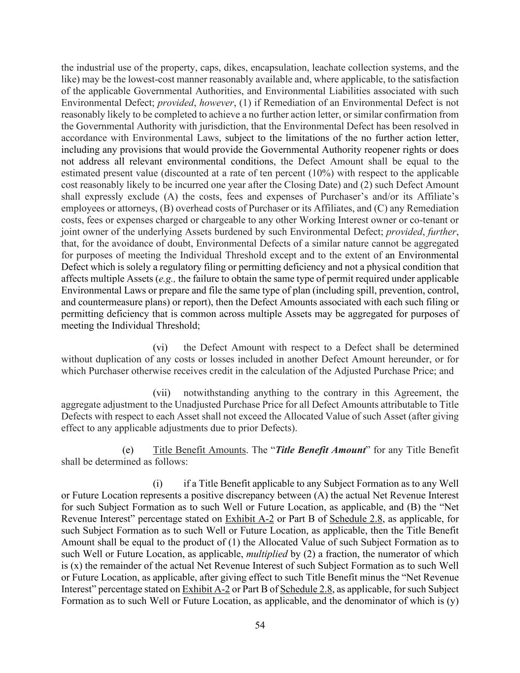 54 the industrial use of the property, caps, dikes, encapsulation, leachate collection systems, and the like) may be the lowest-cost manner reasonably available and, where applicable, to the satisfaction of the applicable Governmental Authorities, and Environmental Liabilities associated with such Environmental Defect; provided, however, (1) if Remediation of an Environmental Defect is not reasonably likely to be completed to achieve a no further action letter, or similar confirmation from the Governmental Authority with jurisdiction, that the Environmental Defect has been resolved in accordance with Environmental Laws, subject to the limitations of the no further action letter, including any provisions that would provide the Governmental Authority reopener rights or does not address all relevant environmental conditions, the Defect Amount shall be equal to the estimated present value (discounted at a rate of ten percent (10%) with respect to the applicable cost reasonably likely to be incurred one year after the Closing Date) and (2) such Defect Amount shall expressly exclude (A) the costs, fees and expenses of Purchaser’s and/or its Affiliate’s employees or attorneys, (B) overhead costs of Purchaser or its Affiliates, and (C) any Remediation costs, fees or expenses charged or chargeable to any other Working Interest owner or co-tenant or joint owner of the underlying Assets burdened by such Environmental Defect; provided, further, that, for the avoidance of doubt, Environmental Defects of a similar nature cannot be aggregated for purposes of meeting the Individual Threshold except and to the extent of an Environmental Defect which is solely a regulatory filing or permitting deficiency and not a physical condition that affects multiple Assets (e.g., the failure to obtain the same type of permit required under applicable Environmental Laws or prepare and file the same type of plan (including spill, prevention, control, and countermeasure plans) or report), then the Defect Amounts associated with each such filing or permitting deficiency that is common across multiple Assets may be aggregated for purposes of meeting the Individual Threshold; (vi) the Defect Amount with respect to a Defect shall be determined without duplication of any costs or losses included in another Defect Amount hereunder, or for which Purchaser otherwise receives credit in the calculation of the Adjusted Purchase Price; and (vii) notwithstanding anything to the contrary in this Agreement, the aggregate adjustment to the Unadjusted Purchase Price for all Defect Amounts attributable to Title Defects with respect to each Asset shall not exceed the Allocated Value of such Asset (after giving effect to any applicable adjustments due to prior Defects). (e) Title Benefit Amounts. The “Title Benefit Amount” for any Title Benefit shall be determined as follows: (i) if a Title Benefit applicable to any Subject Formation as to any Well or Future Location represents a positive discrepancy between (A) the actual Net Revenue Interest for such Subject Formation as to such Well or Future Location, as applicable, and (B) the “Net Revenue Interest” percentage stated on Exhibit A-2 or Part B of Schedule 2.8, as applicable, for such Subject Formation as to such Well or Future Location, as applicable, then the Title Benefit Amount shall be equal to the product of (1) the Allocated Value of such Subject Formation as to such Well or Future Location, as applicable, multiplied by (2) a fraction, the numerator of which is (x) the remainder of the actual Net Revenue Interest of such Subject Formation as to such Well or Future Location, as applicable, after giving effect to such Title Benefit minus the “Net Revenue Interest” percentage stated on Exhibit A-2 or Part B of Schedule 2.8, as applicable, for such Subject Formation as to such Well or Future Location, as applicable, and the denominator of which is (y)
