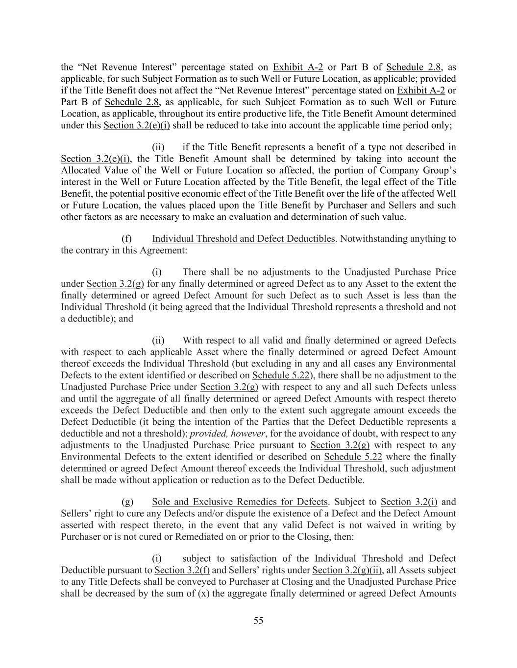 55 the “Net Revenue Interest” percentage stated on Exhibit A-2 or Part B of Schedule 2.8, as applicable, for such Subject Formation as to such Well or Future Location, as applicable; provided if the Title Benefit does not affect the “Net Revenue Interest” percentage stated on Exhibit A-2 or Part B of Schedule 2.8, as applicable, for such Subject Formation as to such Well or Future Location, as applicable, throughout its entire productive life, the Title Benefit Amount determined under this Section 3.2(e)(i) shall be reduced to take into account the applicable time period only; (ii) if the Title Benefit represents a benefit of a type not described in Section 3.2(e)(i), the Title Benefit Amount shall be determined by taking into account the Allocated Value of the Well or Future Location so affected, the portion of Company Group’s interest in the Well or Future Location affected by the Title Benefit, the legal effect of the Title Benefit, the potential positive economic effect of the Title Benefit over the life of the affected Well or Future Location, the values placed upon the Title Benefit by Purchaser and Sellers and such other factors as are necessary to make an evaluation and determination of such value. (f) Individual Threshold and Defect Deductibles. Notwithstanding anything to the contrary in this Agreement: (i) There shall be no adjustments to the Unadjusted Purchase Price under Section 3.2(g) for any finally determined or agreed Defect as to any Asset to the extent the finally determined or agreed Defect Amount for such Defect as to such Asset is less than the Individual Threshold (it being agreed that the Individual Threshold represents a threshold and not a deductible); and (ii) With respect to all valid and finally determined or agreed Defects with respect to each applicable Asset where the finally determined or agreed Defect Amount thereof exceeds the Individual Threshold (but excluding in any and all cases any Environmental Defects to the extent identified or described on Schedule 5.22), there shall be no adjustment to the Unadjusted Purchase Price under Section 3.2(g) with respect to any and all such Defects unless and until the aggregate of all finally determined or agreed Defect Amounts with respect thereto exceeds the Defect Deductible and then only to the extent such aggregate amount exceeds the Defect Deductible (it being the intention of the Parties that the Defect Deductible represents a deductible and not a threshold); provided, however, for the avoidance of doubt, with respect to any adjustments to the Unadjusted Purchase Price pursuant to Section 3.2(g) with respect to any Environmental Defects to the extent identified or described on Schedule 5.22 where the finally determined or agreed Defect Amount thereof exceeds the Individual Threshold, such adjustment shall be made without application or reduction as to the Defect Deductible. (g) Sole and Exclusive Remedies for Defects. Subject to Section 3.2(i) and Sellers’ right to cure any Defects and/or dispute the existence of a Defect and the Defect Amount asserted with respect thereto, in the event that any valid Defect is not waived in writing by Purchaser or is not cured or Remediated on or prior to the Closing, then: (i) subject to satisfaction of the Individual Threshold and Defect Deductible pursuant to Section 3.2(f) and Sellers’ rights under Section 3.2(g)(ii), all Assets subject to any Title Defects shall be conveyed to Purchaser at Closing and the Unadjusted Purchase Price shall be decreased by the sum of (x) the aggregate finally determined or agreed Defect Amounts