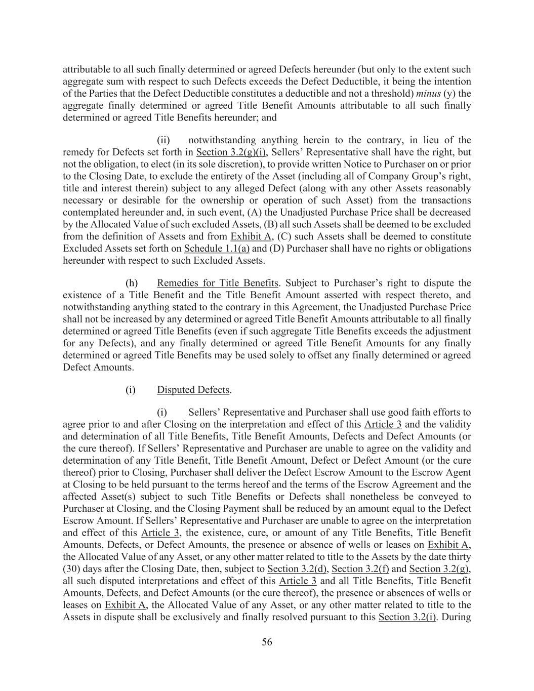 56 attributable to all such finally determined or agreed Defects hereunder (but only to the extent such aggregate sum with respect to such Defects exceeds the Defect Deductible, it being the intention of the Parties that the Defect Deductible constitutes a deductible and not a threshold) minus (y) the aggregate finally determined or agreed Title Benefit Amounts attributable to all such finally determined or agreed Title Benefits hereunder; and (ii) notwithstanding anything herein to the contrary, in lieu of the remedy for Defects set forth in Section 3.2(g)(i), Sellers’ Representative shall have the right, but not the obligation, to elect (in its sole discretion), to provide written Notice to Purchaser on or prior to the Closing Date, to exclude the entirety of the Asset (including all of Company Group’s right, title and interest therein) subject to any alleged Defect (along with any other Assets reasonably necessary or desirable for the ownership or operation of such Asset) from the transactions contemplated hereunder and, in such event, (A) the Unadjusted Purchase Price shall be decreased by the Allocated Value of such excluded Assets, (B) all such Assets shall be deemed to be excluded from the definition of Assets and from Exhibit A, (C) such Assets shall be deemed to constitute Excluded Assets set forth on Schedule 1.1(a) and (D) Purchaser shall have no rights or obligations hereunder with respect to such Excluded Assets. (h) Remedies for Title Benefits. Subject to Purchaser’s right to dispute the existence of a Title Benefit and the Title Benefit Amount asserted with respect thereto, and notwithstanding anything stated to the contrary in this Agreement, the Unadjusted Purchase Price shall not be increased by any determined or agreed Title Benefit Amounts attributable to all finally determined or agreed Title Benefits (even if such aggregate Title Benefits exceeds the adjustment for any Defects), and any finally determined or agreed Title Benefit Amounts for any finally determined or agreed Title Benefits may be used solely to offset any finally determined or agreed Defect Amounts. (i) Disputed Defects. (i) Sellers’ Representative and Purchaser shall use good faith efforts to agree prior to and after Closing on the interpretation and effect of this Article 3 and the validity and determination of all Title Benefits, Title Benefit Amounts, Defects and Defect Amounts (or the cure thereof). If Sellers’ Representative and Purchaser are unable to agree on the validity and determination of any Title Benefit, Title Benefit Amount, Defect or Defect Amount (or the cure thereof) prior to Closing, Purchaser shall deliver the Defect Escrow Amount to the Escrow Agent at Closing to be held pursuant to the terms hereof and the terms of the Escrow Agreement and the affected Asset(s) subject to such Title Benefits or Defects shall nonetheless be conveyed to Purchaser at Closing, and the Closing Payment shall be reduced by an amount equal to the Defect Escrow Amount. If Sellers’ Representative and Purchaser are unable to agree on the interpretation and effect of this Article 3, the existence, cure, or amount of any Title Benefits, Title Benefit Amounts, Defects, or Defect Amounts, the presence or absence of wells or leases on Exhibit A, the Allocated Value of any Asset, or any other matter related to title to the Assets by the date thirty (30) days after the Closing Date, then, subject to Section 3.2(d), Section 3.2(f) and Section 3.2(g), all such disputed interpretations and effect of this Article 3 and all Title Benefits, Title Benefit Amounts, Defects, and Defect Amounts (or the cure thereof), the presence or absences of wells or leases on Exhibit A, the Allocated Value of any Asset, or any other matter related to title to the Assets in dispute shall be exclusively and finally resolved pursuant to this Section 3.2(i). During