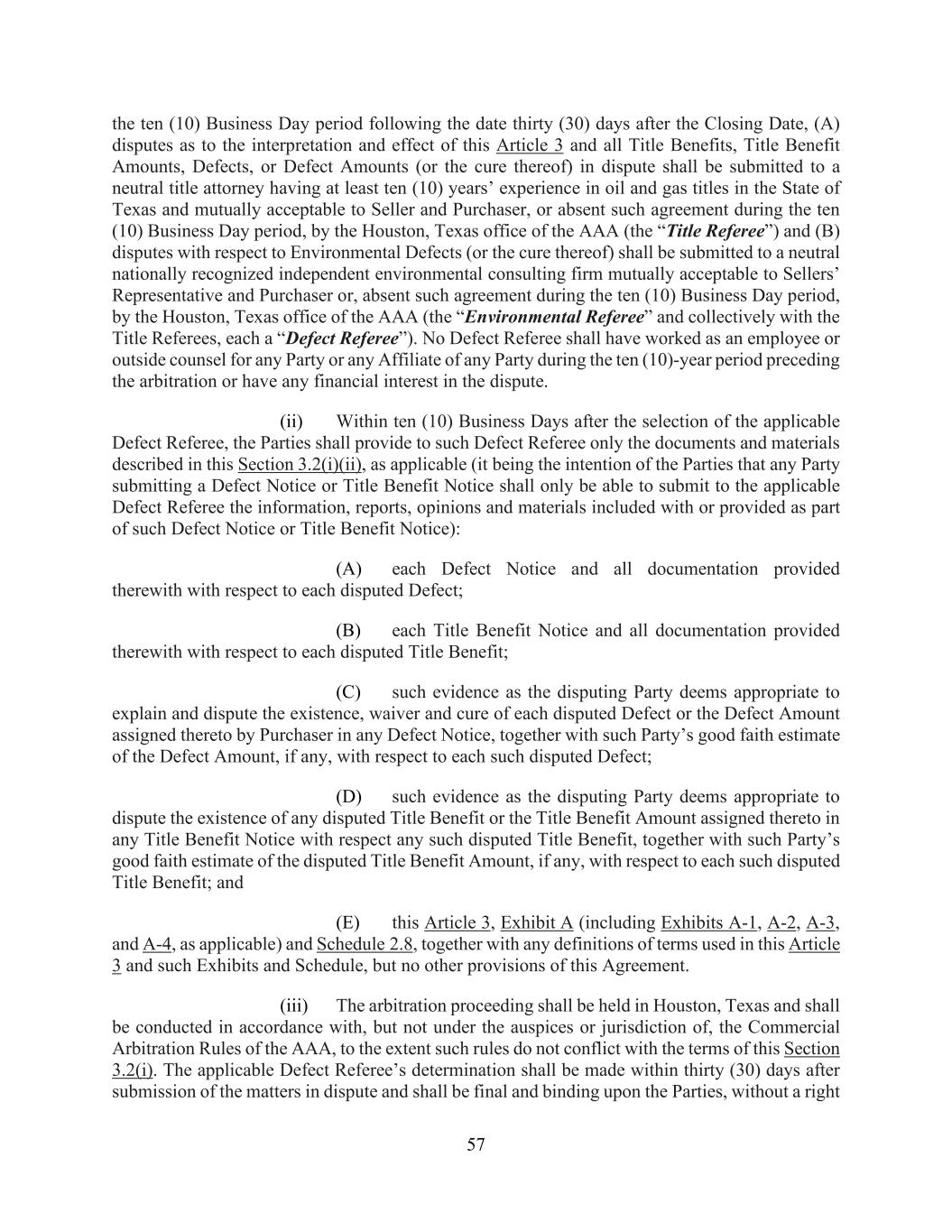 57 the ten (10) Business Day period following the date thirty (30) days after the Closing Date, (A) disputes as to the interpretation and effect of this Article 3 and all Title Benefits, Title Benefit Amounts, Defects, or Defect Amounts (or the cure thereof) in dispute shall be submitted to a neutral title attorney having at least ten (10) years’ experience in oil and gas titles in the State of Texas and mutually acceptable to Seller and Purchaser, or absent such agreement during the ten (10) Business Day period, by the Houston, Texas office of the AAA (the “Title Referee”) and (B) disputes with respect to Environmental Defects (or the cure thereof) shall be submitted to a neutral nationally recognized independent environmental consulting firm mutually acceptable to Sellers’ Representative and Purchaser or, absent such agreement during the ten (10) Business Day period, by the Houston, Texas office of the AAA (the “Environmental Referee” and collectively with the Title Referees, each a “Defect Referee”). No Defect Referee shall have worked as an employee or outside counsel for any Party or any Affiliate of any Party during the ten (10)-year period preceding the arbitration or have any financial interest in the dispute. (ii) Within ten (10) Business Days after the selection of the applicable Defect Referee, the Parties shall provide to such Defect Referee only the documents and materials described in this Section 3.2(i)(ii), as applicable (it being the intention of the Parties that any Party submitting a Defect Notice or Title Benefit Notice shall only be able to submit to the applicable Defect Referee the information, reports, opinions and materials included with or provided as part of such Defect Notice or Title Benefit Notice): (A) each Defect Notice and all documentation provided therewith with respect to each disputed Defect; (B) each Title Benefit Notice and all documentation provided therewith with respect to each disputed Title Benefit; (C) such evidence as the disputing Party deems appropriate to explain and dispute the existence, waiver and cure of each disputed Defect or the Defect Amount assigned thereto by Purchaser in any Defect Notice, together with such Party’s good faith estimate of the Defect Amount, if any, with respect to each such disputed Defect; (D) such evidence as the disputing Party deems appropriate to dispute the existence of any disputed Title Benefit or the Title Benefit Amount assigned thereto in any Title Benefit Notice with respect any such disputed Title Benefit, together with such Party’s good faith estimate of the disputed Title Benefit Amount, if any, with respect to each such disputed Title Benefit; and (E) this Article 3, Exhibit A (including Exhibits A-1, A-2, A-3, and A-4, as applicable) and Schedule 2.8, together with any definitions of terms used in this Article 3 and such Exhibits and Schedule, but no other provisions of this Agreement. (iii) The arbitration proceeding shall be held in Houston, Texas and shall be conducted in accordance with, but not under the auspices or jurisdiction of, the Commercial Arbitration Rules of the AAA, to the extent such rules do not conflict with the terms of this Section 3.2(i). The applicable Defect Referee’s determination shall be made within thirty (30) days after submission of the matters in dispute and shall be final and binding upon the Parties, without a right