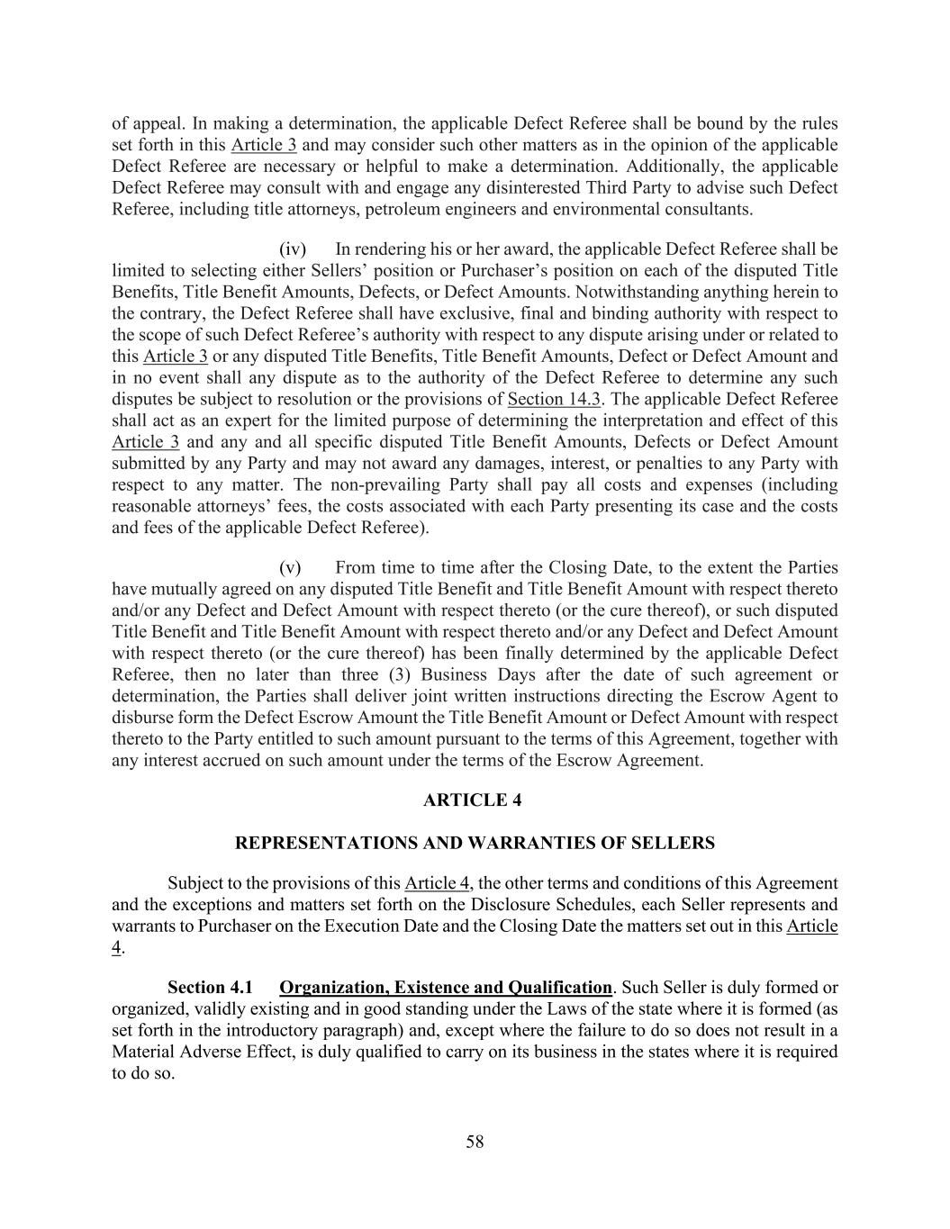 58 of appeal. In making a determination, the applicable Defect Referee shall be bound by the rules set forth in this Article 3 and may consider such other matters as in the opinion of the applicable Defect Referee are necessary or helpful to make a determination. Additionally, the applicable Defect Referee may consult with and engage any disinterested Third Party to advise such Defect Referee, including title attorneys, petroleum engineers and environmental consultants. (iv) In rendering his or her award, the applicable Defect Referee shall be limited to selecting either Sellers’ position or Purchaser’s position on each of the disputed Title Benefits, Title Benefit Amounts, Defects, or Defect Amounts. Notwithstanding anything herein to the contrary, the Defect Referee shall have exclusive, final and binding authority with respect to the scope of such Defect Referee’s authority with respect to any dispute arising under or related to this Article 3 or any disputed Title Benefits, Title Benefit Amounts, Defect or Defect Amount and in no event shall any dispute as to the authority of the Defect Referee to determine any such disputes be subject to resolution or the provisions of Section 14.3. The applicable Defect Referee shall act as an expert for the limited purpose of determining the interpretation and effect of this Article 3 and any and all specific disputed Title Benefit Amounts, Defects or Defect Amount submitted by any Party and may not award any damages, interest, or penalties to any Party with respect to any matter. The non-prevailing Party shall pay all costs and expenses (including reasonable attorneys’ fees, the costs associated with each Party presenting its case and the costs and fees of the applicable Defect Referee). (v) From time to time after the Closing Date, to the extent the Parties have mutually agreed on any disputed Title Benefit and Title Benefit Amount with respect thereto and/or any Defect and Defect Amount with respect thereto (or the cure thereof), or such disputed Title Benefit and Title Benefit Amount with respect thereto and/or any Defect and Defect Amount with respect thereto (or the cure thereof) has been finally determined by the applicable Defect Referee, then no later than three (3) Business Days after the date of such agreement or determination, the Parties shall deliver joint written instructions directing the Escrow Agent to disburse form the Defect Escrow Amount the Title Benefit Amount or Defect Amount with respect thereto to the Party entitled to such amount pursuant to the terms of this Agreement, together with any interest accrued on such amount under the terms of the Escrow Agreement. ARTICLE 4 REPRESENTATIONS AND WARRANTIES OF SELLERS Subject to the provisions of this Article 4, the other terms and conditions of this Agreement and the exceptions and matters set forth on the Disclosure Schedules, each Seller represents and warrants to Purchaser on the Execution Date and the Closing Date the matters set out in this Article 4. Section 4.1 Organization, Existence and Qualification. Such Seller is duly formed or organized, validly existing and in good standing under the Laws of the state where it is formed (as set forth in the introductory paragraph) and, except where the failure to do so does not result in a Material Adverse Effect, is duly qualified to carry on its business in the states where it is required to do so.