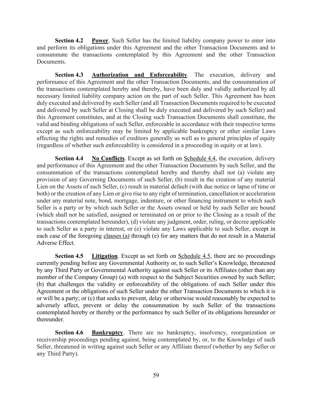 59 Section 4.2 Power. Such Seller has the limited liability company power to enter into and perform its obligations under this Agreement and the other Transaction Documents and to consummate the transactions contemplated by this Agreement and the other Transaction Documents. Section 4.3 Authorization and Enforceability. The execution, delivery and performance of this Agreement and the other Transaction Documents, and the consummation of the transactions contemplated hereby and thereby, have been duly and validly authorized by all necessary limited liability company action on the part of such Seller. This Agreement has been duly executed and delivered by such Seller (and all Transaction Documents required to be executed and delivered by such Seller at Closing shall be duly executed and delivered by such Seller) and this Agreement constitutes, and at the Closing such Transaction Documents shall constitute, the valid and binding obligations of such Seller, enforceable in accordance with their respective terms except as such enforceability may be limited by applicable bankruptcy or other similar Laws affecting the rights and remedies of creditors generally as well as to general principles of equity (regardless of whether such enforceability is considered in a proceeding in equity or at law). Section 4.4 No Conflicts. Except as set forth on Schedule 4.4, the execution, delivery and performance of this Agreement and the other Transaction Documents by such Seller, and the consummation of the transactions contemplated hereby and thereby shall not (a) violate any provision of any Governing Documents of such Seller, (b) result in the creation of any material Lien on the Assets of such Seller, (c) result in material default (with due notice or lapse of time or both) or the creation of any Lien or give rise to any right of termination, cancellation or acceleration under any material note, bond, mortgage, indenture, or other financing instrument to which such Seller is a party or by which such Seller or the Assets owned or held by such Seller are bound (which shall not be satisfied, assigned or terminated on or prior to the Closing as a result of the transactions contemplated hereunder), (d) violate any judgment, order, ruling, or decree applicable to such Seller as a party in interest, or (e) violate any Laws applicable to such Seller, except in each case of the foregoing clauses (a) through (e) for any matters that do not result in a Material Adverse Effect. Section 4.5 Litigation. Except as set forth on Schedule 4.5, there are no proceedings currently pending before any Governmental Authority or, to such Seller’s Knowledge, threatened by any Third Party or Governmental Authority against such Seller or its Affiliates (other than any member of the Company Group) (a) with respect to the Subject Securities owned by such Seller; (b) that challenges the validity or enforceability of the obligations of such Seller under this Agreement or the obligations of such Seller under the other Transaction Documents to which it is or will be a party; or (c) that seeks to prevent, delay or otherwise would reasonably be expected to adversely affect, prevent or delay the consummation by such Seller of the transactions contemplated hereby or thereby or the performance by such Seller of its obligations hereunder or thereunder. Section 4.6 Bankruptcy. There are no bankruptcy, insolvency, reorganization or receivership proceedings pending against, being contemplated by, or, to the Knowledge of such Seller, threatened in writing against such Seller or any Affiliate thereof (whether by any Seller or any Third Party).