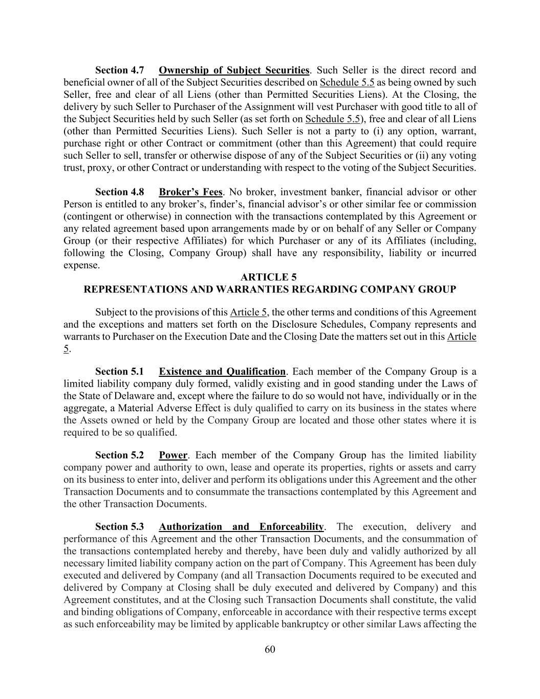 60 Section 4.7 Ownership of Subject Securities. Such Seller is the direct record and beneficial owner of all of the Subject Securities described on Schedule 5.5 as being owned by such Seller, free and clear of all Liens (other than Permitted Securities Liens). At the Closing, the delivery by such Seller to Purchaser of the Assignment will vest Purchaser with good title to all of the Subject Securities held by such Seller (as set forth on Schedule 5.5), free and clear of all Liens (other than Permitted Securities Liens). Such Seller is not a party to (i) any option, warrant, purchase right or other Contract or commitment (other than this Agreement) that could require such Seller to sell, transfer or otherwise dispose of any of the Subject Securities or (ii) any voting trust, proxy, or other Contract or understanding with respect to the voting of the Subject Securities. Section 4.8 Broker’s Fees. No broker, investment banker, financial advisor or other Person is entitled to any broker’s, finder’s, financial advisor’s or other similar fee or commission (contingent or otherwise) in connection with the transactions contemplated by this Agreement or any related agreement based upon arrangements made by or on behalf of any Seller or Company Group (or their respective Affiliates) for which Purchaser or any of its Affiliates (including, following the Closing, Company Group) shall have any responsibility, liability or incurred expense. ARTICLE 5 REPRESENTATIONS AND WARRANTIES REGARDING COMPANY GROUP Subject to the provisions of this Article 5, the other terms and conditions of this Agreement and the exceptions and matters set forth on the Disclosure Schedules, Company represents and warrants to Purchaser on the Execution Date and the Closing Date the matters set out in this Article 5. Section 5.1 Existence and Qualification. Each member of the Company Group is a limited liability company duly formed, validly existing and in good standing under the Laws of the State of Delaware and, except where the failure to do so would not have, individually or in the aggregate, a Material Adverse Effect is duly qualified to carry on its business in the states where the Assets owned or held by the Company Group are located and those other states where it is required to be so qualified. Section 5.2 Power. Each member of the Company Group has the limited liability company power and authority to own, lease and operate its properties, rights or assets and carry on its business to enter into, deliver and perform its obligations under this Agreement and the other Transaction Documents and to consummate the transactions contemplated by this Agreement and the other Transaction Documents. Section 5.3 Authorization and Enforceability. The execution, delivery and performance of this Agreement and the other Transaction Documents, and the consummation of the transactions contemplated hereby and thereby, have been duly and validly authorized by all necessary limited liability company action on the part of Company. This Agreement has been duly executed and delivered by Company (and all Transaction Documents required to be executed and delivered by Company at Closing shall be duly executed and delivered by Company) and this Agreement constitutes, and at the Closing such Transaction Documents shall constitute, the valid and binding obligations of Company, enforceable in accordance with their respective terms except as such enforceability may be limited by applicable bankruptcy or other similar Laws affecting the