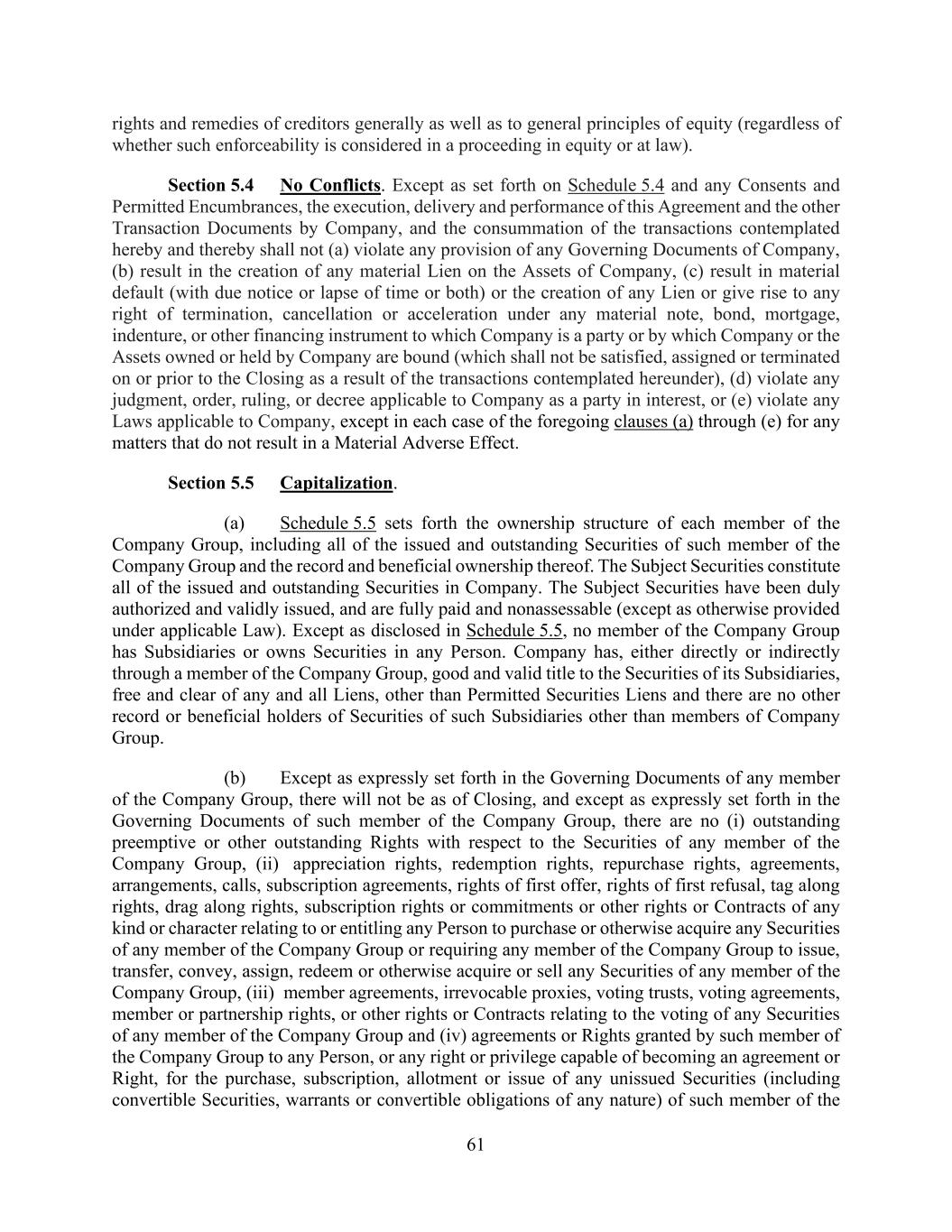 61 rights and remedies of creditors generally as well as to general principles of equity (regardless of whether such enforceability is considered in a proceeding in equity or at law). Section 5.4 No Conflicts. Except as set forth on Schedule 5.4 and any Consents and Permitted Encumbrances, the execution, delivery and performance of this Agreement and the other Transaction Documents by Company, and the consummation of the transactions contemplated hereby and thereby shall not (a) violate any provision of any Governing Documents of Company, (b) result in the creation of any material Lien on the Assets of Company, (c) result in material default (with due notice or lapse of time or both) or the creation of any Lien or give rise to any right of termination, cancellation or acceleration under any material note, bond, mortgage, indenture, or other financing instrument to which Company is a party or by which Company or the Assets owned or held by Company are bound (which shall not be satisfied, assigned or terminated on or prior to the Closing as a result of the transactions contemplated hereunder), (d) violate any judgment, order, ruling, or decree applicable to Company as a party in interest, or (e) violate any Laws applicable to Company, except in each case of the foregoing clauses (a) through (e) for any matters that do not result in a Material Adverse Effect. Section 5.5 Capitalization. (a) Schedule 5.5 sets forth the ownership structure of each member of the Company Group, including all of the issued and outstanding Securities of such member of the Company Group and the record and beneficial ownership thereof. The Subject Securities constitute all of the issued and outstanding Securities in Company. The Subject Securities have been duly authorized and validly issued, and are fully paid and nonassessable (except as otherwise provided under applicable Law). Except as disclosed in Schedule 5.5, no member of the Company Group has Subsidiaries or owns Securities in any Person. Company has, either directly or indirectly through a member of the Company Group, good and valid title to the Securities of its Subsidiaries, free and clear of any and all Liens, other than Permitted Securities Liens and there are no other record or beneficial holders of Securities of such Subsidiaries other than members of Company Group. (b) Except as expressly set forth in the Governing Documents of any member of the Company Group, there will not be as of Closing, and except as expressly set forth in the Governing Documents of such member of the Company Group, there are no (i) outstanding preemptive or other outstanding Rights with respect to the Securities of any member of the Company Group, (ii) appreciation rights, redemption rights, repurchase rights, agreements, arrangements, calls, subscription agreements, rights of first offer, rights of first refusal, tag along rights, drag along rights, subscription rights or commitments or other rights or Contracts of any kind or character relating to or entitling any Person to purchase or otherwise acquire any Securities of any member of the Company Group or requiring any member of the Company Group to issue, transfer, convey, assign, redeem or otherwise acquire or sell any Securities of any member of the Company Group, (iii) member agreements, irrevocable proxies, voting trusts, voting agreements, member or partnership rights, or other rights or Contracts relating to the voting of any Securities of any member of the Company Group and (iv) agreements or Rights granted by such member of the Company Group to any Person, or any right or privilege capable of becoming an agreement or Right, for the purchase, subscription, allotment or issue of any unissued Securities (including convertible Securities, warrants or convertible obligations of any nature) of such member of the