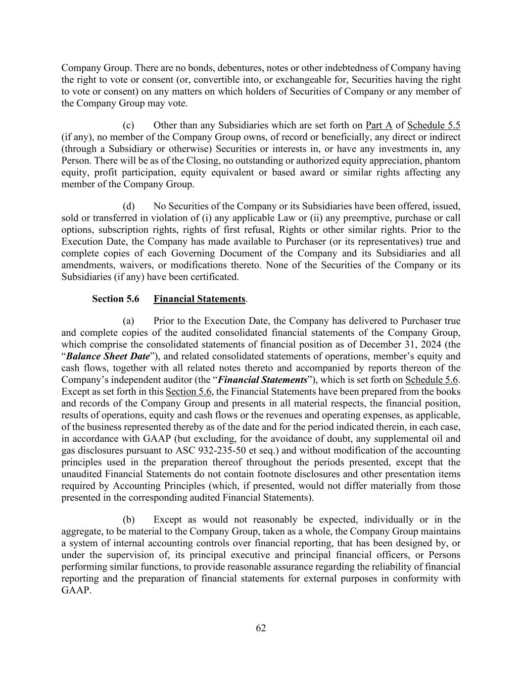 62 Company Group. There are no bonds, debentures, notes or other indebtedness of Company having the right to vote or consent (or, convertible into, or exchangeable for, Securities having the right to vote or consent) on any matters on which holders of Securities of Company or any member of the Company Group may vote. (c) Other than any Subsidiaries which are set forth on Part A of Schedule 5.5 (if any), no member of the Company Group owns, of record or beneficially, any direct or indirect (through a Subsidiary or otherwise) Securities or interests in, or have any investments in, any Person. There will be as of the Closing, no outstanding or authorized equity appreciation, phantom equity, profit participation, equity equivalent or based award or similar rights affecting any member of the Company Group. (d) No Securities of the Company or its Subsidiaries have been offered, issued, sold or transferred in violation of (i) any applicable Law or (ii) any preemptive, purchase or call options, subscription rights, rights of first refusal, Rights or other similar rights. Prior to the Execution Date, the Company has made available to Purchaser (or its representatives) true and complete copies of each Governing Document of the Company and its Subsidiaries and all amendments, waivers, or modifications thereto. None of the Securities of the Company or its Subsidiaries (if any) have been certificated. Section 5.6 Financial Statements. (a) Prior to the Execution Date, the Company has delivered to Purchaser true and complete copies of the audited consolidated financial statements of the Company Group, which comprise the consolidated statements of financial position as of December 31, 2024 (the “Balance Sheet Date”), and related consolidated statements of operations, member’s equity and cash flows, together with all related notes thereto and accompanied by reports thereon of the Company’s independent auditor (the “Financial Statements”), which is set forth on Schedule 5.6. Except as set forth in this Section 5.6, the Financial Statements have been prepared from the books and records of the Company Group and presents in all material respects, the financial position, results of operations, equity and cash flows or the revenues and operating expenses, as applicable, of the business represented thereby as of the date and for the period indicated therein, in each case, in accordance with GAAP (but excluding, for the avoidance of doubt, any supplemental oil and gas disclosures pursuant to ASC 932-235-50 et seq.) and without modification of the accounting principles used in the preparation thereof throughout the periods presented, except that the unaudited Financial Statements do not contain footnote disclosures and other presentation items required by Accounting Principles (which, if presented, would not differ materially from those presented in the corresponding audited Financial Statements). (b) Except as would not reasonably be expected, individually or in the aggregate, to be material to the Company Group, taken as a whole, the Company Group maintains a system of internal accounting controls over financial reporting, that has been designed by, or under the supervision of, its principal executive and principal financial officers, or Persons performing similar functions, to provide reasonable assurance regarding the reliability of financial reporting and the preparation of financial statements for external purposes in conformity with GAAP.