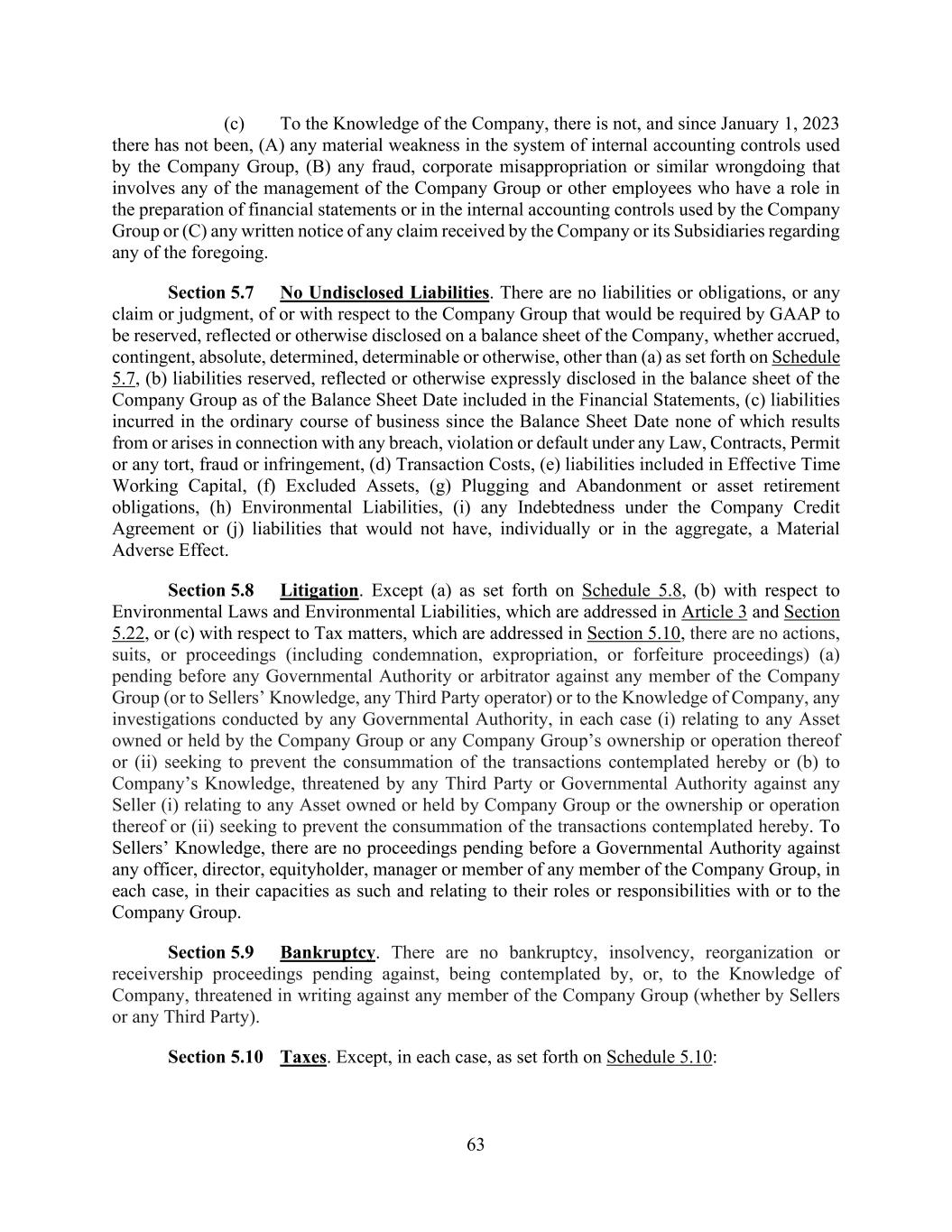 63 (c) To the Knowledge of the Company, there is not, and since January 1, 2023 there has not been, (A) any material weakness in the system of internal accounting controls used by the Company Group, (B) any fraud, corporate misappropriation or similar wrongdoing that involves any of the management of the Company Group or other employees who have a role in the preparation of financial statements or in the internal accounting controls used by the Company Group or (C) any written notice of any claim received by the Company or its Subsidiaries regarding any of the foregoing. Section 5.7 No Undisclosed Liabilities. There are no liabilities or obligations, or any claim or judgment, of or with respect to the Company Group that would be required by GAAP to be reserved, reflected or otherwise disclosed on a balance sheet of the Company, whether accrued, contingent, absolute, determined, determinable or otherwise, other than (a) as set forth on Schedule 5.7, (b) liabilities reserved, reflected or otherwise expressly disclosed in the balance sheet of the Company Group as of the Balance Sheet Date included in the Financial Statements, (c) liabilities incurred in the ordinary course of business since the Balance Sheet Date none of which results from or arises in connection with any breach, violation or default under any Law, Contracts, Permit or any tort, fraud or infringement, (d) Transaction Costs, (e) liabilities included in Effective Time Working Capital, (f) Excluded Assets, (g) Plugging and Abandonment or asset retirement obligations, (h) Environmental Liabilities, (i) any Indebtedness under the Company Credit Agreement or (j) liabilities that would not have, individually or in the aggregate, a Material Adverse Effect. Section 5.8 Litigation. Except (a) as set forth on Schedule 5.8, (b) with respect to Environmental Laws and Environmental Liabilities, which are addressed in Article 3 and Section 5.22, or (c) with respect to Tax matters, which are addressed in Section 5.10, there are no actions, suits, or proceedings (including condemnation, expropriation, or forfeiture proceedings) (a) pending before any Governmental Authority or arbitrator against any member of the Company Group (or to Sellers’ Knowledge, any Third Party operator) or to the Knowledge of Company, any investigations conducted by any Governmental Authority, in each case (i) relating to any Asset owned or held by the Company Group or any Company Group’s ownership or operation thereof or (ii) seeking to prevent the consummation of the transactions contemplated hereby or (b) to Company’s Knowledge, threatened by any Third Party or Governmental Authority against any Seller (i) relating to any Asset owned or held by Company Group or the ownership or operation thereof or (ii) seeking to prevent the consummation of the transactions contemplated hereby. To Sellers’ Knowledge, there are no proceedings pending before a Governmental Authority against any officer, director, equityholder, manager or member of any member of the Company Group, in each case, in their capacities as such and relating to their roles or responsibilities with or to the Company Group. Section 5.9 Bankruptcy. There are no bankruptcy, insolvency, reorganization or receivership proceedings pending against, being contemplated by, or, to the Knowledge of Company, threatened in writing against any member of the Company Group (whether by Sellers or any Third Party). Section 5.10 Taxes. Except, in each case, as set forth on Schedule 5.10: