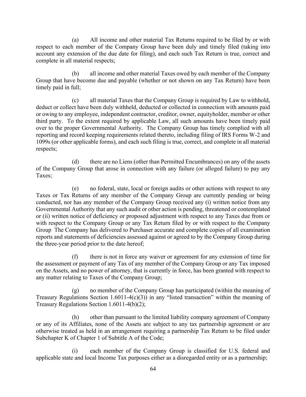 64 (a) All income and other material Tax Returns required to be filed by or with respect to each member of the Company Group have been duly and timely filed (taking into account any extension of the due date for filing), and each such Tax Return is true, correct and complete in all material respects; (b) all income and other material Taxes owed by each member of the Company Group that have become due and payable (whether or not shown on any Tax Return) have been timely paid in full; (c) all material Taxes that the Company Group is required by Law to withhold, deduct or collect have been duly withheld, deducted or collected in connection with amounts paid or owing to any employee, independent contractor, creditor, owner, equityholder, member or other third party. To the extent required by applicable Law, all such amounts have been timely paid over to the proper Governmental Authority. The Company Group has timely complied with all reporting and record keeping requirements related thereto, including filing of IRS Forms W-2 and 1099s (or other applicable forms), and each such filing is true, correct, and complete in all material respects; (d) there are no Liens (other than Permitted Encumbrances) on any of the assets of the Company Group that arose in connection with any failure (or alleged failure) to pay any Taxes; (e) no federal, state, local or foreign audits or other actions with respect to any Taxes or Tax Returns of any member of the Company Group are currently pending or being conducted, nor has any member of the Company Group received any (i) written notice from any Governmental Authority that any such audit or other action is pending, threatened or contemplated or (ii) written notice of deficiency or proposed adjustment with respect to any Taxes due from or with respect to the Company Group or any Tax Return filed by or with respect to the Company Group The Company has delivered to Purchaser accurate and complete copies of all examination reports and statements of deficiencies assessed against or agreed to by the Company Group during the three-year period prior to the date hereof; (f) there is not in force any waiver or agreement for any extension of time for the assessment or payment of any Tax of any member of the Company Group or any Tax imposed on the Assets, and no power of attorney, that is currently in force, has been granted with respect to any matter relating to Taxes of the Company Group; (g) no member of the Company Group has participated (within the meaning of Treasury Regulations Section 1.6011-4(c)(3)) in any “listed transaction” within the meaning of Treasury Regulations Section 1.6011-4(b)(2); (h) other than pursuant to the limited liability company agreement of Company or any of its Affiliates, none of the Assets are subject to any tax partnership agreement or are otherwise treated as held in an arrangement requiring a partnership Tax Return to be filed under Subchapter K of Chapter 1 of Subtitle A of the Code; (i) each member of the Company Group is classified for U.S. federal and applicable state and local Income Tax purposes either as a disregarded entity or as a partnership;