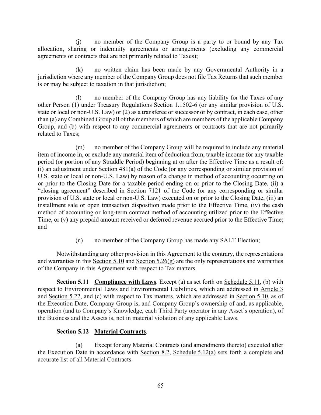 65 (j) no member of the Company Group is a party to or bound by any Tax allocation, sharing or indemnity agreements or arrangements (excluding any commercial agreements or contracts that are not primarily related to Taxes); (k) no written claim has been made by any Governmental Authority in a jurisdiction where any member of the Company Group does not file Tax Returns that such member is or may be subject to taxation in that jurisdiction; (l) no member of the Company Group has any liability for the Taxes of any other Person (1) under Treasury Regulations Section 1.1502-6 (or any similar provision of U.S. state or local or non-U.S. Law) or (2) as a transferee or successor or by contract, in each case, other than (a) any Combined Group all of the members of which are members of the applicable Company Group, and (b) with respect to any commercial agreements or contracts that are not primarily related to Taxes; (m) no member of the Company Group will be required to include any material item of income in, or exclude any material item of deduction from, taxable income for any taxable period (or portion of any Straddle Period) beginning at or after the Effective Time as a result of: (i) an adjustment under Section 481(a) of the Code (or any corresponding or similar provision of U.S. state or local or non-U.S. Law) by reason of a change in method of accounting occurring on or prior to the Closing Date for a taxable period ending on or prior to the Closing Date, (ii) a “closing agreement” described in Section 7121 of the Code (or any corresponding or similar provision of U.S. state or local or non-U.S. Law) executed on or prior to the Closing Date, (iii) an installment sale or open transaction disposition made prior to the Effective Time, (iv) the cash method of accounting or long-term contract method of accounting utilized prior to the Effective Time, or (v) any prepaid amount received or deferred revenue accrued prior to the Effective Time; and (n) no member of the Company Group has made any SALT Election; Notwithstanding any other provision in this Agreement to the contrary, the representations and warranties in this Section 5.10 and Section 5.26(g) are the only representations and warranties of the Company in this Agreement with respect to Tax matters. Section 5.11 Compliance with Laws. Except (a) as set forth on Schedule 5.11, (b) with respect to Environmental Laws and Environmental Liabilities, which are addressed in Article 3 and Section 5.22, and (c) with respect to Tax matters, which are addressed in Section 5.10, as of the Execution Date, Company Group is, and Company Group’s ownership of and, as applicable, operation (and to Company’s Knowledge, each Third Party operator in any Asset’s operation), of the Business and the Assets is, not in material violation of any applicable Laws. Section 5.12 Material Contracts. (a) Except for any Material Contracts (and amendments thereto) executed after the Execution Date in accordance with Section 8.2, Schedule 5.12(a) sets forth a complete and accurate list of all Material Contracts.