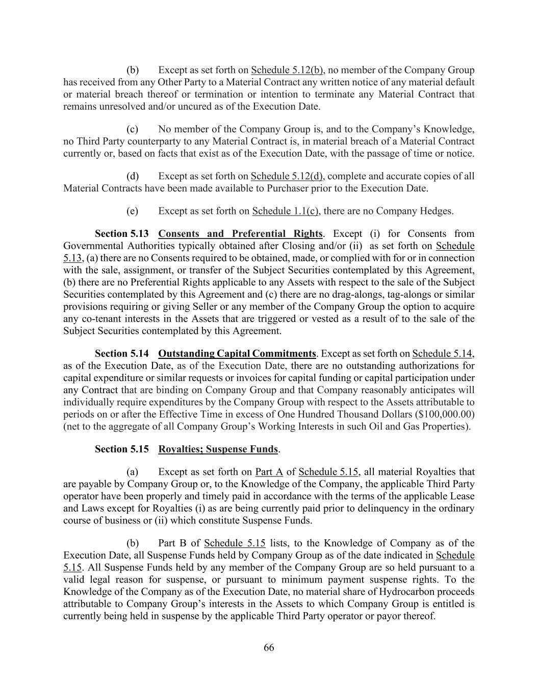 66 (b) Except as set forth on Schedule 5.12(b), no member of the Company Group has received from any Other Party to a Material Contract any written notice of any material default or material breach thereof or termination or intention to terminate any Material Contract that remains unresolved and/or uncured as of the Execution Date. (c) No member of the Company Group is, and to the Company’s Knowledge, no Third Party counterparty to any Material Contract is, in material breach of a Material Contract currently or, based on facts that exist as of the Execution Date, with the passage of time or notice. (d) Except as set forth on Schedule 5.12(d), complete and accurate copies of all Material Contracts have been made available to Purchaser prior to the Execution Date. (e) Except as set forth on Schedule 1.1(c), there are no Company Hedges. Section 5.13 Consents and Preferential Rights. Except (i) for Consents from Governmental Authorities typically obtained after Closing and/or (ii) as set forth on Schedule 5.13, (a) there are no Consents required to be obtained, made, or complied with for or in connection with the sale, assignment, or transfer of the Subject Securities contemplated by this Agreement, (b) there are no Preferential Rights applicable to any Assets with respect to the sale of the Subject Securities contemplated by this Agreement and (c) there are no drag-alongs, tag-alongs or similar provisions requiring or giving Seller or any member of the Company Group the option to acquire any co-tenant interests in the Assets that are triggered or vested as a result of to the sale of the Subject Securities contemplated by this Agreement. Section 5.14 Outstanding Capital Commitments. Except as set forth on Schedule 5.14, as of the Execution Date, as of the Execution Date, there are no outstanding authorizations for capital expenditure or similar requests or invoices for capital funding or capital participation under any Contract that are binding on Company Group and that Company reasonably anticipates will individually require expenditures by the Company Group with respect to the Assets attributable to periods on or after the Effective Time in excess of One Hundred Thousand Dollars ($100,000.00) (net to the aggregate of all Company Group’s Working Interests in such Oil and Gas Properties). Section 5.15 Royalties; Suspense Funds. (a) Except as set forth on Part A of Schedule 5.15, all material Royalties that are payable by Company Group or, to the Knowledge of the Company, the applicable Third Party operator have been properly and timely paid in accordance with the terms of the applicable Lease and Laws except for Royalties (i) as are being currently paid prior to delinquency in the ordinary course of business or (ii) which constitute Suspense Funds. (b) Part B of Schedule 5.15 lists, to the Knowledge of Company as of the Execution Date, all Suspense Funds held by Company Group as of the date indicated in Schedule 5.15. All Suspense Funds held by any member of the Company Group are so held pursuant to a valid legal reason for suspense, or pursuant to minimum payment suspense rights. To the Knowledge of the Company as of the Execution Date, no material share of Hydrocarbon proceeds attributable to Company Group’s interests in the Assets to which Company Group is entitled is currently being held in suspense by the applicable Third Party operator or payor thereof.