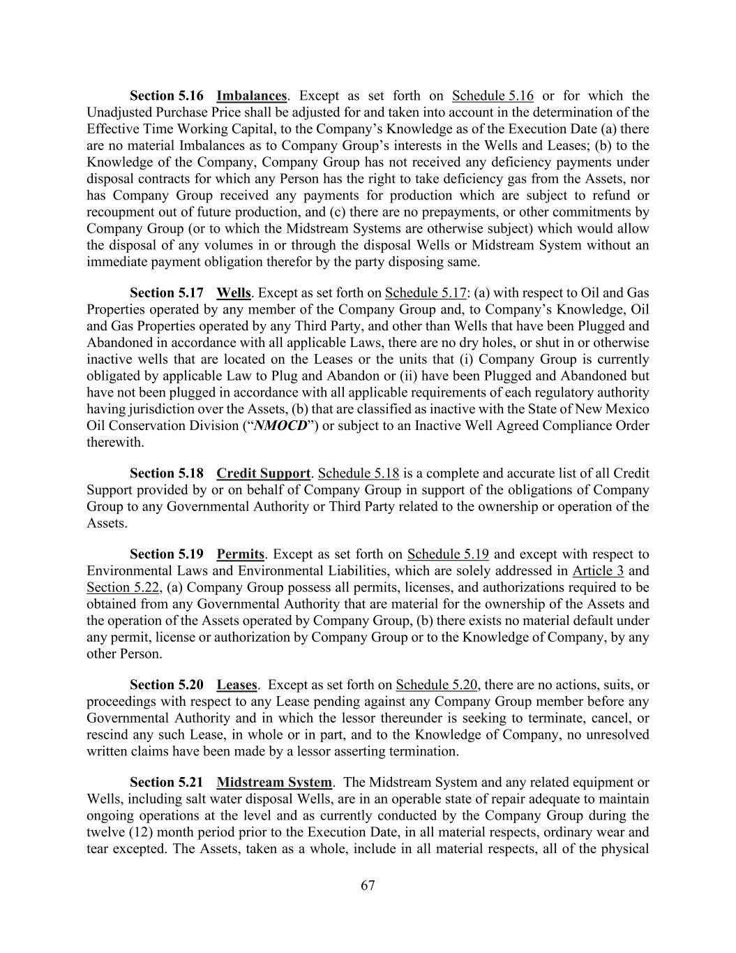 67 Section 5.16 Imbalances. Except as set forth on Schedule 5.16 or for which the Unadjusted Purchase Price shall be adjusted for and taken into account in the determination of the Effective Time Working Capital, to the Company’s Knowledge as of the Execution Date (a) there are no material Imbalances as to Company Group’s interests in the Wells and Leases; (b) to the Knowledge of the Company, Company Group has not received any deficiency payments under disposal contracts for which any Person has the right to take deficiency gas from the Assets, nor has Company Group received any payments for production which are subject to refund or recoupment out of future production, and (c) there are no prepayments, or other commitments by Company Group (or to which the Midstream Systems are otherwise subject) which would allow the disposal of any volumes in or through the disposal Wells or Midstream System without an immediate payment obligation therefor by the party disposing same. Section 5.17 Wells. Except as set forth on Schedule 5.17: (a) with respect to Oil and Gas Properties operated by any member of the Company Group and, to Company’s Knowledge, Oil and Gas Properties operated by any Third Party, and other than Wells that have been Plugged and Abandoned in accordance with all applicable Laws, there are no dry holes, or shut in or otherwise inactive wells that are located on the Leases or the units that (i) Company Group is currently obligated by applicable Law to Plug and Abandon or (ii) have been Plugged and Abandoned but have not been plugged in accordance with all applicable requirements of each regulatory authority having jurisdiction over the Assets, (b) that are classified as inactive with the State of New Mexico Oil Conservation Division (“NMOCD”) or subject to an Inactive Well Agreed Compliance Order therewith. Section 5.18 Credit Support. Schedule 5.18 is a complete and accurate list of all Credit Support provided by or on behalf of Company Group in support of the obligations of Company Group to any Governmental Authority or Third Party related to the ownership or operation of the Assets. Section 5.19 Permits. Except as set forth on Schedule 5.19 and except with respect to Environmental Laws and Environmental Liabilities, which are solely addressed in Article 3 and Section 5.22, (a) Company Group possess all permits, licenses, and authorizations required to be obtained from any Governmental Authority that are material for the ownership of the Assets and the operation of the Assets operated by Company Group, (b) there exists no material default under any permit, license or authorization by Company Group or to the Knowledge of Company, by any other Person. Section 5.20 Leases. Except as set forth on Schedule 5.20, there are no actions, suits, or proceedings with respect to any Lease pending against any Company Group member before any Governmental Authority and in which the lessor thereunder is seeking to terminate, cancel, or rescind any such Lease, in whole or in part, and to the Knowledge of Company, no unresolved written claims have been made by a lessor asserting termination. Section 5.21 Midstream System. The Midstream System and any related equipment or Wells, including salt water disposal Wells, are in an operable state of repair adequate to maintain ongoing operations at the level and as currently conducted by the Company Group during the twelve (12) month period prior to the Execution Date, in all material respects, ordinary wear and tear excepted. The Assets, taken as a whole, include in all material respects, all of the physical