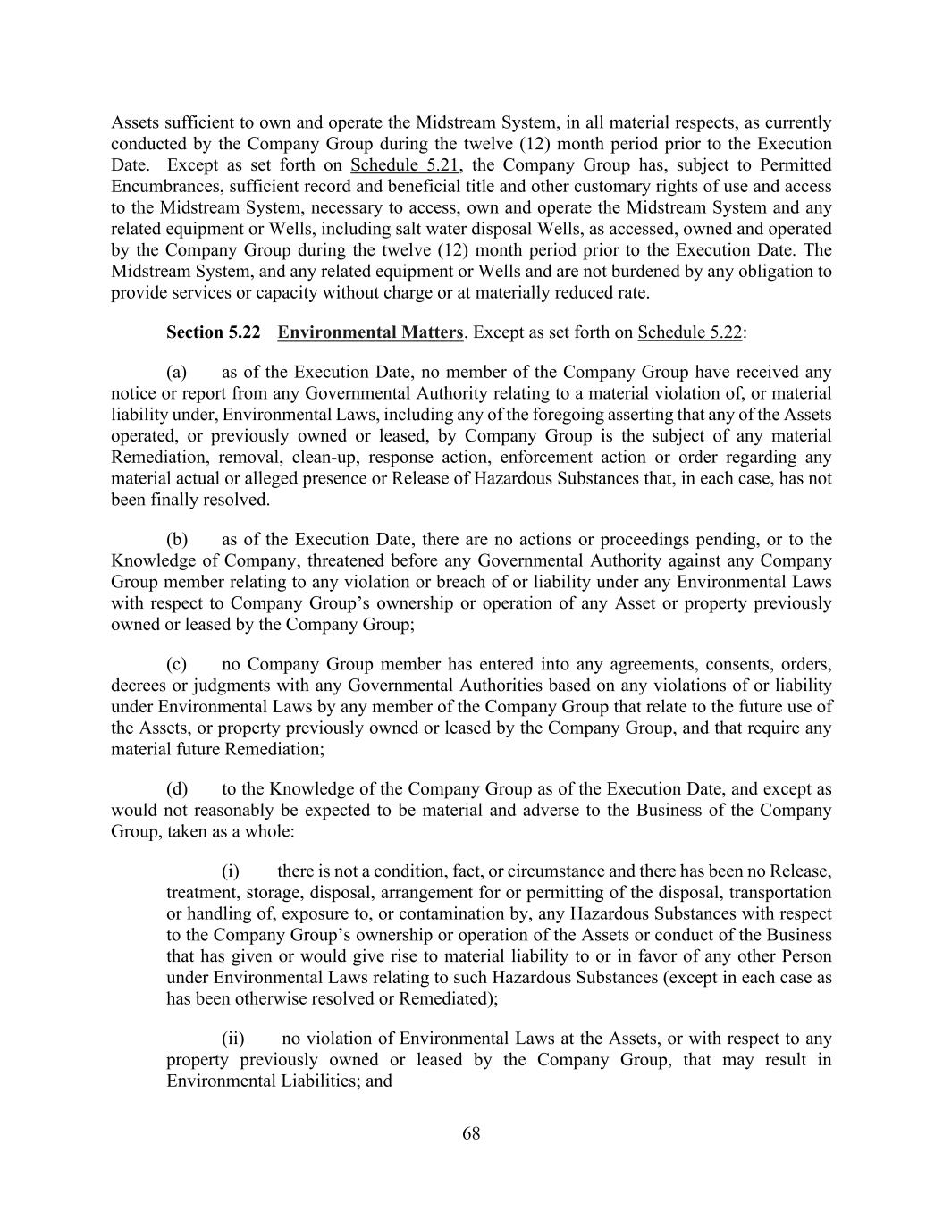 68 Assets sufficient to own and operate the Midstream System, in all material respects, as currently conducted by the Company Group during the twelve (12) month period prior to the Execution Date. Except as set forth on Schedule 5.21, the Company Group has, subject to Permitted Encumbrances, sufficient record and beneficial title and other customary rights of use and access to the Midstream System, necessary to access, own and operate the Midstream System and any related equipment or Wells, including salt water disposal Wells, as accessed, owned and operated by the Company Group during the twelve (12) month period prior to the Execution Date. The Midstream System, and any related equipment or Wells and are not burdened by any obligation to provide services or capacity without charge or at materially reduced rate. Section 5.22 Environmental Matters. Except as set forth on Schedule 5.22: (a) as of the Execution Date, no member of the Company Group have received any notice or report from any Governmental Authority relating to a material violation of, or material liability under, Environmental Laws, including any of the foregoing asserting that any of the Assets operated, or previously owned or leased, by Company Group is the subject of any material Remediation, removal, clean-up, response action, enforcement action or order regarding any material actual or alleged presence or Release of Hazardous Substances that, in each case, has not been finally resolved. (b) as of the Execution Date, there are no actions or proceedings pending, or to the Knowledge of Company, threatened before any Governmental Authority against any Company Group member relating to any violation or breach of or liability under any Environmental Laws with respect to Company Group’s ownership or operation of any Asset or property previously owned or leased by the Company Group; (c) no Company Group member has entered into any agreements, consents, orders, decrees or judgments with any Governmental Authorities based on any violations of or liability under Environmental Laws by any member of the Company Group that relate to the future use of the Assets, or property previously owned or leased by the Company Group, and that require any material future Remediation; (d) to the Knowledge of the Company Group as of the Execution Date, and except as would not reasonably be expected to be material and adverse to the Business of the Company Group, taken as a whole: (i) there is not a condition, fact, or circumstance and there has been no Release, treatment, storage, disposal, arrangement for or permitting of the disposal, transportation or handling of, exposure to, or contamination by, any Hazardous Substances with respect to the Company Group’s ownership or operation of the Assets or conduct of the Business that has given or would give rise to material liability to or in favor of any other Person under Environmental Laws relating to such Hazardous Substances (except in each case as has been otherwise resolved or Remediated); (ii) no violation of Environmental Laws at the Assets, or with respect to any property previously owned or leased by the Company Group, that may result in Environmental Liabilities; and