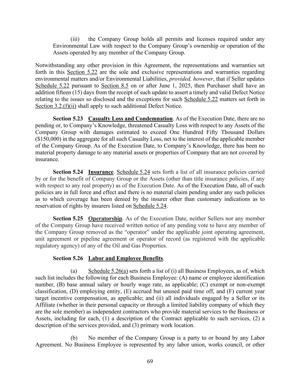 69 (iii) the Company Group holds all permits and licenses required under any Environmental Law with respect to the Company Group’s ownership or operation of the Assets operated by any member of the Company Group. Notwithstanding any other provision in this Agreement, the representations and warranties set forth in this Section 5.22 are the sole and exclusive representations and warranties regarding environmental matters and/or Environmental Liabilities, provided, however, that if Seller updates Schedule 5.22 pursuant to Section 8.5 on or after June 1, 2025, then Purchaser shall have an addition fifteen (15) days from the receipt of such update to assert a timely and valid Defect Notice relating to the issues so disclosed and the exceptions for such Schedule 5.22 matters set forth in Section 3.2.(f)(ii) shall apply to such additional Defect Notice. Section 5.23 Casualty Loss and Condemnation. As of the Execution Date, there are no pending or, to Company’s Knowledge, threatened Casualty Loss with respect to any Assets of the Company Group with damages estimated to exceed One Hundred Fifty Thousand Dollars ($150,000) in the aggregate for all such Casualty Loss, net to the interest of the applicable member of the Company Group. As of the Execution Date, to Company’s Knowledge, there has been no material property damage to any material assets or properties of Company that are not covered by insurance. Section 5.24 Insurance. Schedule 5.24 sets forth a list of all insurance policies carried by or for the benefit of Company Group or the Assets (other than title insurance policies, if any with respect to any real property) as of the Execution Date. As of the Execution Date, all of such policies are in full force and effect and there is no material claim pending under any such policies as to which coverage has been denied by the insurer other than customary indications as to reservation of rights by insurers listed on Schedule 5.24. Section 5.25 Operatorship. As of the Execution Date, neither Sellers nor any member of the Company Group have received written notice of any pending vote to have any member of the Company Group removed as the “operator” under the applicable joint operating agreement, unit agreement or pipeline agreement or operator of record (as registered with the applicable regulatory agency) of any of the Oil and Gas Properties. Section 5.26 Labor and Employee Benefits. (a) Schedule 5.26(a) sets forth a list of (i) all Business Employees, as of, which such list includes the following for each Business Employee: (A) name or employee identification number, (B) base annual salary or hourly wage rate, as applicable; (C) exempt or non-exempt classification, (D) employing entity, (E) accrued but unused paid time off, and (F) current year target incentive compensation, as applicable; and (ii) all individuals engaged by a Seller or its Affiliate (whether in their personal capacity or through a limited liability company of which they are the sole member) as independent contractors who provide material services to the Business or Assets, including for each, (1) a description of the Contract applicable to such services, (2) a description of the services provided, and (3) primary work location. (b) No member of the Company Group is a party to or bound by any Labor Agreement. No Business Employee is represented by any labor union, works council, or other