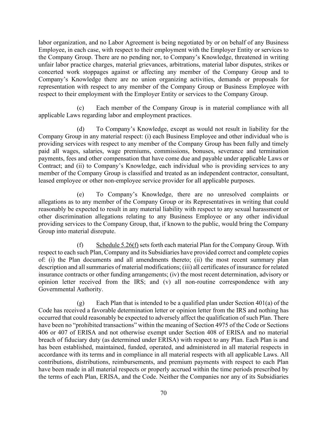 70 labor organization, and no Labor Agreement is being negotiated by or on behalf of any Business Employee, in each case, with respect to their employment with the Employer Entity or services to the Company Group. There are no pending nor, to Company’s Knowledge, threatened in writing unfair labor practice charges, material grievances, arbitrations, material labor disputes, strikes or concerted work stoppages against or affecting any member of the Company Group and to Company’s Knowledge there are no union organizing activities, demands or proposals for representation with respect to any member of the Company Group or Business Employee with respect to their employment with the Employer Entity or services to the Company Group. (c) Each member of the Company Group is in material compliance with all applicable Laws regarding labor and employment practices. (d) To Company’s Knowledge, except as would not result in liability for the Company Group in any material respect: (i) each Business Employee and other individual who is providing services with respect to any member of the Company Group has been fully and timely paid all wages, salaries, wage premiums, commissions, bonuses, severance and termination payments, fees and other compensation that have come due and payable under applicable Laws or Contract; and (ii) to Company’s Knowledge, each individual who is providing services to any member of the Company Group is classified and treated as an independent contractor, consultant, leased employee or other non-employee service provider for all applicable purposes. (e) To Company’s Knowledge, there are no unresolved complaints or allegations as to any member of the Company Group or its Representatives in writing that could reasonably be expected to result in any material liability with respect to any sexual harassment or other discrimination allegations relating to any Business Employee or any other individual providing services to the Company Group, that, if known to the public, would bring the Company Group into material disrepute. (f) Schedule 5.26(f) sets forth each material Plan for the Company Group. With respect to each such Plan, Company and its Subsidiaries have provided correct and complete copies of: (i) the Plan documents and all amendments thereto; (ii) the most recent summary plan description and all summaries of material modifications; (iii) all certificates of insurance for related insurance contracts or other funding arrangements; (iv) the most recent determination, advisory or opinion letter received from the IRS; and (v) all non-routine correspondence with any Governmental Authority. (g) Each Plan that is intended to be a qualified plan under Section 401(a) of the Code has received a favorable determination letter or opinion letter from the IRS and nothing has occurred that could reasonably be expected to adversely affect the qualification of such Plan. There have been no “prohibited transactions” within the meaning of Section 4975 of the Code or Sections 406 or 407 of ERISA and not otherwise exempt under Section 408 of ERISA and no material breach of fiduciary duty (as determined under ERISA) with respect to any Plan. Each Plan is and has been established, maintained, funded, operated, and administered in all material respects in accordance with its terms and in compliance in all material respects with all applicable Laws. All contributions, distributions, reimbursements, and premium payments with respect to each Plan have been made in all material respects or properly accrued within the time periods prescribed by the terms of each Plan, ERISA, and the Code. Neither the Companies nor any of its Subsidiaries