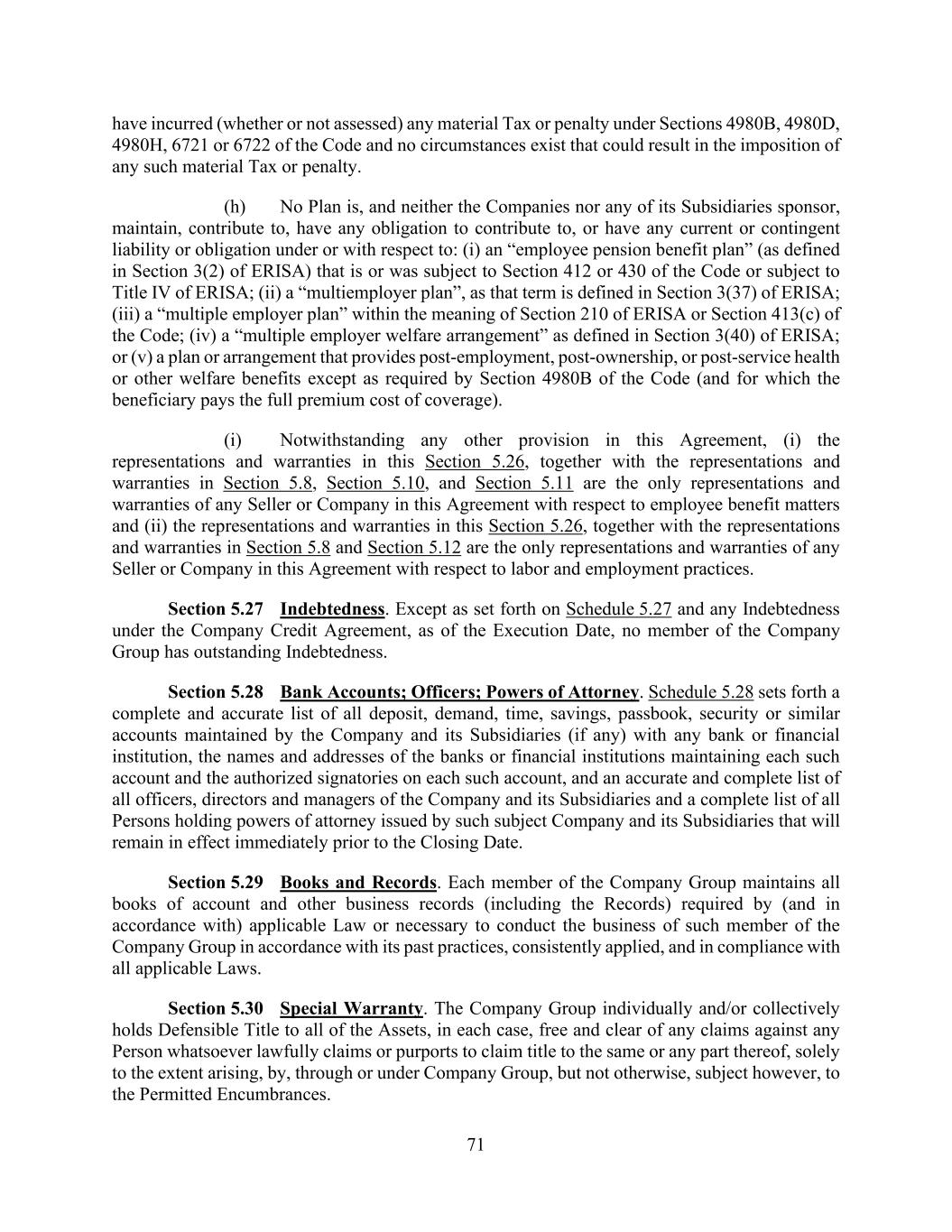 71 have incurred (whether or not assessed) any material Tax or penalty under Sections 4980B, 4980D, 4980H, 6721 or 6722 of the Code and no circumstances exist that could result in the imposition of any such material Tax or penalty. (h) No Plan is, and neither the Companies nor any of its Subsidiaries sponsor, maintain, contribute to, have any obligation to contribute to, or have any current or contingent liability or obligation under or with respect to: (i) an “employee pension benefit plan” (as defined in Section 3(2) of ERISA) that is or was subject to Section 412 or 430 of the Code or subject to Title IV of ERISA; (ii) a “multiemployer plan”, as that term is defined in Section 3(37) of ERISA; (iii) a “multiple employer plan” within the meaning of Section 210 of ERISA or Section 413(c) of the Code; (iv) a “multiple employer welfare arrangement” as defined in Section 3(40) of ERISA; or (v) a plan or arrangement that provides post-employment, post-ownership, or post-service health or other welfare benefits except as required by Section 4980B of the Code (and for which the beneficiary pays the full premium cost of coverage). (i) Notwithstanding any other provision in this Agreement, (i) the representations and warranties in this Section 5.26, together with the representations and warranties in Section 5.8, Section 5.10, and Section 5.11 are the only representations and warranties of any Seller or Company in this Agreement with respect to employee benefit matters and (ii) the representations and warranties in this Section 5.26, together with the representations and warranties in Section 5.8 and Section 5.12 are the only representations and warranties of any Seller or Company in this Agreement with respect to labor and employment practices. Section 5.27 Indebtedness. Except as set forth on Schedule 5.27 and any Indebtedness under the Company Credit Agreement, as of the Execution Date, no member of the Company Group has outstanding Indebtedness. Section 5.28 Bank Accounts; Officers; Powers of Attorney. Schedule 5.28 sets forth a complete and accurate list of all deposit, demand, time, savings, passbook, security or similar accounts maintained by the Company and its Subsidiaries (if any) with any bank or financial institution, the names and addresses of the banks or financial institutions maintaining each such account and the authorized signatories on each such account, and an accurate and complete list of all officers, directors and managers of the Company and its Subsidiaries and a complete list of all Persons holding powers of attorney issued by such subject Company and its Subsidiaries that will remain in effect immediately prior to the Closing Date. Section 5.29 Books and Records. Each member of the Company Group maintains all books of account and other business records (including the Records) required by (and in accordance with) applicable Law or necessary to conduct the business of such member of the Company Group in accordance with its past practices, consistently applied, and in compliance with all applicable Laws. Section 5.30 Special Warranty. The Company Group individually and/or collectively holds Defensible Title to all of the Assets, in each case, free and clear of any claims against any Person whatsoever lawfully claims or purports to claim title to the same or any part thereof, solely to the extent arising, by, through or under Company Group, but not otherwise, subject however, to the Permitted Encumbrances.