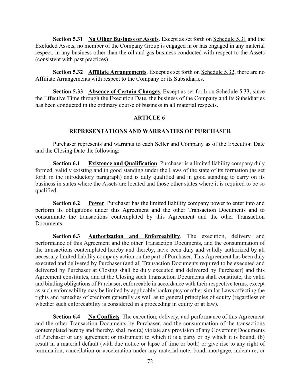 72 Section 5.31 No Other Business or Assets. Except as set forth on Schedule 5.31 and the Excluded Assets, no member of the Company Group is engaged in or has engaged in any material respect, in any business other than the oil and gas business conducted with respect to the Assets (consistent with past practices). Section 5.32 Affiliate Arrangements. Except as set forth on Schedule 5.32, there are no Affiliate Arrangements with respect to the Company or its Subsidiaries. Section 5.33 Absence of Certain Changes. Except as set forth on Schedule 5.33, since the Effective Time through the Execution Date, the business of the Company and its Subsidiaries has been conducted in the ordinary course of business in all material respects. ARTICLE 6 REPRESENTATIONS AND WARRANTIES OF PURCHASER Purchaser represents and warrants to each Seller and Company as of the Execution Date and the Closing Date the following: Section 6.1 Existence and Qualification. Purchaser is a limited liability company duly formed, validly existing and in good standing under the Laws of the state of its formation (as set forth in the introductory paragraph) and is duly qualified and in good standing to carry on its business in states where the Assets are located and those other states where it is required to be so qualified. Section 6.2 Power. Purchaser has the limited liability company power to enter into and perform its obligations under this Agreement and the other Transaction Documents and to consummate the transactions contemplated by this Agreement and the other Transaction Documents. Section 6.3 Authorization and Enforceability. The execution, delivery and performance of this Agreement and the other Transaction Documents, and the consummation of the transactions contemplated hereby and thereby, have been duly and validly authorized by all necessary limited liability company action on the part of Purchaser. This Agreement has been duly executed and delivered by Purchaser (and all Transaction Documents required to be executed and delivered by Purchaser at Closing shall be duly executed and delivered by Purchaser) and this Agreement constitutes, and at the Closing such Transaction Documents shall constitute, the valid and binding obligations of Purchaser, enforceable in accordance with their respective terms, except as such enforceability may be limited by applicable bankruptcy or other similar Laws affecting the rights and remedies of creditors generally as well as to general principles of equity (regardless of whether such enforceability is considered in a proceeding in equity or at law). Section 6.4 No Conflicts. The execution, delivery, and performance of this Agreement and the other Transaction Documents by Purchaser, and the consummation of the transactions contemplated hereby and thereby, shall not (a) violate any provision of any Governing Documents of Purchaser or any agreement or instrument to which it is a party or by which it is bound, (b) result in a material default (with due notice or lapse of time or both) or give rise to any right of termination, cancellation or acceleration under any material note, bond, mortgage, indenture, or