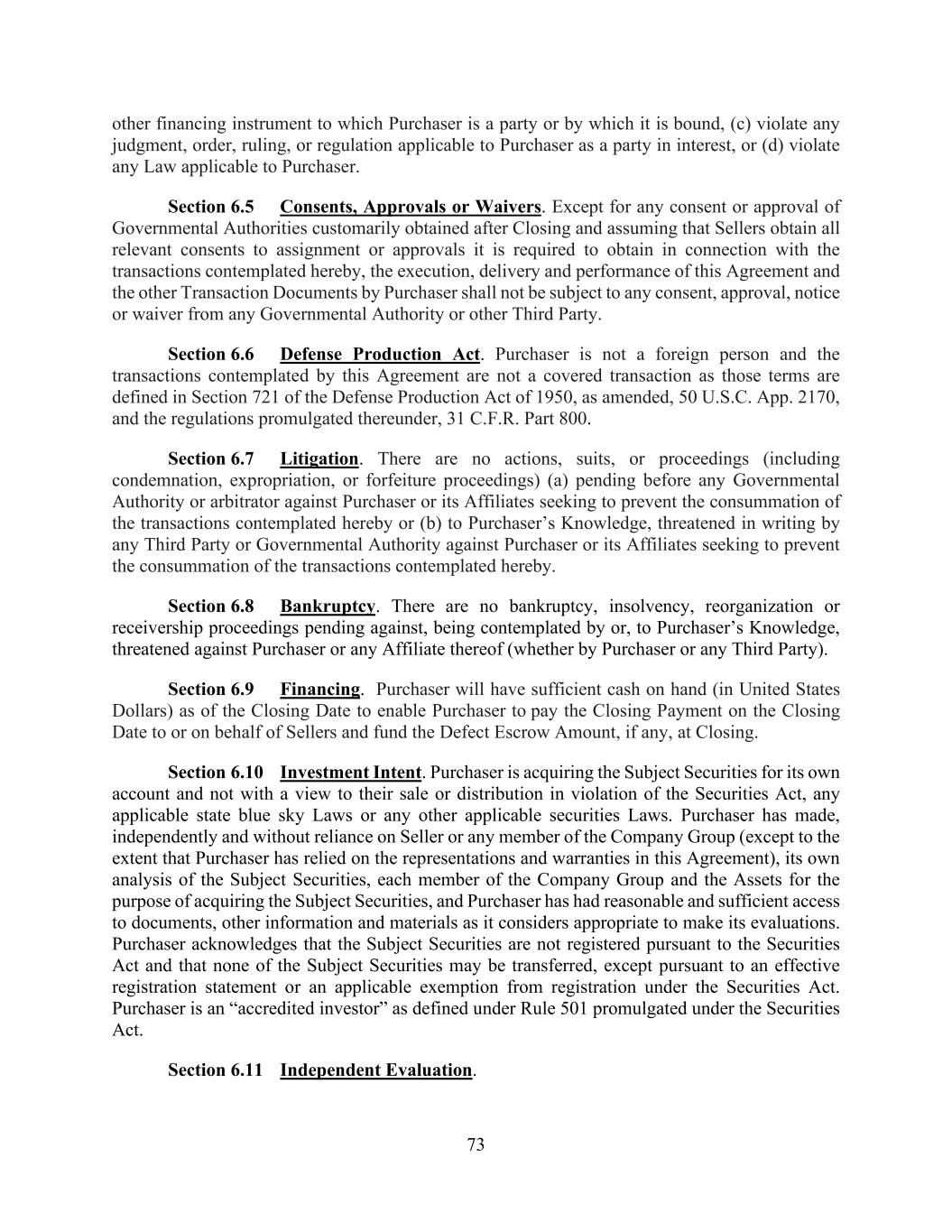 73 other financing instrument to which Purchaser is a party or by which it is bound, (c) violate any judgment, order, ruling, or regulation applicable to Purchaser as a party in interest, or (d) violate any Law applicable to Purchaser. Section 6.5 Consents, Approvals or Waivers. Except for any consent or approval of Governmental Authorities customarily obtained after Closing and assuming that Sellers obtain all relevant consents to assignment or approvals it is required to obtain in connection with the transactions contemplated hereby, the execution, delivery and performance of this Agreement and the other Transaction Documents by Purchaser shall not be subject to any consent, approval, notice or waiver from any Governmental Authority or other Third Party. Section 6.6 Defense Production Act. Purchaser is not a foreign person and the transactions contemplated by this Agreement are not a covered transaction as those terms are defined in Section 721 of the Defense Production Act of 1950, as amended, 50 U.S.C. App. 2170, and the regulations promulgated thereunder, 31 C.F.R. Part 800. Section 6.7 Litigation. There are no actions, suits, or proceedings (including condemnation, expropriation, or forfeiture proceedings) (a) pending before any Governmental Authority or arbitrator against Purchaser or its Affiliates seeking to prevent the consummation of the transactions contemplated hereby or (b) to Purchaser’s Knowledge, threatened in writing by any Third Party or Governmental Authority against Purchaser or its Affiliates seeking to prevent the consummation of the transactions contemplated hereby. Section 6.8 Bankruptcy. There are no bankruptcy, insolvency, reorganization or receivership proceedings pending against, being contemplated by or, to Purchaser’s Knowledge, threatened against Purchaser or any Affiliate thereof (whether by Purchaser or any Third Party). Section 6.9 Financing. Purchaser will have sufficient cash on hand (in United States Dollars) as of the Closing Date to enable Purchaser to pay the Closing Payment on the Closing Date to or on behalf of Sellers and fund the Defect Escrow Amount, if any, at Closing. Section 6.10 Investment Intent. Purchaser is acquiring the Subject Securities for its own account and not with a view to their sale or distribution in violation of the Securities Act, any applicable state blue sky Laws or any other applicable securities Laws. Purchaser has made, independently and without reliance on Seller or any member of the Company Group (except to the extent that Purchaser has relied on the representations and warranties in this Agreement), its own analysis of the Subject Securities, each member of the Company Group and the Assets for the purpose of acquiring the Subject Securities, and Purchaser has had reasonable and sufficient access to documents, other information and materials as it considers appropriate to make its evaluations. Purchaser acknowledges that the Subject Securities are not registered pursuant to the Securities Act and that none of the Subject Securities may be transferred, except pursuant to an effective registration statement or an applicable exemption from registration under the Securities Act. Purchaser is an “accredited investor” as defined under Rule 501 promulgated under the Securities Act. Section 6.11 Independent Evaluation.