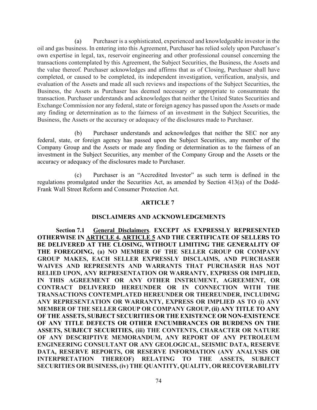74 (a) Purchaser is a sophisticated, experienced and knowledgeable investor in the oil and gas business. In entering into this Agreement, Purchaser has relied solely upon Purchaser’s own expertise in legal, tax, reservoir engineering and other professional counsel concerning the transactions contemplated by this Agreement, the Subject Securities, the Business, the Assets and the value thereof. Purchaser acknowledges and affirms that as of Closing, Purchaser shall have completed, or caused to be completed, its independent investigation, verification, analysis, and evaluation of the Assets and made all such reviews and inspections of the Subject Securities, the Business, the Assets as Purchaser has deemed necessary or appropriate to consummate the transaction. Purchaser understands and acknowledges that neither the United States Securities and Exchange Commission nor any federal, state or foreign agency has passed upon the Assets or made any finding or determination as to the fairness of an investment in the Subject Securities, the Business, the Assets or the accuracy or adequacy of the disclosures made to Purchaser. (b) Purchaser understands and acknowledges that neither the SEC nor any federal, state, or foreign agency has passed upon the Subject Securities, any member of the Company Group and the Assets or made any finding or determination as to the fairness of an investment in the Subject Securities, any member of the Company Group and the Assets or the accuracy or adequacy of the disclosures made to Purchaser. (c) Purchaser is an “Accredited Investor” as such term is defined in the regulations promulgated under the Securities Act, as amended by Section 413(a) of the Dodd- Frank Wall Street Reform and Consumer Protection Act. ARTICLE 7 DISCLAIMERS AND ACKNOWLEDGEMENTS Section 7.1 General Disclaimers. EXCEPT AS EXPRESSLY REPRESENTED OTHERWISE IN ARTICLE 4, ARTICLE 5 AND THE CERTIFICATE OF SELLERS TO BE DELIVERED AT THE CLOSING, WITHOUT LIMITING THE GENERALITY OF THE FOREGOING, (a) NO MEMBER OF THE SELLER GROUP OR COMPANY GROUP MAKES, EACH SELLER EXPRESSLY DISCLAIMS, AND PURCHASER WAIVES AND REPRESENTS AND WARRANTS THAT PURCHASER HAS NOT RELIED UPON, ANY REPRESENTATION OR WARRANTY, EXPRESS OR IMPLIED, IN THIS AGREEMENT OR ANY OTHER INSTRUMENT, AGREEMENT, OR CONTRACT DELIVERED HEREUNDER OR IN CONNECTION WITH THE TRANSACTIONS CONTEMPLATED HEREUNDER OR THEREUNDER, INCLUDING ANY REPRESENTATION OR WARRANTY, EXPRESS OR IMPLIED AS TO (i) ANY MEMBER OF THE SELLER GROUP OR COMPANY GROUP, (ii) ANY TITLE TO ANY OF THE ASSETS, SUBJECT SECURITIES OR THE EXISTENCE OR NON-EXISTENCE OF ANY TITLE DEFECTS OR OTHER ENCUMBRANCES OR BURDENS ON THE ASSETS, SUBJECT SECURITIES, (iii) THE CONTENTS, CHARACTER OR NATURE OF ANY DESCRIPTIVE MEMORANDUM, ANY REPORT OF ANY PETROLEUM ENGINEERING CONSULTANT OR ANY GEOLOGICAL, SEISMIC DATA, RESERVE DATA, RESERVE REPORTS, OR RESERVE INFORMATION (ANY ANALYSIS OR INTERPRETATION THEREOF) RELATING TO THE ASSETS, SUBJECT SECURITIES OR BUSINESS, (iv) THE QUANTITY, QUALITY, OR RECOVERABILITY