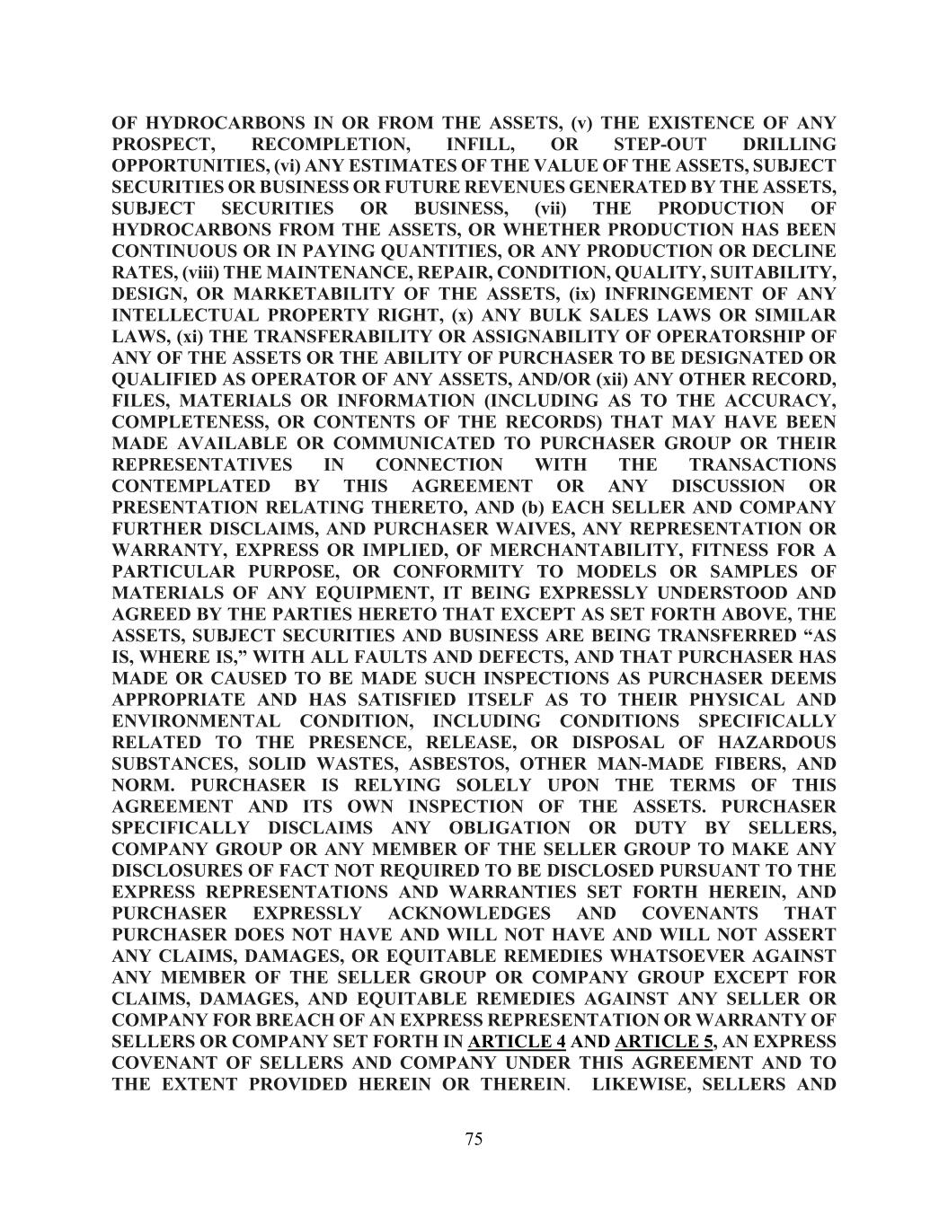 75 OF HYDROCARBONS IN OR FROM THE ASSETS, (v) THE EXISTENCE OF ANY PROSPECT, RECOMPLETION, INFILL, OR STEP-OUT DRILLING OPPORTUNITIES, (vi) ANY ESTIMATES OF THE VALUE OF THE ASSETS, SUBJECT SECURITIES OR BUSINESS OR FUTURE REVENUES GENERATED BY THE ASSETS, SUBJECT SECURITIES OR BUSINESS, (vii) THE PRODUCTION OF HYDROCARBONS FROM THE ASSETS, OR WHETHER PRODUCTION HAS BEEN CONTINUOUS OR IN PAYING QUANTITIES, OR ANY PRODUCTION OR DECLINE RATES, (viii) THE MAINTENANCE, REPAIR, CONDITION, QUALITY, SUITABILITY, DESIGN, OR MARKETABILITY OF THE ASSETS, (ix) INFRINGEMENT OF ANY INTELLECTUAL PROPERTY RIGHT, (x) ANY BULK SALES LAWS OR SIMILAR LAWS, (xi) THE TRANSFERABILITY OR ASSIGNABILITY OF OPERATORSHIP OF ANY OF THE ASSETS OR THE ABILITY OF PURCHASER TO BE DESIGNATED OR QUALIFIED AS OPERATOR OF ANY ASSETS, AND/OR (xii) ANY OTHER RECORD, FILES, MATERIALS OR INFORMATION (INCLUDING AS TO THE ACCURACY, COMPLETENESS, OR CONTENTS OF THE RECORDS) THAT MAY HAVE BEEN MADE AVAILABLE OR COMMUNICATED TO PURCHASER GROUP OR THEIR REPRESENTATIVES IN CONNECTION WITH THE TRANSACTIONS CONTEMPLATED BY THIS AGREEMENT OR ANY DISCUSSION OR PRESENTATION RELATING THERETO, AND (b) EACH SELLER AND COMPANY FURTHER DISCLAIMS, AND PURCHASER WAIVES, ANY REPRESENTATION OR WARRANTY, EXPRESS OR IMPLIED, OF MERCHANTABILITY, FITNESS FOR A PARTICULAR PURPOSE, OR CONFORMITY TO MODELS OR SAMPLES OF MATERIALS OF ANY EQUIPMENT, IT BEING EXPRESSLY UNDERSTOOD AND AGREED BY THE PARTIES HERETO THAT EXCEPT AS SET FORTH ABOVE, THE ASSETS, SUBJECT SECURITIES AND BUSINESS ARE BEING TRANSFERRED “AS IS, WHERE IS,” WITH ALL FAULTS AND DEFECTS, AND THAT PURCHASER HAS MADE OR CAUSED TO BE MADE SUCH INSPECTIONS AS PURCHASER DEEMS APPROPRIATE AND HAS SATISFIED ITSELF AS TO THEIR PHYSICAL AND ENVIRONMENTAL CONDITION, INCLUDING CONDITIONS SPECIFICALLY RELATED TO THE PRESENCE, RELEASE, OR DISPOSAL OF HAZARDOUS SUBSTANCES, SOLID WASTES, ASBESTOS, OTHER MAN-MADE FIBERS, AND NORM. PURCHASER IS RELYING SOLELY UPON THE TERMS OF THIS AGREEMENT AND ITS OWN INSPECTION OF THE ASSETS. PURCHASER SPECIFICALLY DISCLAIMS ANY OBLIGATION OR DUTY BY SELLERS, COMPANY GROUP OR ANY MEMBER OF THE SELLER GROUP TO MAKE ANY DISCLOSURES OF FACT NOT REQUIRED TO BE DISCLOSED PURSUANT TO THE EXPRESS REPRESENTATIONS AND WARRANTIES SET FORTH HEREIN, AND PURCHASER EXPRESSLY ACKNOWLEDGES AND COVENANTS THAT PURCHASER DOES NOT HAVE AND WILL NOT HAVE AND WILL NOT ASSERT ANY CLAIMS, DAMAGES, OR EQUITABLE REMEDIES WHATSOEVER AGAINST ANY MEMBER OF THE SELLER GROUP OR COMPANY GROUP EXCEPT FOR CLAIMS, DAMAGES, AND EQUITABLE REMEDIES AGAINST ANY SELLER OR COMPANY FOR BREACH OF AN EXPRESS REPRESENTATION OR WARRANTY OF SELLERS OR COMPANY SET FORTH IN ARTICLE 4 AND ARTICLE 5, AN EXPRESS COVENANT OF SELLERS AND COMPANY UNDER THIS AGREEMENT AND TO THE EXTENT PROVIDED HEREIN OR THEREIN. LIKEWISE, SELLERS AND