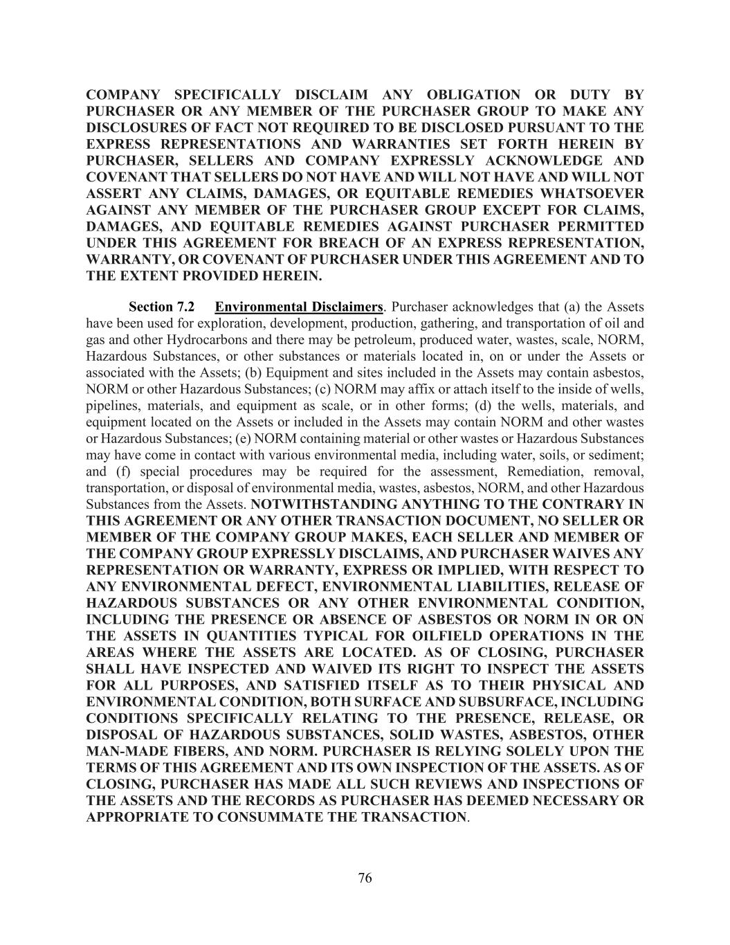 76 COMPANY SPECIFICALLY DISCLAIM ANY OBLIGATION OR DUTY BY PURCHASER OR ANY MEMBER OF THE PURCHASER GROUP TO MAKE ANY DISCLOSURES OF FACT NOT REQUIRED TO BE DISCLOSED PURSUANT TO THE EXPRESS REPRESENTATIONS AND WARRANTIES SET FORTH HEREIN BY PURCHASER, SELLERS AND COMPANY EXPRESSLY ACKNOWLEDGE AND COVENANT THAT SELLERS DO NOT HAVE AND WILL NOT HAVE AND WILL NOT ASSERT ANY CLAIMS, DAMAGES, OR EQUITABLE REMEDIES WHATSOEVER AGAINST ANY MEMBER OF THE PURCHASER GROUP EXCEPT FOR CLAIMS, DAMAGES, AND EQUITABLE REMEDIES AGAINST PURCHASER PERMITTED UNDER THIS AGREEMENT FOR BREACH OF AN EXPRESS REPRESENTATION, WARRANTY, OR COVENANT OF PURCHASER UNDER THIS AGREEMENT AND TO THE EXTENT PROVIDED HEREIN. Section 7.2 Environmental Disclaimers. Purchaser acknowledges that (a) the Assets have been used for exploration, development, production, gathering, and transportation of oil and gas and other Hydrocarbons and there may be petroleum, produced water, wastes, scale, NORM, Hazardous Substances, or other substances or materials located in, on or under the Assets or associated with the Assets; (b) Equipment and sites included in the Assets may contain asbestos, NORM or other Hazardous Substances; (c) NORM may affix or attach itself to the inside of wells, pipelines, materials, and equipment as scale, or in other forms; (d) the wells, materials, and equipment located on the Assets or included in the Assets may contain NORM and other wastes or Hazardous Substances; (e) NORM containing material or other wastes or Hazardous Substances may have come in contact with various environmental media, including water, soils, or sediment; and (f) special procedures may be required for the assessment, Remediation, removal, transportation, or disposal of environmental media, wastes, asbestos, NORM, and other Hazardous Substances from the Assets. NOTWITHSTANDING ANYTHING TO THE CONTRARY IN THIS AGREEMENT OR ANY OTHER TRANSACTION DOCUMENT, NO SELLER OR MEMBER OF THE COMPANY GROUP MAKES, EACH SELLER AND MEMBER OF THE COMPANY GROUP EXPRESSLY DISCLAIMS, AND PURCHASER WAIVES ANY REPRESENTATION OR WARRANTY, EXPRESS OR IMPLIED, WITH RESPECT TO ANY ENVIRONMENTAL DEFECT, ENVIRONMENTAL LIABILITIES, RELEASE OF HAZARDOUS SUBSTANCES OR ANY OTHER ENVIRONMENTAL CONDITION, INCLUDING THE PRESENCE OR ABSENCE OF ASBESTOS OR NORM IN OR ON THE ASSETS IN QUANTITIES TYPICAL FOR OILFIELD OPERATIONS IN THE AREAS WHERE THE ASSETS ARE LOCATED. AS OF CLOSING, PURCHASER SHALL HAVE INSPECTED AND WAIVED ITS RIGHT TO INSPECT THE ASSETS FOR ALL PURPOSES, AND SATISFIED ITSELF AS TO THEIR PHYSICAL AND ENVIRONMENTAL CONDITION, BOTH SURFACE AND SUBSURFACE, INCLUDING CONDITIONS SPECIFICALLY RELATING TO THE PRESENCE, RELEASE, OR DISPOSAL OF HAZARDOUS SUBSTANCES, SOLID WASTES, ASBESTOS, OTHER MAN-MADE FIBERS, AND NORM. PURCHASER IS RELYING SOLELY UPON THE TERMS OF THIS AGREEMENT AND ITS OWN INSPECTION OF THE ASSETS. AS OF CLOSING, PURCHASER HAS MADE ALL SUCH REVIEWS AND INSPECTIONS OF THE ASSETS AND THE RECORDS AS PURCHASER HAS DEEMED NECESSARY OR APPROPRIATE TO CONSUMMATE THE TRANSACTION.