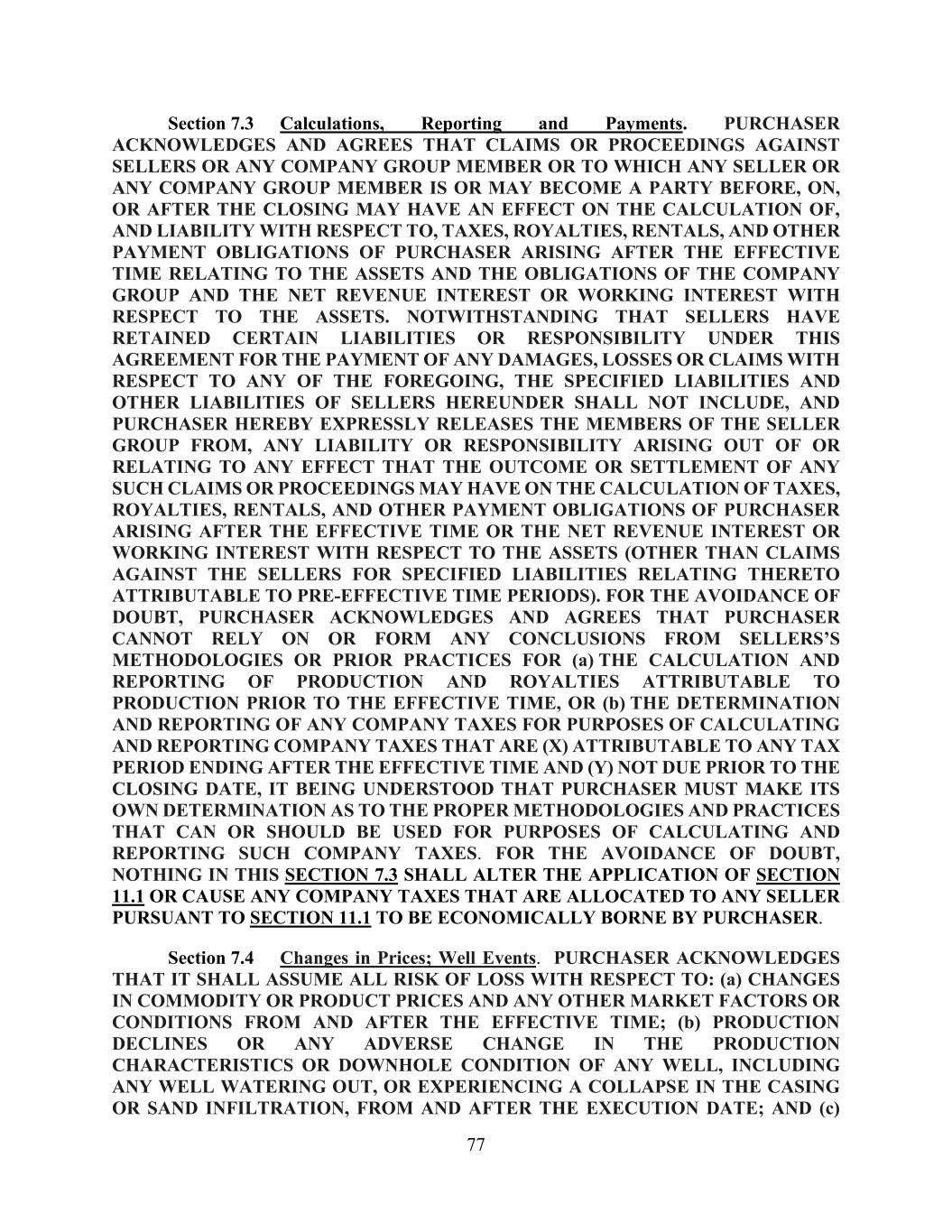 77 Section 7.3 Calculations, Reporting and Payments. PURCHASER ACKNOWLEDGES AND AGREES THAT CLAIMS OR PROCEEDINGS AGAINST SELLERS OR ANY COMPANY GROUP MEMBER OR TO WHICH ANY SELLER OR ANY COMPANY GROUP MEMBER IS OR MAY BECOME A PARTY BEFORE, ON, OR AFTER THE CLOSING MAY HAVE AN EFFECT ON THE CALCULATION OF, AND LIABILITY WITH RESPECT TO, TAXES, ROYALTIES, RENTALS, AND OTHER PAYMENT OBLIGATIONS OF PURCHASER ARISING AFTER THE EFFECTIVE TIME RELATING TO THE ASSETS AND THE OBLIGATIONS OF THE COMPANY GROUP AND THE NET REVENUE INTEREST OR WORKING INTEREST WITH RESPECT TO THE ASSETS. NOTWITHSTANDING THAT SELLERS HAVE RETAINED CERTAIN LIABILITIES OR RESPONSIBILITY UNDER THIS AGREEMENT FOR THE PAYMENT OF ANY DAMAGES, LOSSES OR CLAIMS WITH RESPECT TO ANY OF THE FOREGOING, THE SPECIFIED LIABILITIES AND OTHER LIABILITIES OF SELLERS HEREUNDER SHALL NOT INCLUDE, AND PURCHASER HEREBY EXPRESSLY RELEASES THE MEMBERS OF THE SELLER GROUP FROM, ANY LIABILITY OR RESPONSIBILITY ARISING OUT OF OR RELATING TO ANY EFFECT THAT THE OUTCOME OR SETTLEMENT OF ANY SUCH CLAIMS OR PROCEEDINGS MAY HAVE ON THE CALCULATION OF TAXES, ROYALTIES, RENTALS, AND OTHER PAYMENT OBLIGATIONS OF PURCHASER ARISING AFTER THE EFFECTIVE TIME OR THE NET REVENUE INTEREST OR WORKING INTEREST WITH RESPECT TO THE ASSETS (OTHER THAN CLAIMS AGAINST THE SELLERS FOR SPECIFIED LIABILITIES RELATING THERETO ATTRIBUTABLE TO PRE-EFFECTIVE TIME PERIODS). FOR THE AVOIDANCE OF DOUBT, PURCHASER ACKNOWLEDGES AND AGREES THAT PURCHASER CANNOT RELY ON OR FORM ANY CONCLUSIONS FROM SELLERS’S METHODOLOGIES OR PRIOR PRACTICES FOR (a) THE CALCULATION AND REPORTING OF PRODUCTION AND ROYALTIES ATTRIBUTABLE TO PRODUCTION PRIOR TO THE EFFECTIVE TIME, OR (b) THE DETERMINATION AND REPORTING OF ANY COMPANY TAXES FOR PURPOSES OF CALCULATING AND REPORTING COMPANY TAXES THAT ARE (X) ATTRIBUTABLE TO ANY TAX PERIOD ENDING AFTER THE EFFECTIVE TIME AND (Y) NOT DUE PRIOR TO THE CLOSING DATE, IT BEING UNDERSTOOD THAT PURCHASER MUST MAKE ITS OWN DETERMINATION AS TO THE PROPER METHODOLOGIES AND PRACTICES THAT CAN OR SHOULD BE USED FOR PURPOSES OF CALCULATING AND REPORTING SUCH COMPANY TAXES. FOR THE AVOIDANCE OF DOUBT, NOTHING IN THIS SECTION 7.3 SHALL ALTER THE APPLICATION OF SECTION 11.1 OR CAUSE ANY COMPANY TAXES THAT ARE ALLOCATED TO ANY SELLER PURSUANT TO SECTION 11.1 TO BE ECONOMICALLY BORNE BY PURCHASER. Section 7.4 Changes in Prices; Well Events. PURCHASER ACKNOWLEDGES THAT IT SHALL ASSUME ALL RISK OF LOSS WITH RESPECT TO: (a) CHANGES IN COMMODITY OR PRODUCT PRICES AND ANY OTHER MARKET FACTORS OR CONDITIONS FROM AND AFTER THE EFFECTIVE TIME; (b) PRODUCTION DECLINES OR ANY ADVERSE CHANGE IN THE PRODUCTION CHARACTERISTICS OR DOWNHOLE CONDITION OF ANY WELL, INCLUDING ANY WELL WATERING OUT, OR EXPERIENCING A COLLAPSE IN THE CASING OR SAND INFILTRATION, FROM AND AFTER THE EXECUTION DATE; AND (c)
