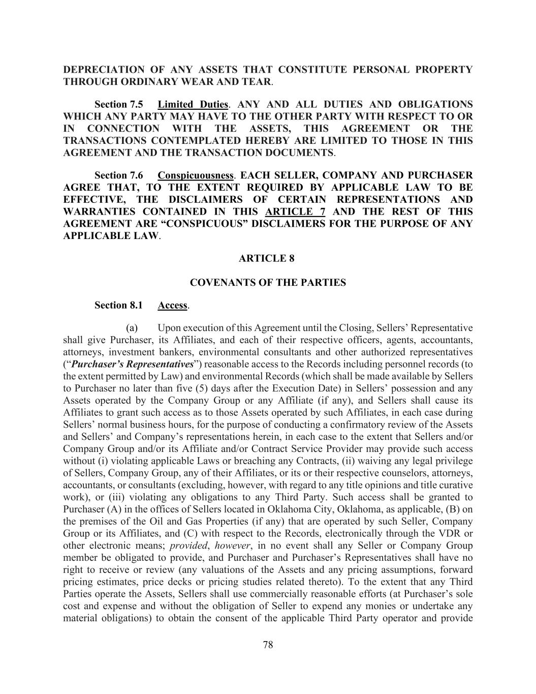 78 DEPRECIATION OF ANY ASSETS THAT CONSTITUTE PERSONAL PROPERTY THROUGH ORDINARY WEAR AND TEAR. Section 7.5 Limited Duties. ANY AND ALL DUTIES AND OBLIGATIONS WHICH ANY PARTY MAY HAVE TO THE OTHER PARTY WITH RESPECT TO OR IN CONNECTION WITH THE ASSETS, THIS AGREEMENT OR THE TRANSACTIONS CONTEMPLATED HEREBY ARE LIMITED TO THOSE IN THIS AGREEMENT AND THE TRANSACTION DOCUMENTS. Section 7.6 Conspicuousness. EACH SELLER, COMPANY AND PURCHASER AGREE THAT, TO THE EXTENT REQUIRED BY APPLICABLE LAW TO BE EFFECTIVE, THE DISCLAIMERS OF CERTAIN REPRESENTATIONS AND WARRANTIES CONTAINED IN THIS ARTICLE 7 AND THE REST OF THIS AGREEMENT ARE “CONSPICUOUS” DISCLAIMERS FOR THE PURPOSE OF ANY APPLICABLE LAW. ARTICLE 8 COVENANTS OF THE PARTIES Section 8.1 Access. (a) Upon execution of this Agreement until the Closing, Sellers’ Representative shall give Purchaser, its Affiliates, and each of their respective officers, agents, accountants, attorneys, investment bankers, environmental consultants and other authorized representatives (“Purchaser’s Representatives”) reasonable access to the Records including personnel records (to the extent permitted by Law) and environmental Records (which shall be made available by Sellers to Purchaser no later than five (5) days after the Execution Date) in Sellers’ possession and any Assets operated by the Company Group or any Affiliate (if any), and Sellers shall cause its Affiliates to grant such access as to those Assets operated by such Affiliates, in each case during Sellers’ normal business hours, for the purpose of conducting a confirmatory review of the Assets and Sellers’ and Company’s representations herein, in each case to the extent that Sellers and/or Company Group and/or its Affiliate and/or Contract Service Provider may provide such access without (i) violating applicable Laws or breaching any Contracts, (ii) waiving any legal privilege of Sellers, Company Group, any of their Affiliates, or its or their respective counselors, attorneys, accountants, or consultants (excluding, however, with regard to any title opinions and title curative work), or (iii) violating any obligations to any Third Party. Such access shall be granted to Purchaser (A) in the offices of Sellers located in Oklahoma City, Oklahoma, as applicable, (B) on the premises of the Oil and Gas Properties (if any) that are operated by such Seller, Company Group or its Affiliates, and (C) with respect to the Records, electronically through the VDR or other electronic means; provided, however, in no event shall any Seller or Company Group member be obligated to provide, and Purchaser and Purchaser’s Representatives shall have no right to receive or review (any valuations of the Assets and any pricing assumptions, forward pricing estimates, price decks or pricing studies related thereto). To the extent that any Third Parties operate the Assets, Sellers shall use commercially reasonable efforts (at Purchaser’s sole cost and expense and without the obligation of Seller to expend any monies or undertake any material obligations) to obtain the consent of the applicable Third Party operator and provide