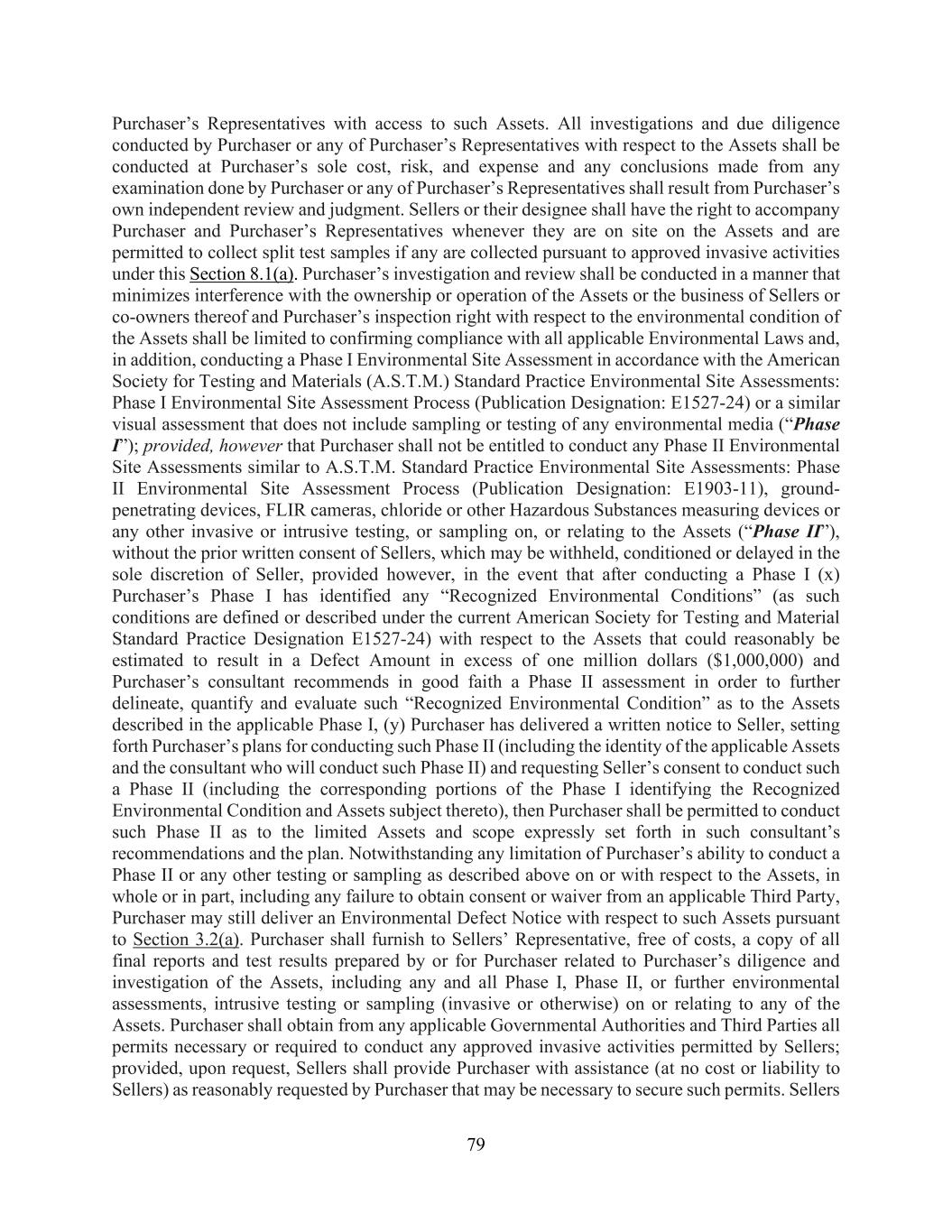 79 Purchaser’s Representatives with access to such Assets. All investigations and due diligence conducted by Purchaser or any of Purchaser’s Representatives with respect to the Assets shall be conducted at Purchaser’s sole cost, risk, and expense and any conclusions made from any examination done by Purchaser or any of Purchaser’s Representatives shall result from Purchaser’s own independent review and judgment. Sellers or their designee shall have the right to accompany Purchaser and Purchaser’s Representatives whenever they are on site on the Assets and are permitted to collect split test samples if any are collected pursuant to approved invasive activities under this Section 8.1(a). Purchaser’s investigation and review shall be conducted in a manner that minimizes interference with the ownership or operation of the Assets or the business of Sellers or co-owners thereof and Purchaser’s inspection right with respect to the environmental condition of the Assets shall be limited to confirming compliance with all applicable Environmental Laws and, in addition, conducting a Phase I Environmental Site Assessment in accordance with the American Society for Testing and Materials (A.S.T.M.) Standard Practice Environmental Site Assessments: Phase I Environmental Site Assessment Process (Publication Designation: E1527-24) or a similar visual assessment that does not include sampling or testing of any environmental media (“Phase I”); provided, however that Purchaser shall not be entitled to conduct any Phase II Environmental Site Assessments similar to A.S.T.M. Standard Practice Environmental Site Assessments: Phase II Environmental Site Assessment Process (Publication Designation: E1903-11), ground- penetrating devices, FLIR cameras, chloride or other Hazardous Substances measuring devices or any other invasive or intrusive testing, or sampling on, or relating to the Assets (“Phase II”), without the prior written consent of Sellers, which may be withheld, conditioned or delayed in the sole discretion of Seller, provided however, in the event that after conducting a Phase I (x) Purchaser’s Phase I has identified any “Recognized Environmental Conditions” (as such conditions are defined or described under the current American Society for Testing and Material Standard Practice Designation E1527-24) with respect to the Assets that could reasonably be estimated to result in a Defect Amount in excess of one million dollars ($1,000,000) and Purchaser’s consultant recommends in good faith a Phase II assessment in order to further delineate, quantify and evaluate such “Recognized Environmental Condition” as to the Assets described in the applicable Phase I, (y) Purchaser has delivered a written notice to Seller, setting forth Purchaser’s plans for conducting such Phase II (including the identity of the applicable Assets and the consultant who will conduct such Phase II) and requesting Seller’s consent to conduct such a Phase II (including the corresponding portions of the Phase I identifying the Recognized Environmental Condition and Assets subject thereto), then Purchaser shall be permitted to conduct such Phase II as to the limited Assets and scope expressly set forth in such consultant’s recommendations and the plan. Notwithstanding any limitation of Purchaser’s ability to conduct a Phase II or any other testing or sampling as described above on or with respect to the Assets, in whole or in part, including any failure to obtain consent or waiver from an applicable Third Party, Purchaser may still deliver an Environmental Defect Notice with respect to such Assets pursuant to Section 3.2(a). Purchaser shall furnish to Sellers’ Representative, free of costs, a copy of all final reports and test results prepared by or for Purchaser related to Purchaser’s diligence and investigation of the Assets, including any and all Phase I, Phase II, or further environmental assessments, intrusive testing or sampling (invasive or otherwise) on or relating to any of the Assets. Purchaser shall obtain from any applicable Governmental Authorities and Third Parties all permits necessary or required to conduct any approved invasive activities permitted by Sellers; provided, upon request, Sellers shall provide Purchaser with assistance (at no cost or liability to Sellers) as reasonably requested by Purchaser that may be necessary to secure such permits. Sellers