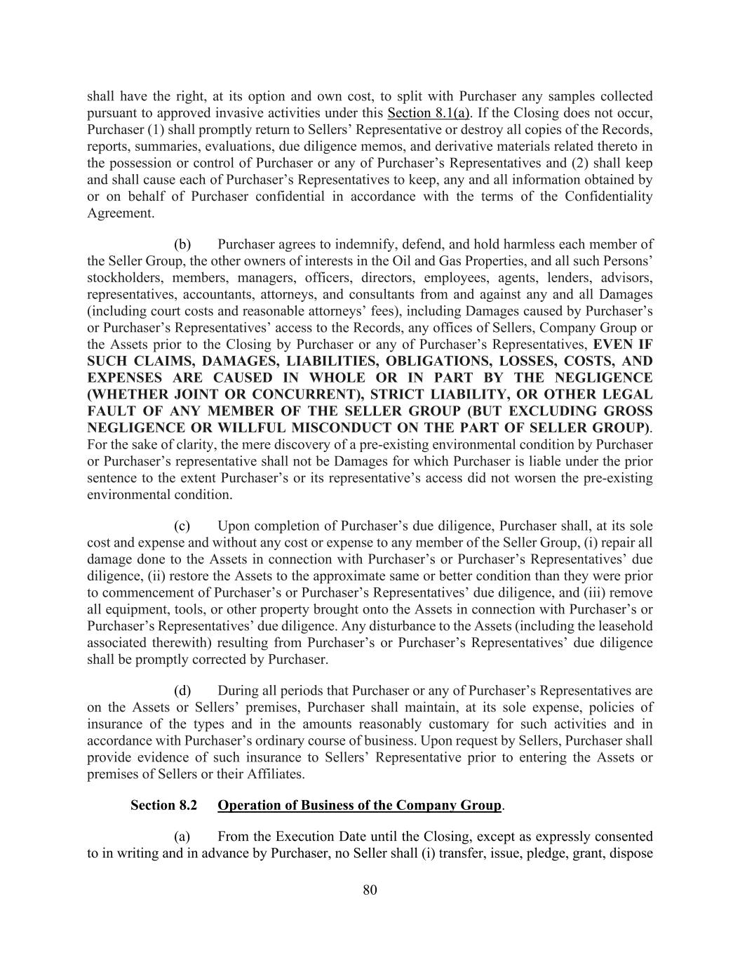 80 shall have the right, at its option and own cost, to split with Purchaser any samples collected pursuant to approved invasive activities under this Section 8.1(a). If the Closing does not occur, Purchaser (1) shall promptly return to Sellers’ Representative or destroy all copies of the Records, reports, summaries, evaluations, due diligence memos, and derivative materials related thereto in the possession or control of Purchaser or any of Purchaser’s Representatives and (2) shall keep and shall cause each of Purchaser’s Representatives to keep, any and all information obtained by or on behalf of Purchaser confidential in accordance with the terms of the Confidentiality Agreement. (b) Purchaser agrees to indemnify, defend, and hold harmless each member of the Seller Group, the other owners of interests in the Oil and Gas Properties, and all such Persons’ stockholders, members, managers, officers, directors, employees, agents, lenders, advisors, representatives, accountants, attorneys, and consultants from and against any and all Damages (including court costs and reasonable attorneys’ fees), including Damages caused by Purchaser’s or Purchaser’s Representatives’ access to the Records, any offices of Sellers, Company Group or the Assets prior to the Closing by Purchaser or any of Purchaser’s Representatives, EVEN IF SUCH CLAIMS, DAMAGES, LIABILITIES, OBLIGATIONS, LOSSES, COSTS, AND EXPENSES ARE CAUSED IN WHOLE OR IN PART BY THE NEGLIGENCE (WHETHER JOINT OR CONCURRENT), STRICT LIABILITY, OR OTHER LEGAL FAULT OF ANY MEMBER OF THE SELLER GROUP (BUT EXCLUDING GROSS NEGLIGENCE OR WILLFUL MISCONDUCT ON THE PART OF SELLER GROUP). For the sake of clarity, the mere discovery of a pre-existing environmental condition by Purchaser or Purchaser’s representative shall not be Damages for which Purchaser is liable under the prior sentence to the extent Purchaser’s or its representative’s access did not worsen the pre-existing environmental condition. (c) Upon completion of Purchaser’s due diligence, Purchaser shall, at its sole cost and expense and without any cost or expense to any member of the Seller Group, (i) repair all damage done to the Assets in connection with Purchaser’s or Purchaser’s Representatives’ due diligence, (ii) restore the Assets to the approximate same or better condition than they were prior to commencement of Purchaser’s or Purchaser’s Representatives’ due diligence, and (iii) remove all equipment, tools, or other property brought onto the Assets in connection with Purchaser’s or Purchaser’s Representatives’ due diligence. Any disturbance to the Assets (including the leasehold associated therewith) resulting from Purchaser’s or Purchaser’s Representatives’ due diligence shall be promptly corrected by Purchaser. (d) During all periods that Purchaser or any of Purchaser’s Representatives are on the Assets or Sellers’ premises, Purchaser shall maintain, at its sole expense, policies of insurance of the types and in the amounts reasonably customary for such activities and in accordance with Purchaser’s ordinary course of business. Upon request by Sellers, Purchaser shall provide evidence of such insurance to Sellers’ Representative prior to entering the Assets or premises of Sellers or their Affiliates. Section 8.2 Operation of Business of the Company Group. (a) From the Execution Date until the Closing, except as expressly consented to in writing and in advance by Purchaser, no Seller shall (i) transfer, issue, pledge, grant, dispose