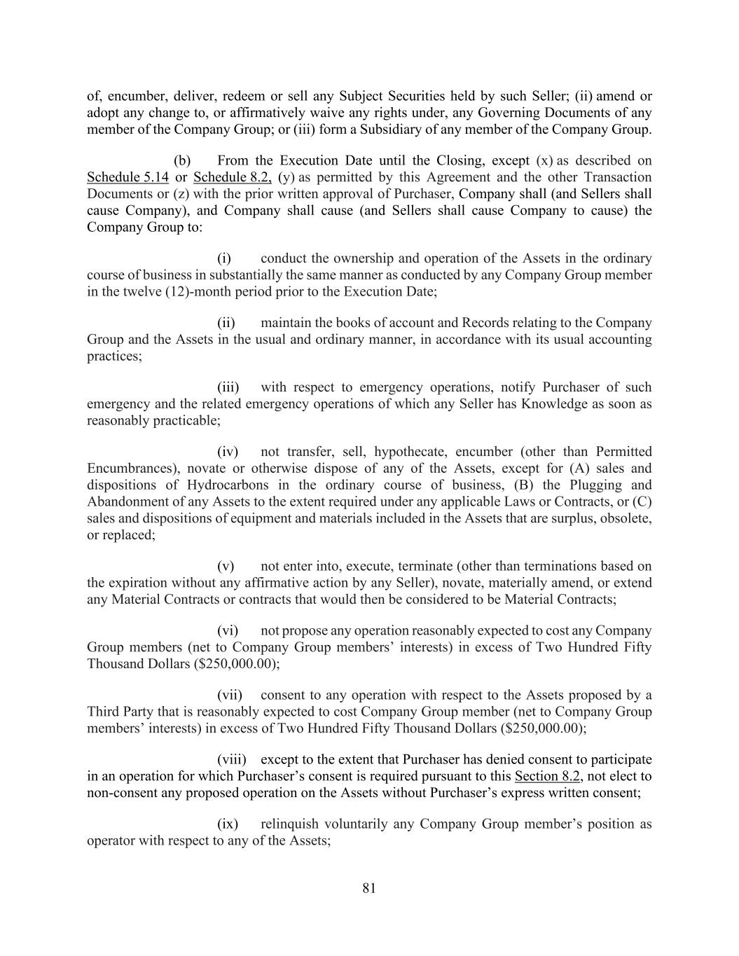 81 of, encumber, deliver, redeem or sell any Subject Securities held by such Seller; (ii) amend or adopt any change to, or affirmatively waive any rights under, any Governing Documents of any member of the Company Group; or (iii) form a Subsidiary of any member of the Company Group. (b) From the Execution Date until the Closing, except (x) as described on Schedule 5.14 or Schedule 8.2, (y) as permitted by this Agreement and the other Transaction Documents or (z) with the prior written approval of Purchaser, Company shall (and Sellers shall cause Company), and Company shall cause (and Sellers shall cause Company to cause) the Company Group to: (i) conduct the ownership and operation of the Assets in the ordinary course of business in substantially the same manner as conducted by any Company Group member in the twelve (12)-month period prior to the Execution Date; (ii) maintain the books of account and Records relating to the Company Group and the Assets in the usual and ordinary manner, in accordance with its usual accounting practices; (iii) with respect to emergency operations, notify Purchaser of such emergency and the related emergency operations of which any Seller has Knowledge as soon as reasonably practicable; (iv) not transfer, sell, hypothecate, encumber (other than Permitted Encumbrances), novate or otherwise dispose of any of the Assets, except for (A) sales and dispositions of Hydrocarbons in the ordinary course of business, (B) the Plugging and Abandonment of any Assets to the extent required under any applicable Laws or Contracts, or (C) sales and dispositions of equipment and materials included in the Assets that are surplus, obsolete, or replaced; (v) not enter into, execute, terminate (other than terminations based on the expiration without any affirmative action by any Seller), novate, materially amend, or extend any Material Contracts or contracts that would then be considered to be Material Contracts; (vi) not propose any operation reasonably expected to cost any Company Group members (net to Company Group members’ interests) in excess of Two Hundred Fifty Thousand Dollars ($250,000.00); (vii) consent to any operation with respect to the Assets proposed by a Third Party that is reasonably expected to cost Company Group member (net to Company Group members’ interests) in excess of Two Hundred Fifty Thousand Dollars ($250,000.00); (viii) except to the extent that Purchaser has denied consent to participate in an operation for which Purchaser’s consent is required pursuant to this Section 8.2, not elect to non-consent any proposed operation on the Assets without Purchaser’s express written consent; (ix) relinquish voluntarily any Company Group member’s position as operator with respect to any of the Assets;