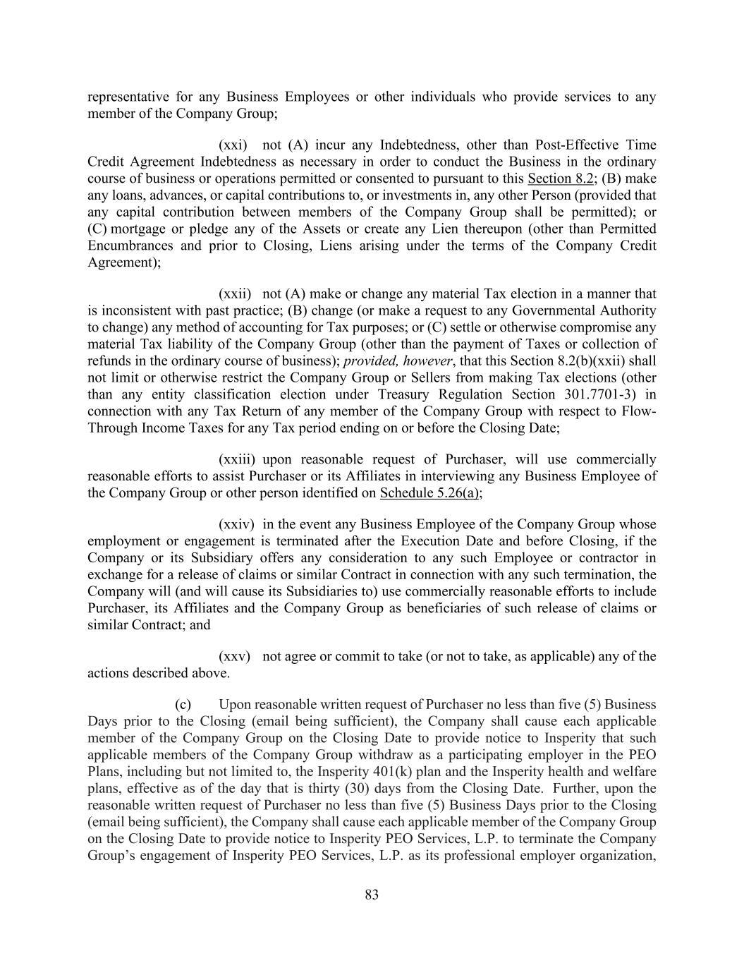 83 representative for any Business Employees or other individuals who provide services to any member of the Company Group; (xxi) not (A) incur any Indebtedness, other than Post-Effective Time Credit Agreement Indebtedness as necessary in order to conduct the Business in the ordinary course of business or operations permitted or consented to pursuant to this Section 8.2; (B) make any loans, advances, or capital contributions to, or investments in, any other Person (provided that any capital contribution between members of the Company Group shall be permitted); or (C) mortgage or pledge any of the Assets or create any Lien thereupon (other than Permitted Encumbrances and prior to Closing, Liens arising under the terms of the Company Credit Agreement); (xxii) not (A) make or change any material Tax election in a manner that is inconsistent with past practice; (B) change (or make a request to any Governmental Authority to change) any method of accounting for Tax purposes; or (C) settle or otherwise compromise any material Tax liability of the Company Group (other than the payment of Taxes or collection of refunds in the ordinary course of business); provided, however, that this Section 8.2(b)(xxii) shall not limit or otherwise restrict the Company Group or Sellers from making Tax elections (other than any entity classification election under Treasury Regulation Section 301.7701-3) in connection with any Tax Return of any member of the Company Group with respect to Flow- Through Income Taxes for any Tax period ending on or before the Closing Date; (xxiii) upon reasonable request of Purchaser, will use commercially reasonable efforts to assist Purchaser or its Affiliates in interviewing any Business Employee of the Company Group or other person identified on Schedule 5.26(a); (xxiv) in the event any Business Employee of the Company Group whose employment or engagement is terminated after the Execution Date and before Closing, if the Company or its Subsidiary offers any consideration to any such Employee or contractor in exchange for a release of claims or similar Contract in connection with any such termination, the Company will (and will cause its Subsidiaries to) use commercially reasonable efforts to include Purchaser, its Affiliates and the Company Group as beneficiaries of such release of claims or similar Contract; and (xxv) not agree or commit to take (or not to take, as applicable) any of the actions described above. (c) Upon reasonable written request of Purchaser no less than five (5) Business Days prior to the Closing (email being sufficient), the Company shall cause each applicable member of the Company Group on the Closing Date to provide notice to Insperity that such applicable members of the Company Group withdraw as a participating employer in the PEO Plans, including but not limited to, the Insperity 401(k) plan and the Insperity health and welfare plans, effective as of the day that is thirty (30) days from the Closing Date. Further, upon the reasonable written request of Purchaser no less than five (5) Business Days prior to the Closing (email being sufficient), the Company shall cause each applicable member of the Company Group on the Closing Date to provide notice to Insperity PEO Services, L.P. to terminate the Company Group’s engagement of Insperity PEO Services, L.P. as its professional employer organization,