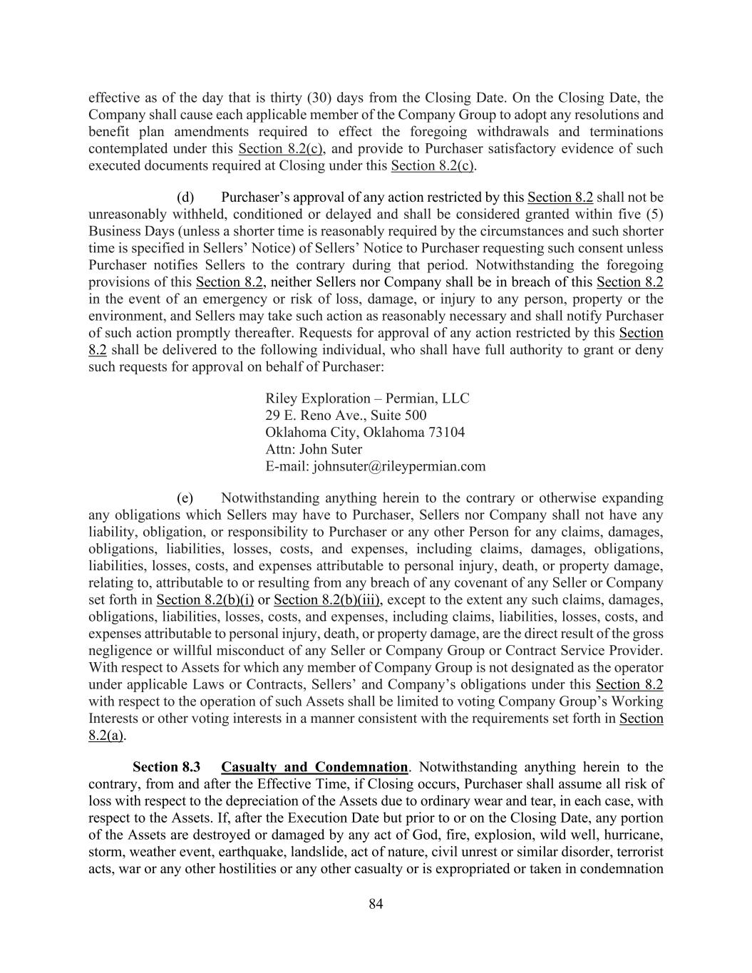 84 effective as of the day that is thirty (30) days from the Closing Date. On the Closing Date, the Company shall cause each applicable member of the Company Group to adopt any resolutions and benefit plan amendments required to effect the foregoing withdrawals and terminations contemplated under this Section 8.2(c), and provide to Purchaser satisfactory evidence of such executed documents required at Closing under this Section 8.2(c). (d) Purchaser’s approval of any action restricted by this Section 8.2 shall not be unreasonably withheld, conditioned or delayed and shall be considered granted within five (5) Business Days (unless a shorter time is reasonably required by the circumstances and such shorter time is specified in Sellers’ Notice) of Sellers’ Notice to Purchaser requesting such consent unless Purchaser notifies Sellers to the contrary during that period. Notwithstanding the foregoing provisions of this Section 8.2, neither Sellers nor Company shall be in breach of this Section 8.2 in the event of an emergency or risk of loss, damage, or injury to any person, property or the environment, and Sellers may take such action as reasonably necessary and shall notify Purchaser of such action promptly thereafter. Requests for approval of any action restricted by this Section 8.2 shall be delivered to the following individual, who shall have full authority to grant or deny such requests for approval on behalf of Purchaser: Riley Exploration – Permian, LLC 29 E. Reno Ave., Suite 500 Oklahoma City, Oklahoma 73104 Attn: John Suter E-mail: johnsuter@rileypermian.com (e) Notwithstanding anything herein to the contrary or otherwise expanding any obligations which Sellers may have to Purchaser, Sellers nor Company shall not have any liability, obligation, or responsibility to Purchaser or any other Person for any claims, damages, obligations, liabilities, losses, costs, and expenses, including claims, damages, obligations, liabilities, losses, costs, and expenses attributable to personal injury, death, or property damage, relating to, attributable to or resulting from any breach of any covenant of any Seller or Company set forth in Section 8.2(b)(i) or Section 8.2(b)(iii), except to the extent any such claims, damages, obligations, liabilities, losses, costs, and expenses, including claims, liabilities, losses, costs, and expenses attributable to personal injury, death, or property damage, are the direct result of the gross negligence or willful misconduct of any Seller or Company Group or Contract Service Provider. With respect to Assets for which any member of Company Group is not designated as the operator under applicable Laws or Contracts, Sellers’ and Company’s obligations under this Section 8.2 with respect to the operation of such Assets shall be limited to voting Company Group’s Working Interests or other voting interests in a manner consistent with the requirements set forth in Section 8.2(a). Section 8.3 Casualty and Condemnation. Notwithstanding anything herein to the contrary, from and after the Effective Time, if Closing occurs, Purchaser shall assume all risk of loss with respect to the depreciation of the Assets due to ordinary wear and tear, in each case, with respect to the Assets. If, after the Execution Date but prior to or on the Closing Date, any portion of the Assets are destroyed or damaged by any act of God, fire, explosion, wild well, hurricane, storm, weather event, earthquake, landslide, act of nature, civil unrest or similar disorder, terrorist acts, war or any other hostilities or any other casualty or is expropriated or taken in condemnation