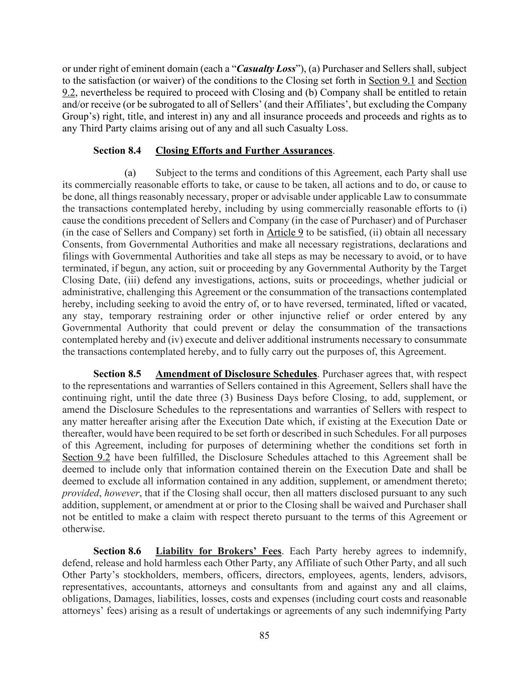 85 or under right of eminent domain (each a “Casualty Loss”), (a) Purchaser and Sellers shall, subject to the satisfaction (or waiver) of the conditions to the Closing set forth in Section 9.1 and Section 9.2, nevertheless be required to proceed with Closing and (b) Company shall be entitled to retain and/or receive (or be subrogated to all of Sellers’ (and their Affiliates’, but excluding the Company Group’s) right, title, and interest in) any and all insurance proceeds and proceeds and rights as to any Third Party claims arising out of any and all such Casualty Loss. Section 8.4 Closing Efforts and Further Assurances. (a) Subject to the terms and conditions of this Agreement, each Party shall use its commercially reasonable efforts to take, or cause to be taken, all actions and to do, or cause to be done, all things reasonably necessary, proper or advisable under applicable Law to consummate the transactions contemplated hereby, including by using commercially reasonable efforts to (i) cause the conditions precedent of Sellers and Company (in the case of Purchaser) and of Purchaser (in the case of Sellers and Company) set forth in Article 9 to be satisfied, (ii) obtain all necessary Consents, from Governmental Authorities and make all necessary registrations, declarations and filings with Governmental Authorities and take all steps as may be necessary to avoid, or to have terminated, if begun, any action, suit or proceeding by any Governmental Authority by the Target Closing Date, (iii) defend any investigations, actions, suits or proceedings, whether judicial or administrative, challenging this Agreement or the consummation of the transactions contemplated hereby, including seeking to avoid the entry of, or to have reversed, terminated, lifted or vacated, any stay, temporary restraining order or other injunctive relief or order entered by any Governmental Authority that could prevent or delay the consummation of the transactions contemplated hereby and (iv) execute and deliver additional instruments necessary to consummate the transactions contemplated hereby, and to fully carry out the purposes of, this Agreement. Section 8.5 Amendment of Disclosure Schedules. Purchaser agrees that, with respect to the representations and warranties of Sellers contained in this Agreement, Sellers shall have the continuing right, until the date three (3) Business Days before Closing, to add, supplement, or amend the Disclosure Schedules to the representations and warranties of Sellers with respect to any matter hereafter arising after the Execution Date which, if existing at the Execution Date or thereafter, would have been required to be set forth or described in such Schedules. For all purposes of this Agreement, including for purposes of determining whether the conditions set forth in Section 9.2 have been fulfilled, the Disclosure Schedules attached to this Agreement shall be deemed to include only that information contained therein on the Execution Date and shall be deemed to exclude all information contained in any addition, supplement, or amendment thereto; provided, however, that if the Closing shall occur, then all matters disclosed pursuant to any such addition, supplement, or amendment at or prior to the Closing shall be waived and Purchaser shall not be entitled to make a claim with respect thereto pursuant to the terms of this Agreement or otherwise. Section 8.6 Liability for Brokers’ Fees. Each Party hereby agrees to indemnify, defend, release and hold harmless each Other Party, any Affiliate of such Other Party, and all such Other Party’s stockholders, members, officers, directors, employees, agents, lenders, advisors, representatives, accountants, attorneys and consultants from and against any and all claims, obligations, Damages, liabilities, losses, costs and expenses (including court costs and reasonable attorneys’ fees) arising as a result of undertakings or agreements of any such indemnifying Party