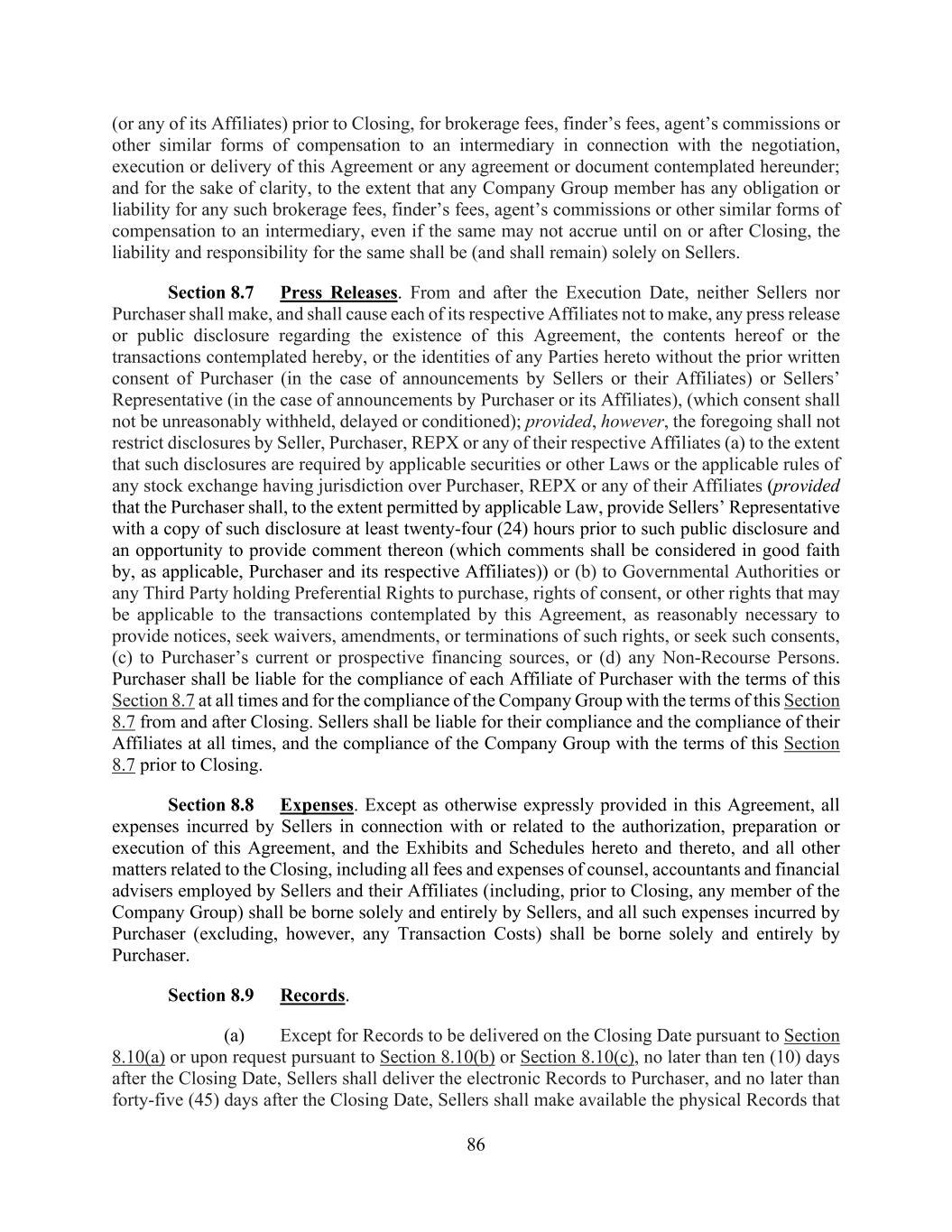 86 (or any of its Affiliates) prior to Closing, for brokerage fees, finder’s fees, agent’s commissions or other similar forms of compensation to an intermediary in connection with the negotiation, execution or delivery of this Agreement or any agreement or document contemplated hereunder; and for the sake of clarity, to the extent that any Company Group member has any obligation or liability for any such brokerage fees, finder’s fees, agent’s commissions or other similar forms of compensation to an intermediary, even if the same may not accrue until on or after Closing, the liability and responsibility for the same shall be (and shall remain) solely on Sellers. Section 8.7 Press Releases. From and after the Execution Date, neither Sellers nor Purchaser shall make, and shall cause each of its respective Affiliates not to make, any press release or public disclosure regarding the existence of this Agreement, the contents hereof or the transactions contemplated hereby, or the identities of any Parties hereto without the prior written consent of Purchaser (in the case of announcements by Sellers or their Affiliates) or Sellers’ Representative (in the case of announcements by Purchaser or its Affiliates), (which consent shall not be unreasonably withheld, delayed or conditioned); provided, however, the foregoing shall not restrict disclosures by Seller, Purchaser, REPX or any of their respective Affiliates (a) to the extent that such disclosures are required by applicable securities or other Laws or the applicable rules of any stock exchange having jurisdiction over Purchaser, REPX or any of their Affiliates (provided that the Purchaser shall, to the extent permitted by applicable Law, provide Sellers’ Representative with a copy of such disclosure at least twenty-four (24) hours prior to such public disclosure and an opportunity to provide comment thereon (which comments shall be considered in good faith by, as applicable, Purchaser and its respective Affiliates)) or (b) to Governmental Authorities or any Third Party holding Preferential Rights to purchase, rights of consent, or other rights that may be applicable to the transactions contemplated by this Agreement, as reasonably necessary to provide notices, seek waivers, amendments, or terminations of such rights, or seek such consents, (c) to Purchaser’s current or prospective financing sources, or (d) any Non-Recourse Persons. Purchaser shall be liable for the compliance of each Affiliate of Purchaser with the terms of this Section 8.7 at all times and for the compliance of the Company Group with the terms of this Section 8.7 from and after Closing. Sellers shall be liable for their compliance and the compliance of their Affiliates at all times, and the compliance of the Company Group with the terms of this Section 8.7 prior to Closing. Section 8.8 Expenses. Except as otherwise expressly provided in this Agreement, all expenses incurred by Sellers in connection with or related to the authorization, preparation or execution of this Agreement, and the Exhibits and Schedules hereto and thereto, and all other matters related to the Closing, including all fees and expenses of counsel, accountants and financial advisers employed by Sellers and their Affiliates (including, prior to Closing, any member of the Company Group) shall be borne solely and entirely by Sellers, and all such expenses incurred by Purchaser (excluding, however, any Transaction Costs) shall be borne solely and entirely by Purchaser. Section 8.9 Records. (a) Except for Records to be delivered on the Closing Date pursuant to Section 8.10(a) or upon request pursuant to Section 8.10(b) or Section 8.10(c), no later than ten (10) days after the Closing Date, Sellers shall deliver the electronic Records to Purchaser, and no later than forty-five (45) days after the Closing Date, Sellers shall make available the physical Records that