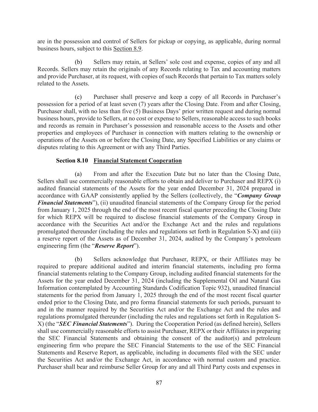 87 are in the possession and control of Sellers for pickup or copying, as applicable, during normal business hours, subject to this Section 8.9. (b) Sellers may retain, at Sellers’ sole cost and expense, copies of any and all Records. Sellers may retain the originals of any Records relating to Tax and accounting matters and provide Purchaser, at its request, with copies of such Records that pertain to Tax matters solely related to the Assets. (c) Purchaser shall preserve and keep a copy of all Records in Purchaser’s possession for a period of at least seven (7) years after the Closing Date. From and after Closing, Purchaser shall, with no less than five (5) Business Days’ prior written request and during normal business hours, provide to Sellers, at no cost or expense to Sellers, reasonable access to such books and records as remain in Purchaser’s possession and reasonable access to the Assets and other properties and employees of Purchaser in connection with matters relating to the ownership or operations of the Assets on or before the Closing Date, any Specified Liabilities or any claims or disputes relating to this Agreement or with any Third Parties. Section 8.10 Financial Statement Cooperation (a) From and after the Execution Date but no later than the Closing Date, Sellers shall use commercially reasonable efforts to obtain and deliver to Purchaser and REPX (i) audited financial statements of the Assets for the year ended December 31, 2024 prepared in accordance with GAAP consistently applied by the Sellers (collectively, the “Company Group Financial Statements”), (ii) unaudited financial statements of the Company Group for the period from January 1, 2025 through the end of the most recent fiscal quarter preceding the Closing Date for which REPX will be required to disclose financial statements of the Company Group in accordance with the Securities Act and/or the Exchange Act and the rules and regulations promulgated thereunder (including the rules and regulations set forth in Regulation S-X) and (iii) a reserve report of the Assets as of December 31, 2024, audited by the Company’s petroleum engineering firm (the “Reserve Report”). (b) Sellers acknowledge that Purchaser, REPX, or their Affiliates may be required to prepare additional audited and interim financial statements, including pro forma financial statements relating to the Company Group, including audited financial statements for the Assets for the year ended December 31, 2024 (including the Supplemental Oil and Natural Gas Information contemplated by Accounting Standards Codification Topic 932), unaudited financial statements for the period from January 1, 2025 through the end of the most recent fiscal quarter ended prior to the Closing Date, and pro forma financial statements for such periods, pursuant to and in the manner required by the Securities Act and/or the Exchange Act and the rules and regulations promulgated thereunder (including the rules and regulations set forth in Regulation S- X) (the “SEC Financial Statements”). During the Cooperation Period (as defined herein), Sellers shall use commercially reasonable efforts to assist Purchaser, REPX or their Affiliates in preparing the SEC Financial Statements and obtaining the consent of the auditor(s) and petroleum engineering firm who prepare the SEC Financial Statements to the use of the SEC Financial Statements and Reserve Report, as applicable, including in documents filed with the SEC under the Securities Act and/or the Exchange Act, in accordance with normal custom and practice. Purchaser shall bear and reimburse Seller Group for any and all Third Party costs and expenses in