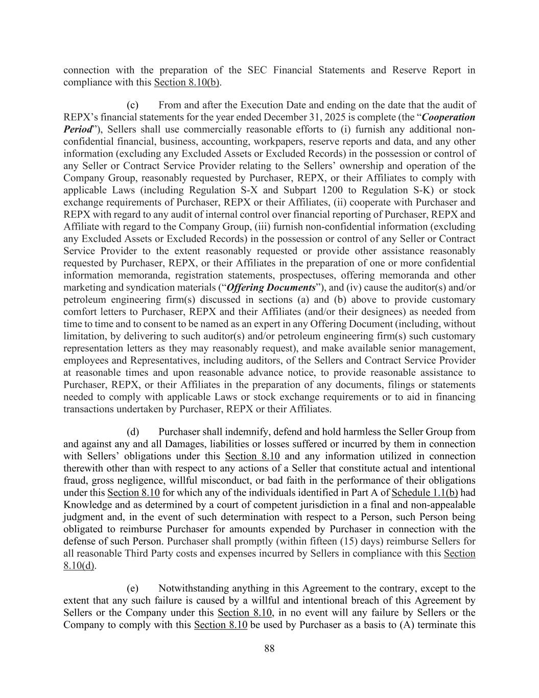 88 connection with the preparation of the SEC Financial Statements and Reserve Report in compliance with this Section 8.10(b). (c) From and after the Execution Date and ending on the date that the audit of REPX’s financial statements for the year ended December 31, 2025 is complete (the “Cooperation Period”), Sellers shall use commercially reasonable efforts to (i) furnish any additional non- confidential financial, business, accounting, workpapers, reserve reports and data, and any other information (excluding any Excluded Assets or Excluded Records) in the possession or control of any Seller or Contract Service Provider relating to the Sellers’ ownership and operation of the Company Group, reasonably requested by Purchaser, REPX, or their Affiliates to comply with applicable Laws (including Regulation S-X and Subpart 1200 to Regulation S-K) or stock exchange requirements of Purchaser, REPX or their Affiliates, (ii) cooperate with Purchaser and REPX with regard to any audit of internal control over financial reporting of Purchaser, REPX and Affiliate with regard to the Company Group, (iii) furnish non-confidential information (excluding any Excluded Assets or Excluded Records) in the possession or control of any Seller or Contract Service Provider to the extent reasonably requested or provide other assistance reasonably requested by Purchaser, REPX, or their Affiliates in the preparation of one or more confidential information memoranda, registration statements, prospectuses, offering memoranda and other marketing and syndication materials (“Offering Documents”), and (iv) cause the auditor(s) and/or petroleum engineering firm(s) discussed in sections (a) and (b) above to provide customary comfort letters to Purchaser, REPX and their Affiliates (and/or their designees) as needed from time to time and to consent to be named as an expert in any Offering Document (including, without limitation, by delivering to such auditor(s) and/or petroleum engineering firm(s) such customary representation letters as they may reasonably request), and make available senior management, employees and Representatives, including auditors, of the Sellers and Contract Service Provider at reasonable times and upon reasonable advance notice, to provide reasonable assistance to Purchaser, REPX, or their Affiliates in the preparation of any documents, filings or statements needed to comply with applicable Laws or stock exchange requirements or to aid in financing transactions undertaken by Purchaser, REPX or their Affiliates. (d) Purchaser shall indemnify, defend and hold harmless the Seller Group from and against any and all Damages, liabilities or losses suffered or incurred by them in connection with Sellers’ obligations under this Section 8.10 and any information utilized in connection therewith other than with respect to any actions of a Seller that constitute actual and intentional fraud, gross negligence, willful misconduct, or bad faith in the performance of their obligations under this Section 8.10 for which any of the individuals identified in Part A of Schedule 1.1(b) had Knowledge and as determined by a court of competent jurisdiction in a final and non-appealable judgment and, in the event of such determination with respect to a Person, such Person being obligated to reimburse Purchaser for amounts expended by Purchaser in connection with the defense of such Person. Purchaser shall promptly (within fifteen (15) days) reimburse Sellers for all reasonable Third Party costs and expenses incurred by Sellers in compliance with this Section 8.10(d). (e) Notwithstanding anything in this Agreement to the contrary, except to the extent that any such failure is caused by a willful and intentional breach of this Agreement by Sellers or the Company under this Section 8.10, in no event will any failure by Sellers or the Company to comply with this Section 8.10 be used by Purchaser as a basis to (A) terminate this