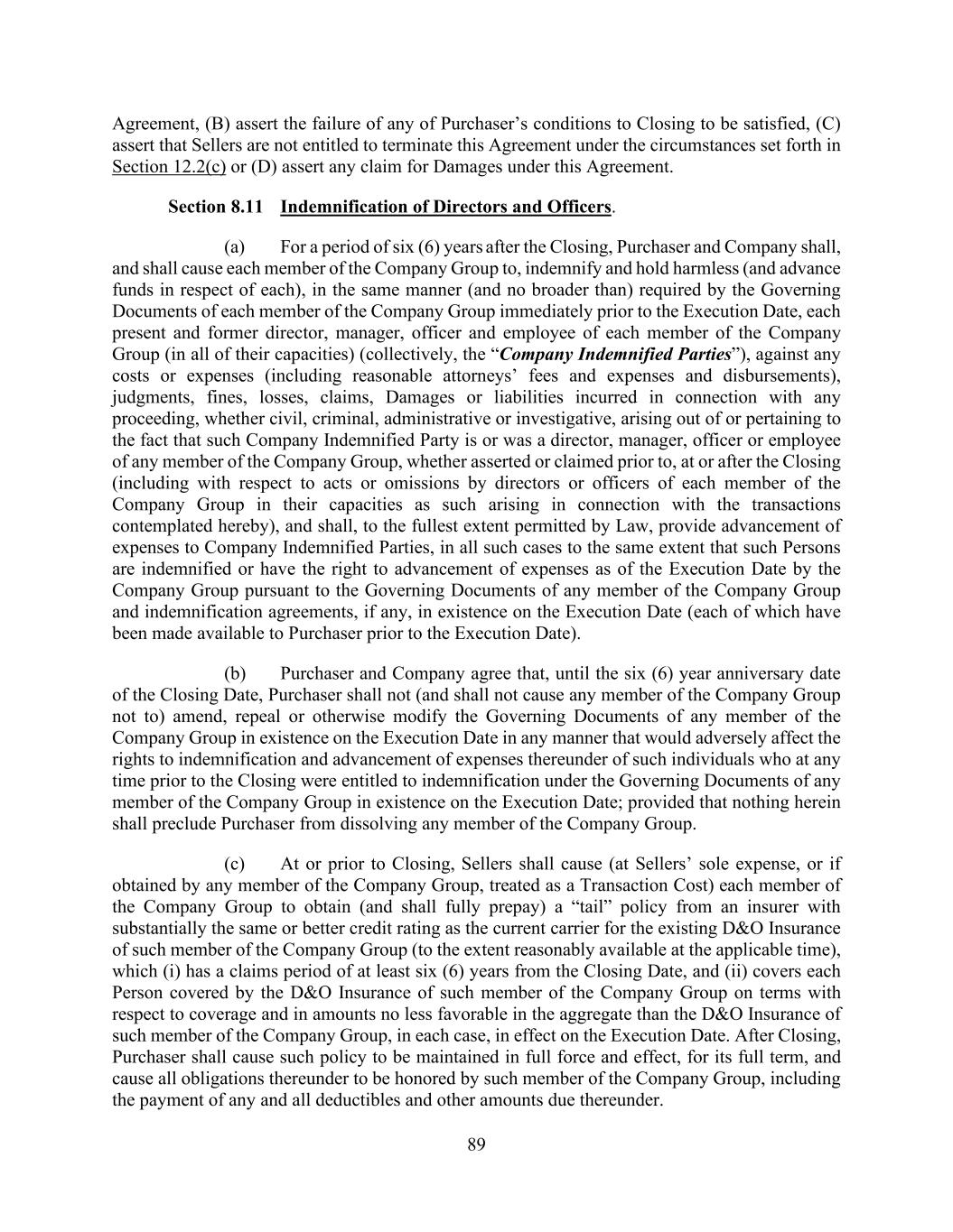 89 Agreement, (B) assert the failure of any of Purchaser’s conditions to Closing to be satisfied, (C) assert that Sellers are not entitled to terminate this Agreement under the circumstances set forth in Section 12.2(c) or (D) assert any claim for Damages under this Agreement. Section 8.11 Indemnification of Directors and Officers. (a) For a period of six (6) years after the Closing, Purchaser and Company shall, and shall cause each member of the Company Group to, indemnify and hold harmless (and advance funds in respect of each), in the same manner (and no broader than) required by the Governing Documents of each member of the Company Group immediately prior to the Execution Date, each present and former director, manager, officer and employee of each member of the Company Group (in all of their capacities) (collectively, the “Company Indemnified Parties”), against any costs or expenses (including reasonable attorneys’ fees and expenses and disbursements), judgments, fines, losses, claims, Damages or liabilities incurred in connection with any proceeding, whether civil, criminal, administrative or investigative, arising out of or pertaining to the fact that such Company Indemnified Party is or was a director, manager, officer or employee of any member of the Company Group, whether asserted or claimed prior to, at or after the Closing (including with respect to acts or omissions by directors or officers of each member of the Company Group in their capacities as such arising in connection with the transactions contemplated hereby), and shall, to the fullest extent permitted by Law, provide advancement of expenses to Company Indemnified Parties, in all such cases to the same extent that such Persons are indemnified or have the right to advancement of expenses as of the Execution Date by the Company Group pursuant to the Governing Documents of any member of the Company Group and indemnification agreements, if any, in existence on the Execution Date (each of which have been made available to Purchaser prior to the Execution Date). (b) Purchaser and Company agree that, until the six (6) year anniversary date of the Closing Date, Purchaser shall not (and shall not cause any member of the Company Group not to) amend, repeal or otherwise modify the Governing Documents of any member of the Company Group in existence on the Execution Date in any manner that would adversely affect the rights to indemnification and advancement of expenses thereunder of such individuals who at any time prior to the Closing were entitled to indemnification under the Governing Documents of any member of the Company Group in existence on the Execution Date; provided that nothing herein shall preclude Purchaser from dissolving any member of the Company Group. (c) At or prior to Closing, Sellers shall cause (at Sellers’ sole expense, or if obtained by any member of the Company Group, treated as a Transaction Cost) each member of the Company Group to obtain (and shall fully prepay) a “tail” policy from an insurer with substantially the same or better credit rating as the current carrier for the existing D&O Insurance of such member of the Company Group (to the extent reasonably available at the applicable time), which (i) has a claims period of at least six (6) years from the Closing Date, and (ii) covers each Person covered by the D&O Insurance of such member of the Company Group on terms with respect to coverage and in amounts no less favorable in the aggregate than the D&O Insurance of such member of the Company Group, in each case, in effect on the Execution Date. After Closing, Purchaser shall cause such policy to be maintained in full force and effect, for its full term, and cause all obligations thereunder to be honored by such member of the Company Group, including the payment of any and all deductibles and other amounts due thereunder.