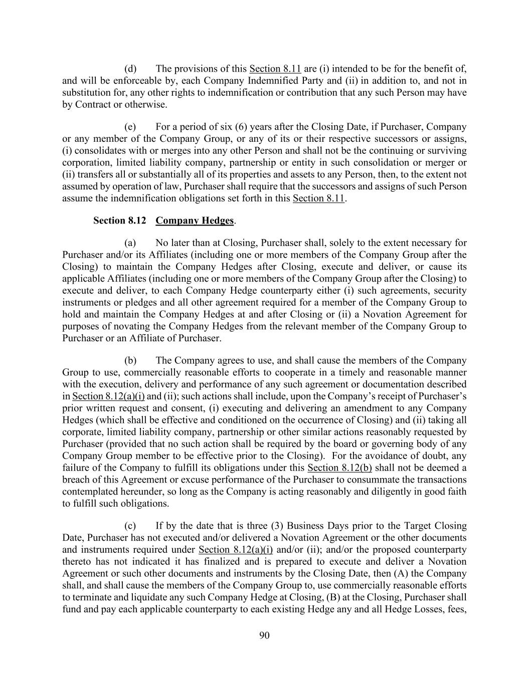 90 (d) The provisions of this Section 8.11 are (i) intended to be for the benefit of, and will be enforceable by, each Company Indemnified Party and (ii) in addition to, and not in substitution for, any other rights to indemnification or contribution that any such Person may have by Contract or otherwise. (e) For a period of six (6) years after the Closing Date, if Purchaser, Company or any member of the Company Group, or any of its or their respective successors or assigns, (i) consolidates with or merges into any other Person and shall not be the continuing or surviving corporation, limited liability company, partnership or entity in such consolidation or merger or (ii) transfers all or substantially all of its properties and assets to any Person, then, to the extent not assumed by operation of law, Purchaser shall require that the successors and assigns of such Person assume the indemnification obligations set forth in this Section 8.11. Section 8.12 Company Hedges. (a) No later than at Closing, Purchaser shall, solely to the extent necessary for Purchaser and/or its Affiliates (including one or more members of the Company Group after the Closing) to maintain the Company Hedges after Closing, execute and deliver, or cause its applicable Affiliates (including one or more members of the Company Group after the Closing) to execute and deliver, to each Company Hedge counterparty either (i) such agreements, security instruments or pledges and all other agreement required for a member of the Company Group to hold and maintain the Company Hedges at and after Closing or (ii) a Novation Agreement for purposes of novating the Company Hedges from the relevant member of the Company Group to Purchaser or an Affiliate of Purchaser. (b) The Company agrees to use, and shall cause the members of the Company Group to use, commercially reasonable efforts to cooperate in a timely and reasonable manner with the execution, delivery and performance of any such agreement or documentation described in Section 8.12(a)(i) and (ii); such actions shall include, upon the Company’s receipt of Purchaser’s prior written request and consent, (i) executing and delivering an amendment to any Company Hedges (which shall be effective and conditioned on the occurrence of Closing) and (ii) taking all corporate, limited liability company, partnership or other similar actions reasonably requested by Purchaser (provided that no such action shall be required by the board or governing body of any Company Group member to be effective prior to the Closing). For the avoidance of doubt, any failure of the Company to fulfill its obligations under this Section 8.12(b) shall not be deemed a breach of this Agreement or excuse performance of the Purchaser to consummate the transactions contemplated hereunder, so long as the Company is acting reasonably and diligently in good faith to fulfill such obligations. (c) If by the date that is three (3) Business Days prior to the Target Closing Date, Purchaser has not executed and/or delivered a Novation Agreement or the other documents and instruments required under Section 8.12(a)(i) and/or (ii); and/or the proposed counterparty thereto has not indicated it has finalized and is prepared to execute and deliver a Novation Agreement or such other documents and instruments by the Closing Date, then (A) the Company shall, and shall cause the members of the Company Group to, use commercially reasonable efforts to terminate and liquidate any such Company Hedge at Closing, (B) at the Closing, Purchaser shall fund and pay each applicable counterparty to each existing Hedge any and all Hedge Losses, fees,