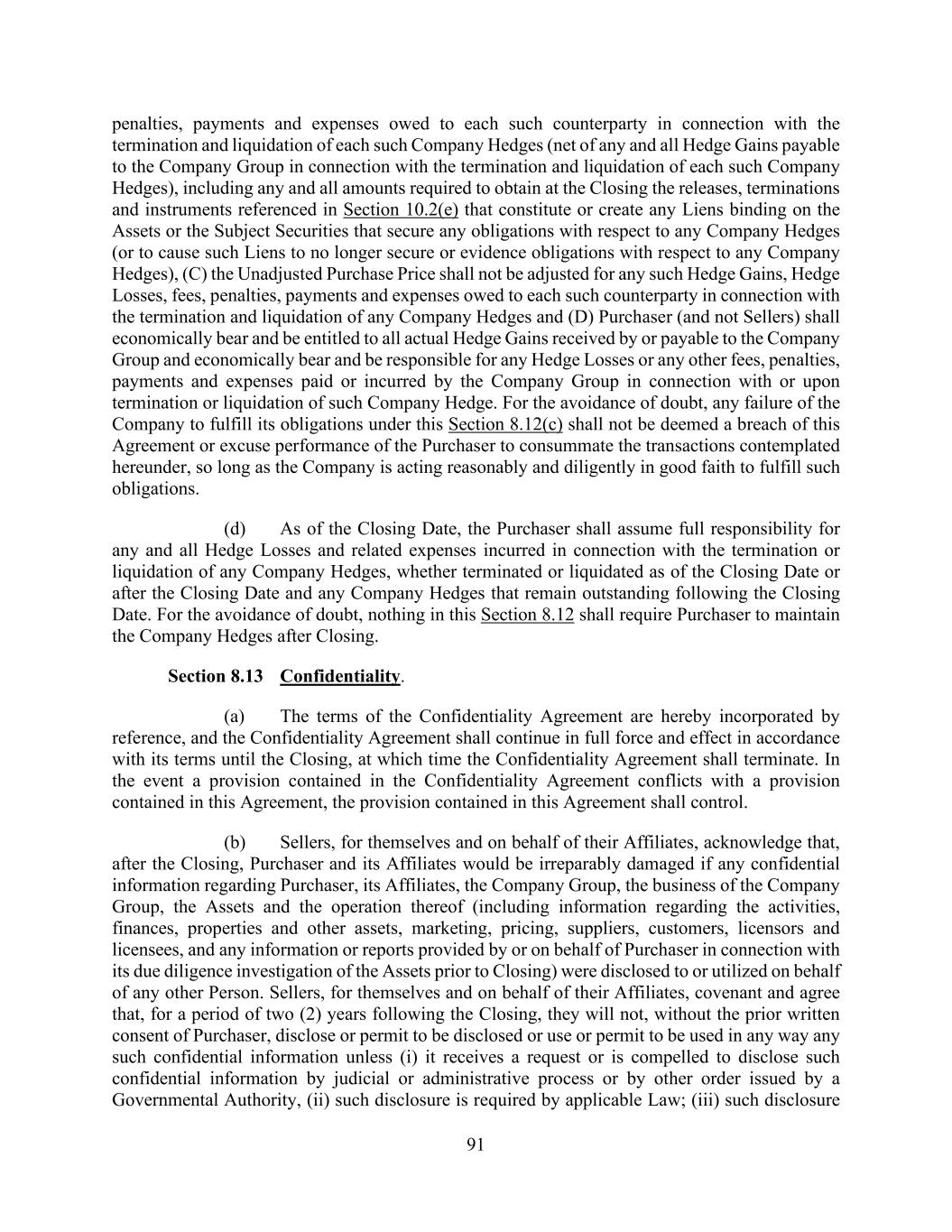 91 penalties, payments and expenses owed to each such counterparty in connection with the termination and liquidation of each such Company Hedges (net of any and all Hedge Gains payable to the Company Group in connection with the termination and liquidation of each such Company Hedges), including any and all amounts required to obtain at the Closing the releases, terminations and instruments referenced in Section 10.2(e) that constitute or create any Liens binding on the Assets or the Subject Securities that secure any obligations with respect to any Company Hedges (or to cause such Liens to no longer secure or evidence obligations with respect to any Company Hedges), (C) the Unadjusted Purchase Price shall not be adjusted for any such Hedge Gains, Hedge Losses, fees, penalties, payments and expenses owed to each such counterparty in connection with the termination and liquidation of any Company Hedges and (D) Purchaser (and not Sellers) shall economically bear and be entitled to all actual Hedge Gains received by or payable to the Company Group and economically bear and be responsible for any Hedge Losses or any other fees, penalties, payments and expenses paid or incurred by the Company Group in connection with or upon termination or liquidation of such Company Hedge. For the avoidance of doubt, any failure of the Company to fulfill its obligations under this Section 8.12(c) shall not be deemed a breach of this Agreement or excuse performance of the Purchaser to consummate the transactions contemplated hereunder, so long as the Company is acting reasonably and diligently in good faith to fulfill such obligations. (d) As of the Closing Date, the Purchaser shall assume full responsibility for any and all Hedge Losses and related expenses incurred in connection with the termination or liquidation of any Company Hedges, whether terminated or liquidated as of the Closing Date or after the Closing Date and any Company Hedges that remain outstanding following the Closing Date. For the avoidance of doubt, nothing in this Section 8.12 shall require Purchaser to maintain the Company Hedges after Closing. Section 8.13 Confidentiality. (a) The terms of the Confidentiality Agreement are hereby incorporated by reference, and the Confidentiality Agreement shall continue in full force and effect in accordance with its terms until the Closing, at which time the Confidentiality Agreement shall terminate. In the event a provision contained in the Confidentiality Agreement conflicts with a provision contained in this Agreement, the provision contained in this Agreement shall control. (b) Sellers, for themselves and on behalf of their Affiliates, acknowledge that, after the Closing, Purchaser and its Affiliates would be irreparably damaged if any confidential information regarding Purchaser, its Affiliates, the Company Group, the business of the Company Group, the Assets and the operation thereof (including information regarding the activities, finances, properties and other assets, marketing, pricing, suppliers, customers, licensors and licensees, and any information or reports provided by or on behalf of Purchaser in connection with its due diligence investigation of the Assets prior to Closing) were disclosed to or utilized on behalf of any other Person. Sellers, for themselves and on behalf of their Affiliates, covenant and agree that, for a period of two (2) years following the Closing, they will not, without the prior written consent of Purchaser, disclose or permit to be disclosed or use or permit to be used in any way any such confidential information unless (i) it receives a request or is compelled to disclose such confidential information by judicial or administrative process or by other order issued by a Governmental Authority, (ii) such disclosure is required by applicable Law; (iii) such disclosure
