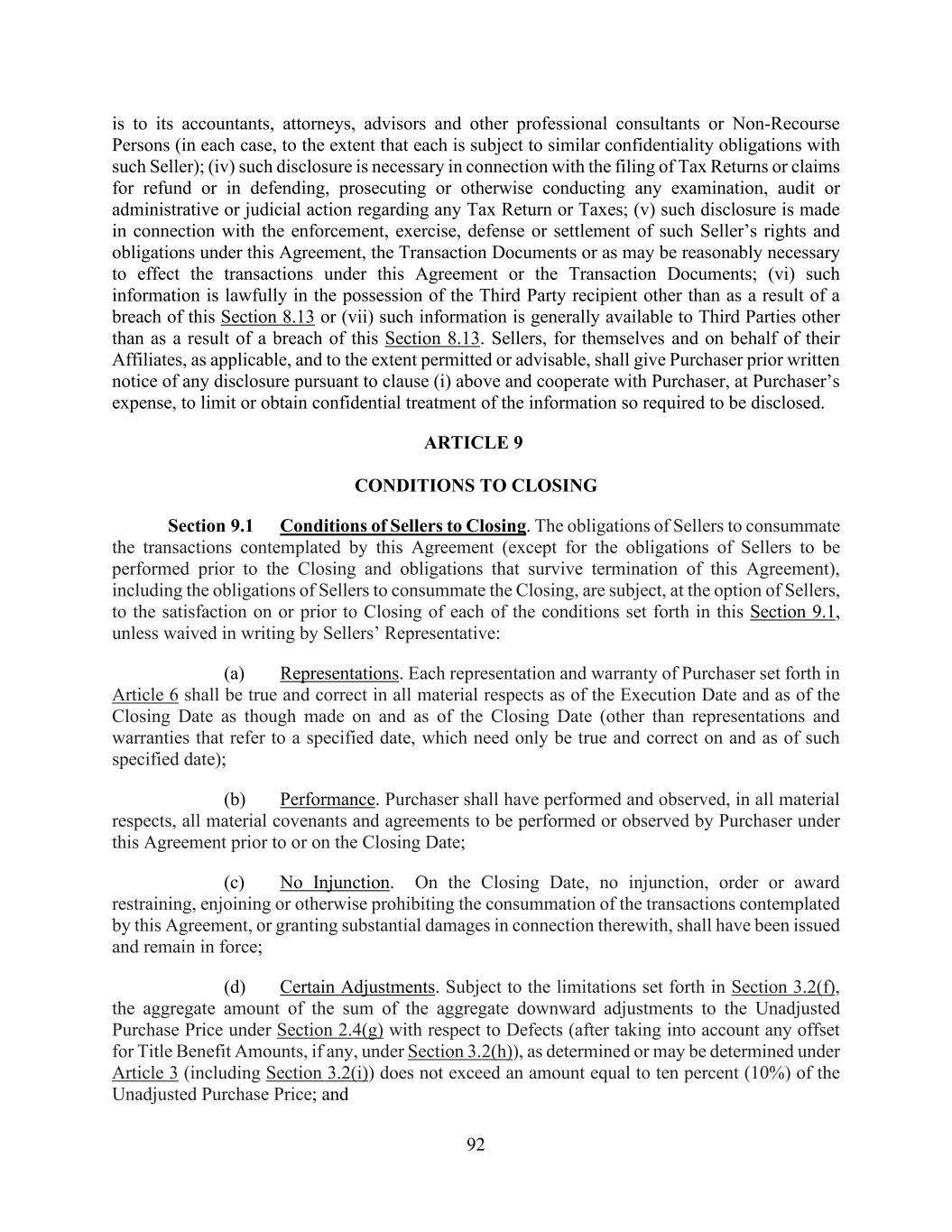 92 is to its accountants, attorneys, advisors and other professional consultants or Non-Recourse Persons (in each case, to the extent that each is subject to similar confidentiality obligations with such Seller); (iv) such disclosure is necessary in connection with the filing of Tax Returns or claims for refund or in defending, prosecuting or otherwise conducting any examination, audit or administrative or judicial action regarding any Tax Return or Taxes; (v) such disclosure is made in connection with the enforcement, exercise, defense or settlement of such Seller’s rights and obligations under this Agreement, the Transaction Documents or as may be reasonably necessary to effect the transactions under this Agreement or the Transaction Documents; (vi) such information is lawfully in the possession of the Third Party recipient other than as a result of a breach of this Section 8.13 or (vii) such information is generally available to Third Parties other than as a result of a breach of this Section 8.13. Sellers, for themselves and on behalf of their Affiliates, as applicable, and to the extent permitted or advisable, shall give Purchaser prior written notice of any disclosure pursuant to clause (i) above and cooperate with Purchaser, at Purchaser’s expense, to limit or obtain confidential treatment of the information so required to be disclosed. ARTICLE 9 CONDITIONS TO CLOSING Section 9.1 Conditions of Sellers to Closing. The obligations of Sellers to consummate the transactions contemplated by this Agreement (except for the obligations of Sellers to be performed prior to the Closing and obligations that survive termination of this Agreement), including the obligations of Sellers to consummate the Closing, are subject, at the option of Sellers, to the satisfaction on or prior to Closing of each of the conditions set forth in this Section 9.1, unless waived in writing by Sellers’ Representative: (a) Representations. Each representation and warranty of Purchaser set forth in Article 6 shall be true and correct in all material respects as of the Execution Date and as of the Closing Date as though made on and as of the Closing Date (other than representations and warranties that refer to a specified date, which need only be true and correct on and as of such specified date); (b) Performance. Purchaser shall have performed and observed, in all material respects, all material covenants and agreements to be performed or observed by Purchaser under this Agreement prior to or on the Closing Date; (c) No Injunction. On the Closing Date, no injunction, order or award restraining, enjoining or otherwise prohibiting the consummation of the transactions contemplated by this Agreement, or granting substantial damages in connection therewith, shall have been issued and remain in force; (d) Certain Adjustments. Subject to the limitations set forth in Section 3.2(f), the aggregate amount of the sum of the aggregate downward adjustments to the Unadjusted Purchase Price under Section 2.4(g) with respect to Defects (after taking into account any offset for Title Benefit Amounts, if any, under Section 3.2(h)), as determined or may be determined under Article 3 (including Section 3.2(i)) does not exceed an amount equal to ten percent (10%) of the Unadjusted Purchase Price; and