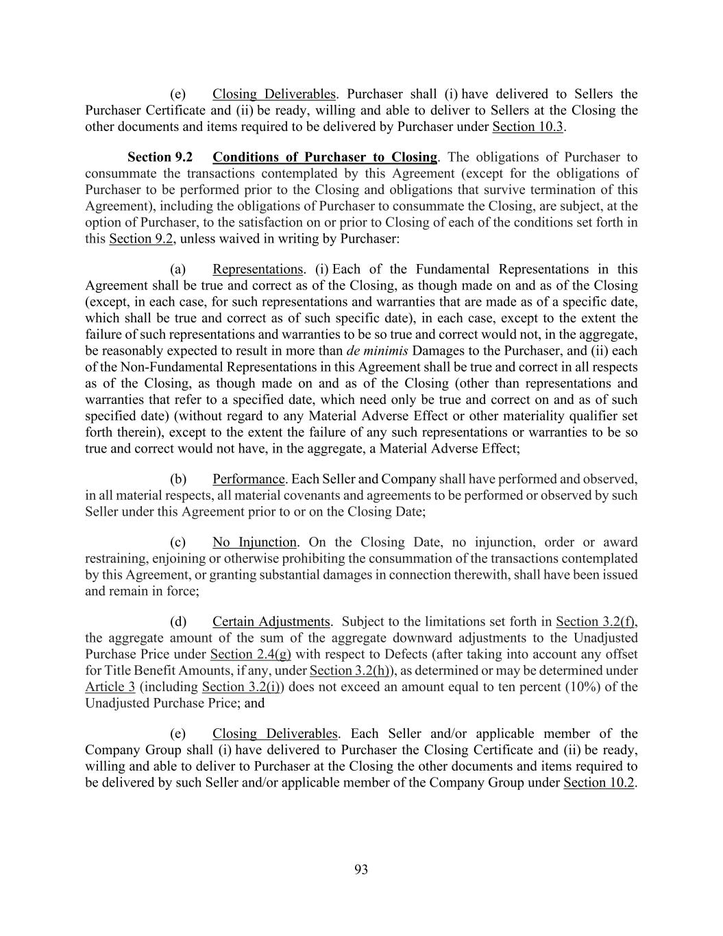 93 (e) Closing Deliverables. Purchaser shall (i) have delivered to Sellers the Purchaser Certificate and (ii) be ready, willing and able to deliver to Sellers at the Closing the other documents and items required to be delivered by Purchaser under Section 10.3. Section 9.2 Conditions of Purchaser to Closing. The obligations of Purchaser to consummate the transactions contemplated by this Agreement (except for the obligations of Purchaser to be performed prior to the Closing and obligations that survive termination of this Agreement), including the obligations of Purchaser to consummate the Closing, are subject, at the option of Purchaser, to the satisfaction on or prior to Closing of each of the conditions set forth in this Section 9.2, unless waived in writing by Purchaser: (a) Representations. (i) Each of the Fundamental Representations in this Agreement shall be true and correct as of the Closing, as though made on and as of the Closing (except, in each case, for such representations and warranties that are made as of a specific date, which shall be true and correct as of such specific date), in each case, except to the extent the failure of such representations and warranties to be so true and correct would not, in the aggregate, be reasonably expected to result in more than de minimis Damages to the Purchaser, and (ii) each of the Non-Fundamental Representations in this Agreement shall be true and correct in all respects as of the Closing, as though made on and as of the Closing (other than representations and warranties that refer to a specified date, which need only be true and correct on and as of such specified date) (without regard to any Material Adverse Effect or other materiality qualifier set forth therein), except to the extent the failure of any such representations or warranties to be so true and correct would not have, in the aggregate, a Material Adverse Effect; (b) Performance. Each Seller and Company shall have performed and observed, in all material respects, all material covenants and agreements to be performed or observed by such Seller under this Agreement prior to or on the Closing Date; (c) No Injunction. On the Closing Date, no injunction, order or award restraining, enjoining or otherwise prohibiting the consummation of the transactions contemplated by this Agreement, or granting substantial damages in connection therewith, shall have been issued and remain in force; (d) Certain Adjustments. Subject to the limitations set forth in Section 3.2(f), the aggregate amount of the sum of the aggregate downward adjustments to the Unadjusted Purchase Price under Section 2.4(g) with respect to Defects (after taking into account any offset for Title Benefit Amounts, if any, under Section 3.2(h)), as determined or may be determined under Article 3 (including Section 3.2(i)) does not exceed an amount equal to ten percent (10%) of the Unadjusted Purchase Price; and (e) Closing Deliverables. Each Seller and/or applicable member of the Company Group shall (i) have delivered to Purchaser the Closing Certificate and (ii) be ready, willing and able to deliver to Purchaser at the Closing the other documents and items required to be delivered by such Seller and/or applicable member of the Company Group under Section 10.2.